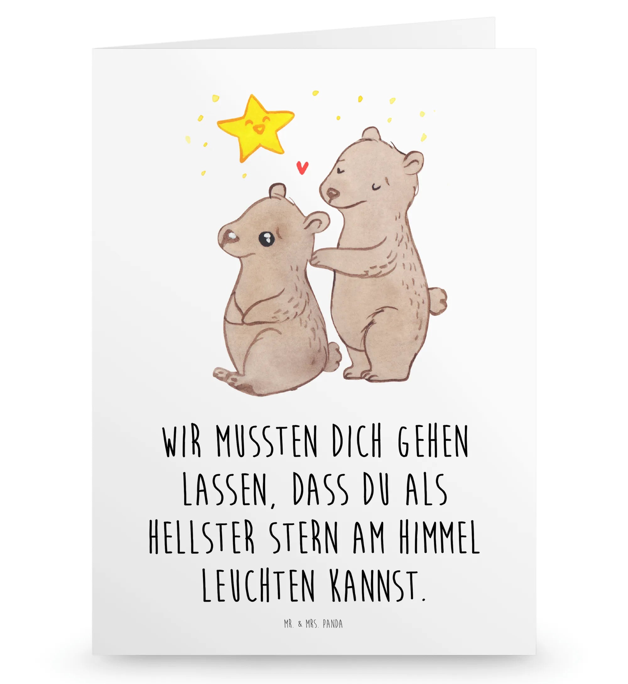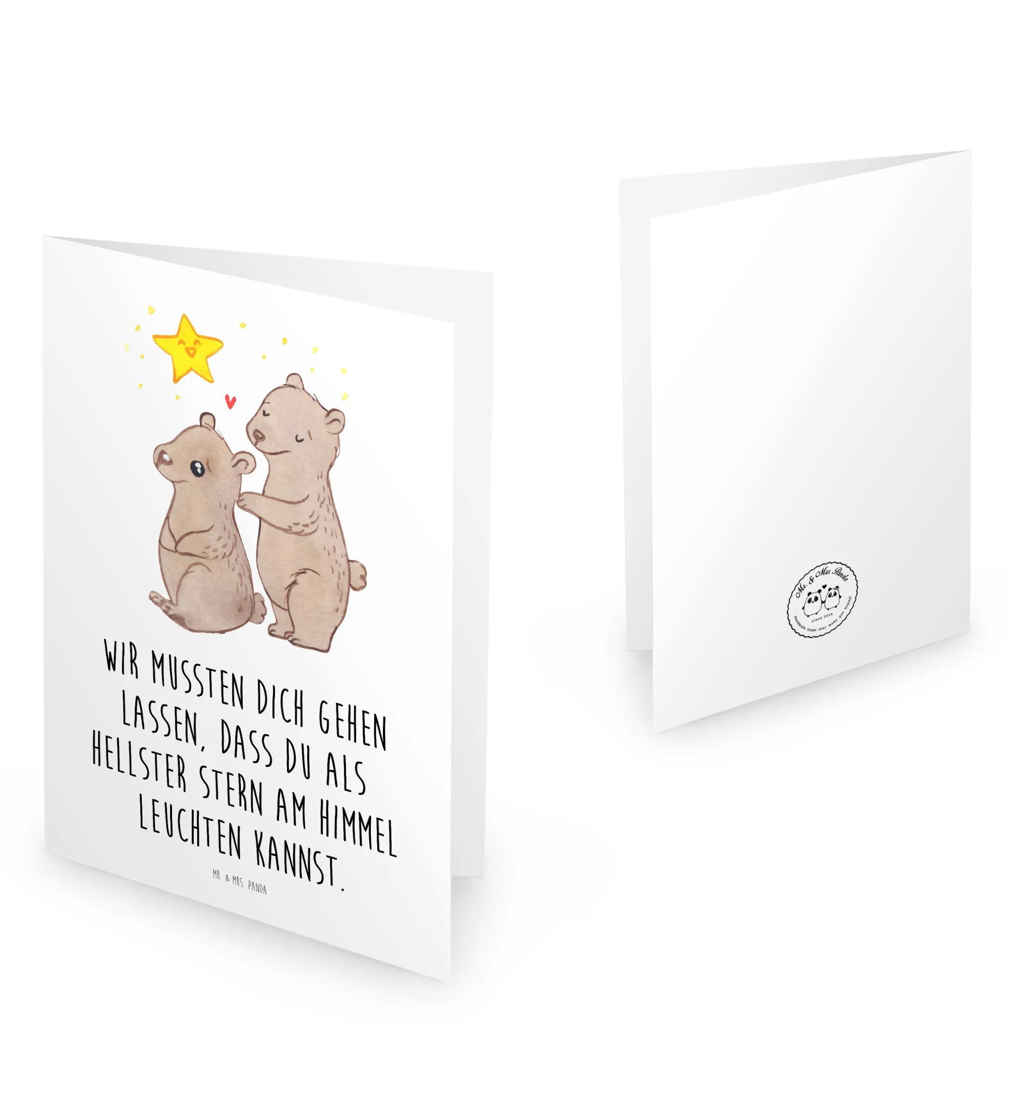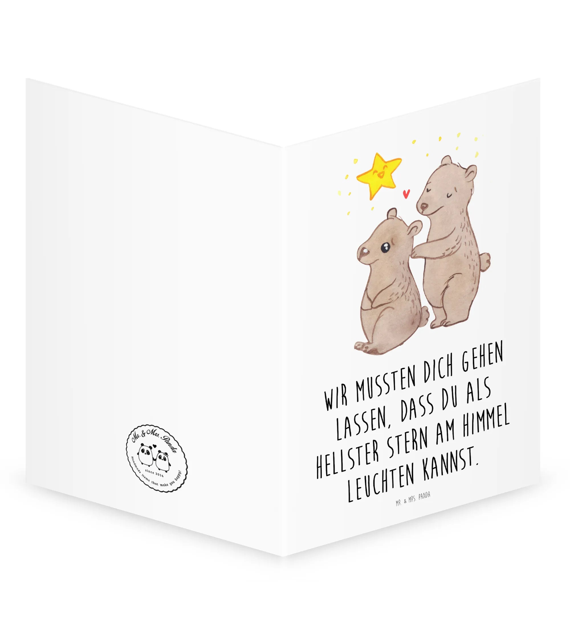 Mit dem schönen Motiv der Bäreneltern, die in der Nacht die Sterne betrachten, wird die tief empfundene Trauer durch die liebevollen Aquarellzeichnungen unterstrichen. Mama Bär schaut traurig zum Himmel, während Papa Bär versucht, sie zu trösten. Dieses Bild, gepaart mit dem berührenden Slogan "Wir mussten dich gehen lassen, dass du als hellster Stern am Himmel leuchten kannst", vermittelt Trost und Hoffnung in dunklen Zeiten.