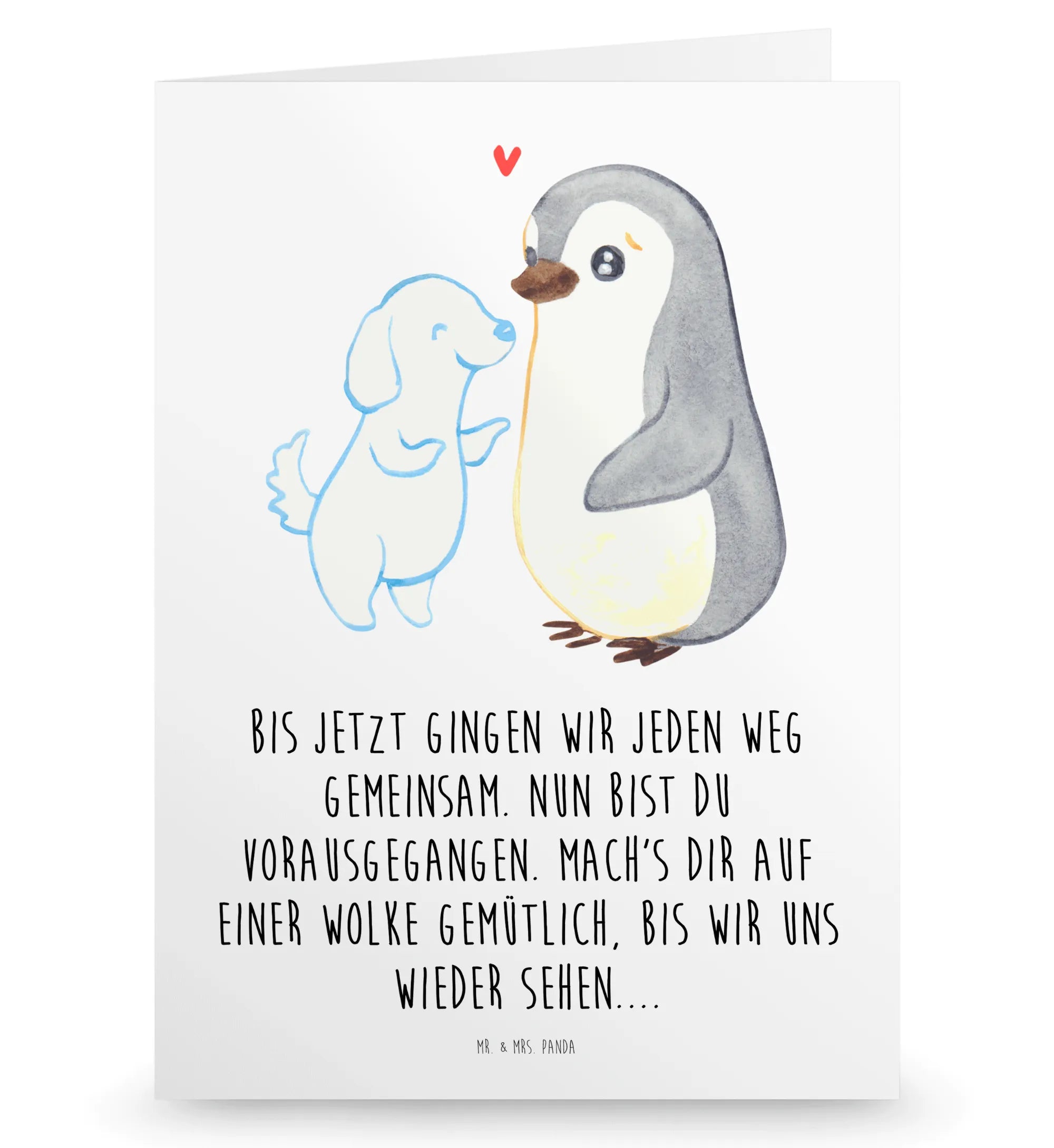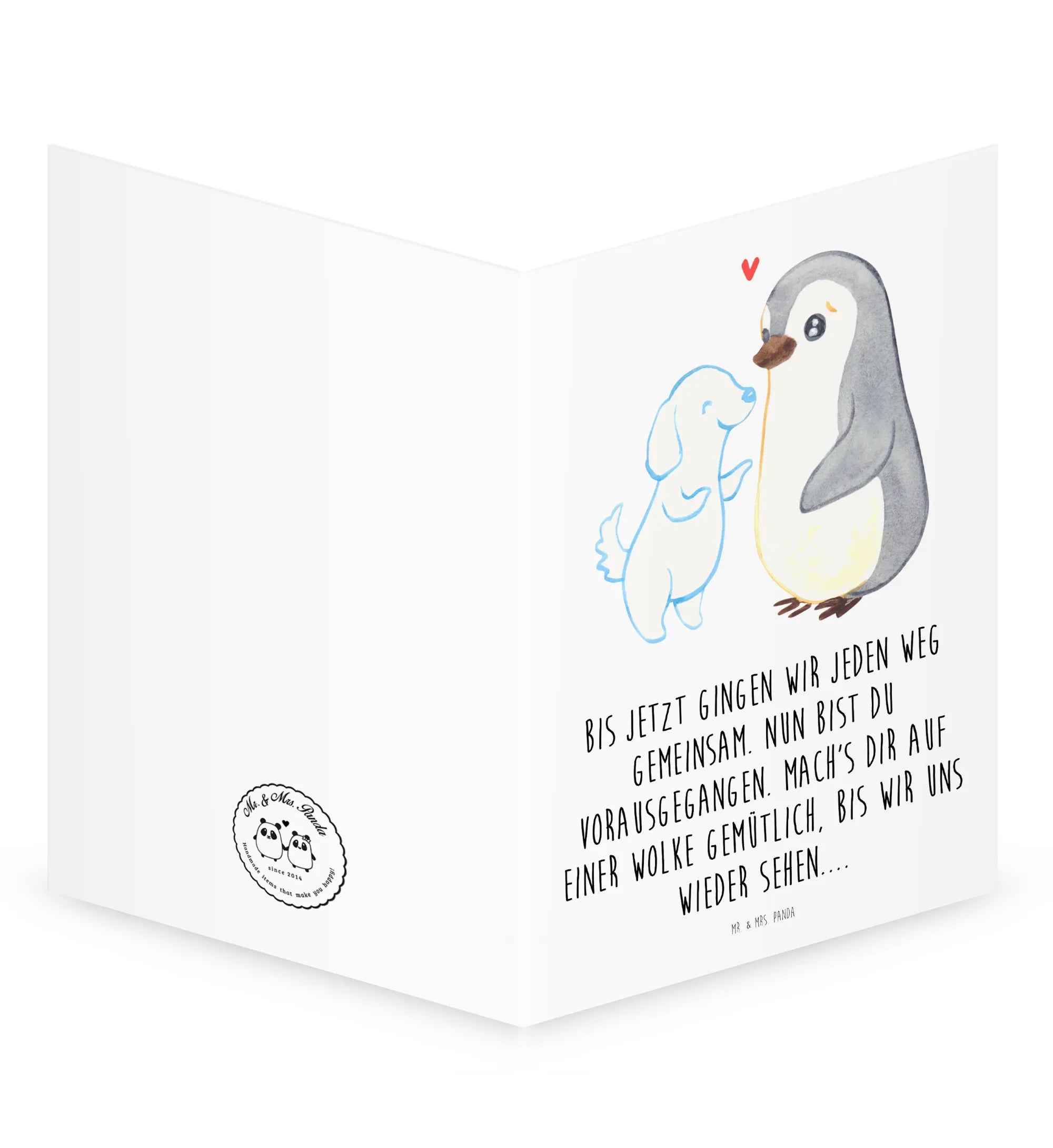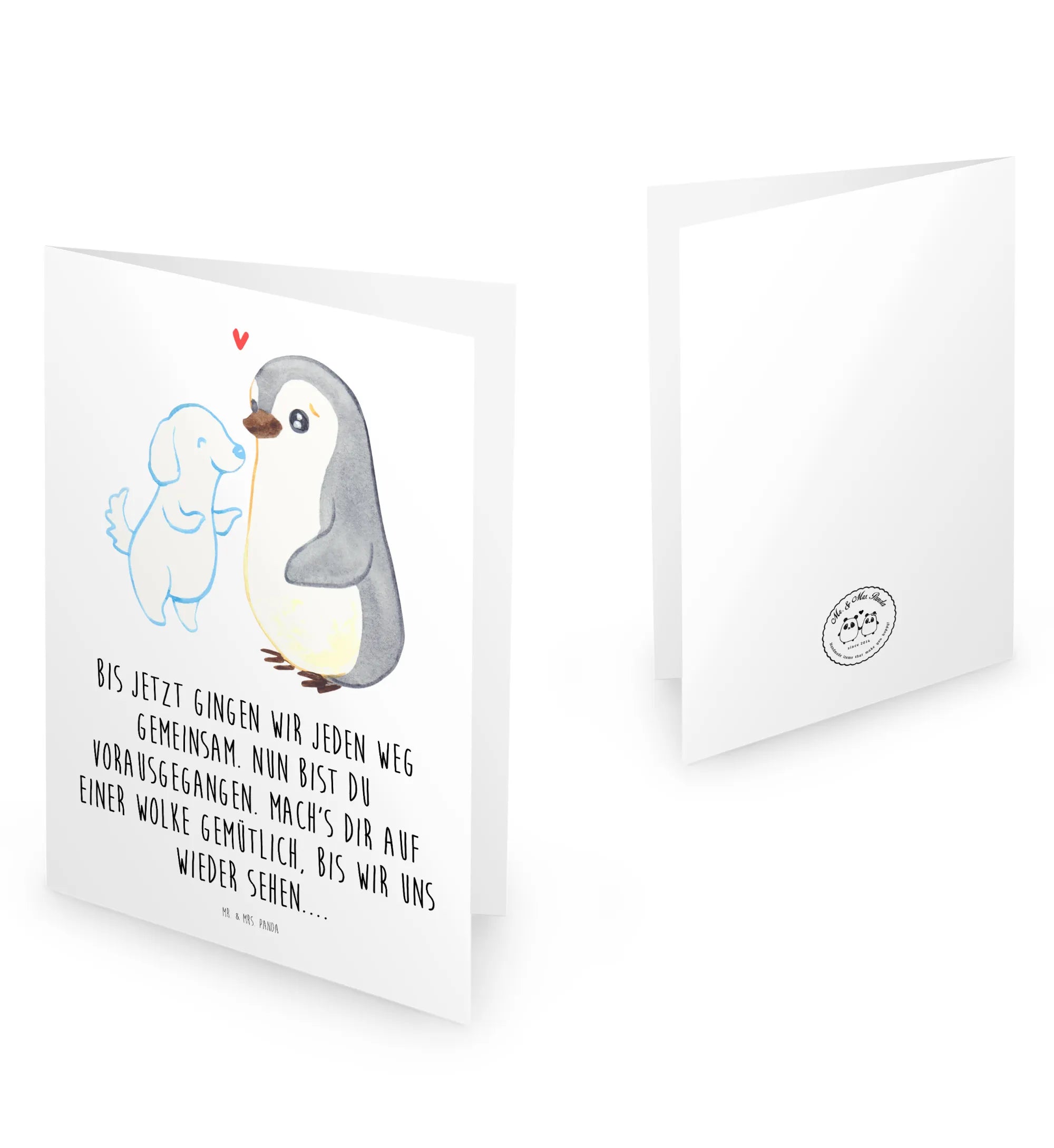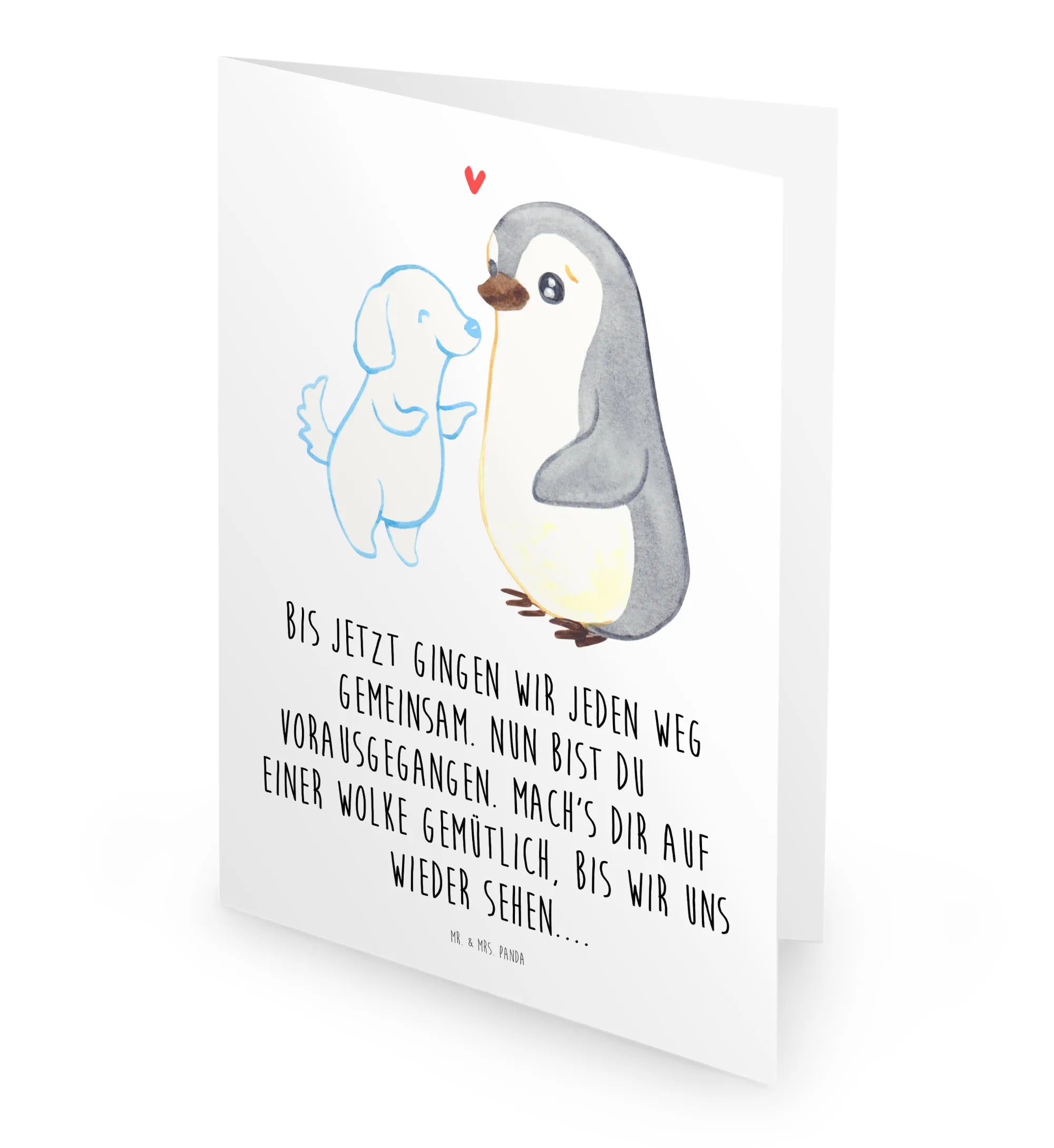 Auf der Vorderseite der Karte findest Du ein liebevoll gezeichnetes Motiv: Ein süßer, trauriger Pinguin, der sehnsüchtig nach seinem verstorbenen Hund blickt. In einer herzlichen Szene, in der ein transparenter Hund als Wolke dargestellt wird, symbolisieren die beiden Charaktere die unendliche Liebe und Verbundenheit, die nie verloren gehen kann. Zwischen ihnen schwebt ein kleines rotes Herz, das den tiefen emotionalen Zusammenhang verstärkt.