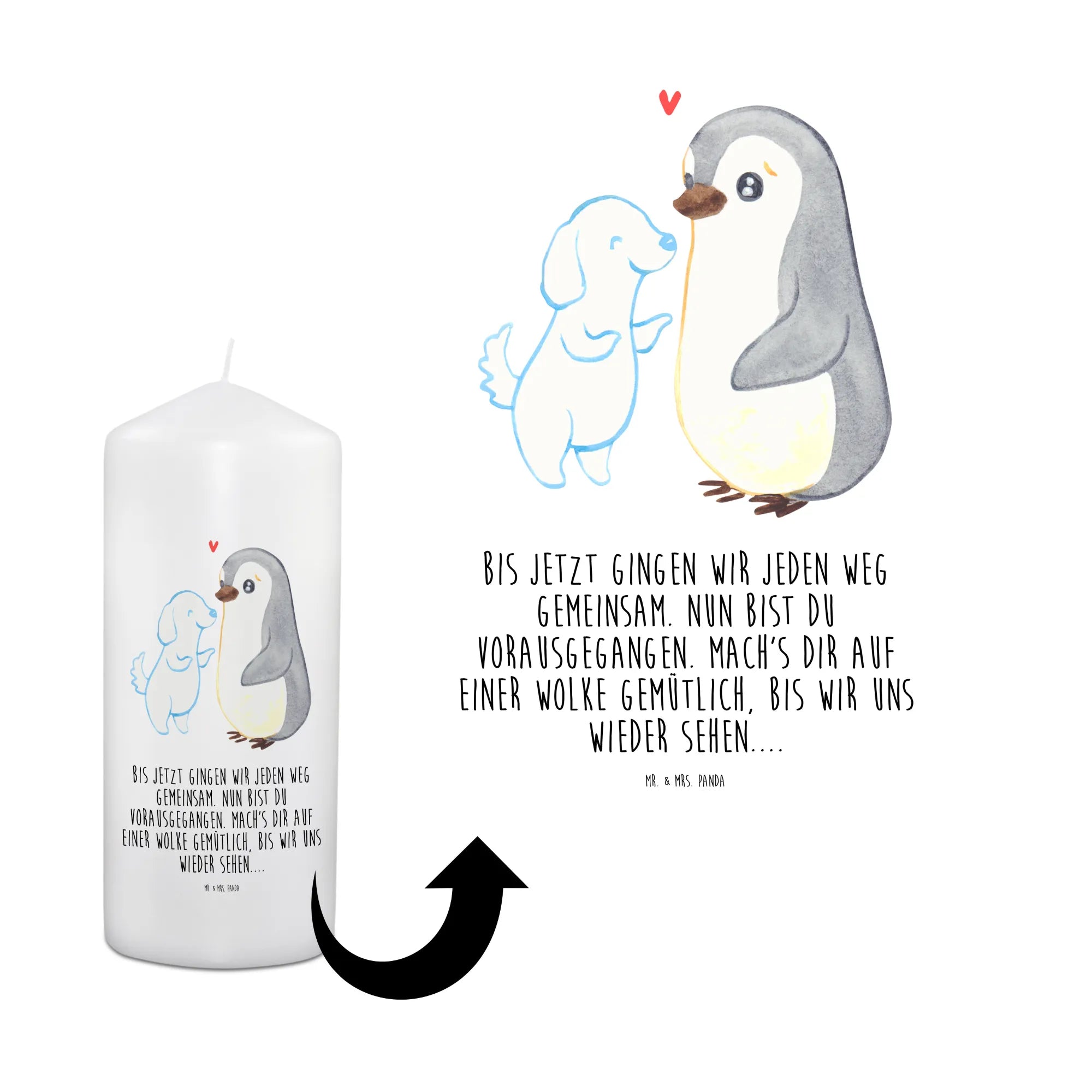 Die Trauerkerze Trauer Hund von Mr. & Mrs. Panda ist der perfekte Begleiter in schweren Zeiten. Wenn ein geliebtes Haustier von uns geht, bleibt oft eine Lücke im Herzen, die man nicht einfach schließen kann. Diese wunderschöne Trauerkerze, liebevoll mit einem Motiv eines süßen, traurigen Pinguins gestaltet, der seinen verstorbenen Hund vermisst, bietet einen einfühlsamen Ausdruck deiner Gefühle. Der Hund, dargestellt in Form einer Wolke, symbolisiert die besondere Verbindung zwischen dir und deinem treuen Begleiter. Mit dem Slogan 'Bis jetzt gingen wir jeden Weg gemeinsam. Nun bist du vorausgegangen. Mach's dir auf einer Wolke gemütlich, bis wir uns wieder sehen...' wird die Kerze zu einem liebevollen Erinnerungsstück und zu einer einladenden Gedenkstätte für all die gemeinsamen Momente.
