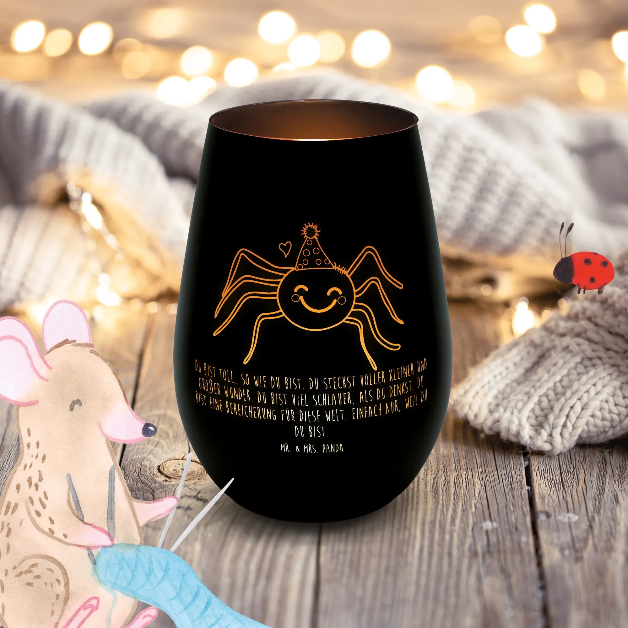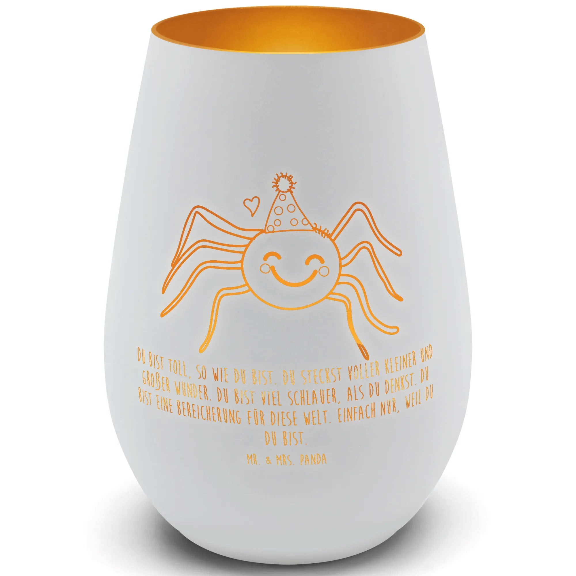 Das Gold Windlicht mit dem bezaubernden Motiv 'Spinne Agathe Party' aus der Spinne Agathe Kollektion ist das perfekte Geschenk für all diejenigen, die die Freude am Leben und die Schönheit der kleinen Wunder schätzen. Es macht sich wunderbar als Geschenk zur Geburt, zur Taufe oder zum Geburtstag und bringt Licht in jede Feier!