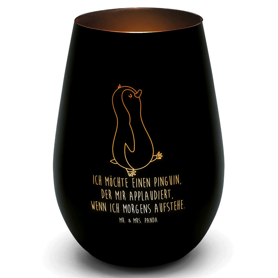 Entdecke unser zauberhaftes Gold Windlicht mit dem lustigen Motiv des marschierenden Pinguins aus der speziellen Pinguin - Kollektion von Mr. & Mrs. Panda. Dieses wunderschöne und edle Windlicht sorgt nicht nur für ein gemütliches Ambiente, sondern bringt auch ein Lächeln auf dein Gesicht, besonders wenn die Kerze flackert und das Licht seinen warmen Schein verströmt.