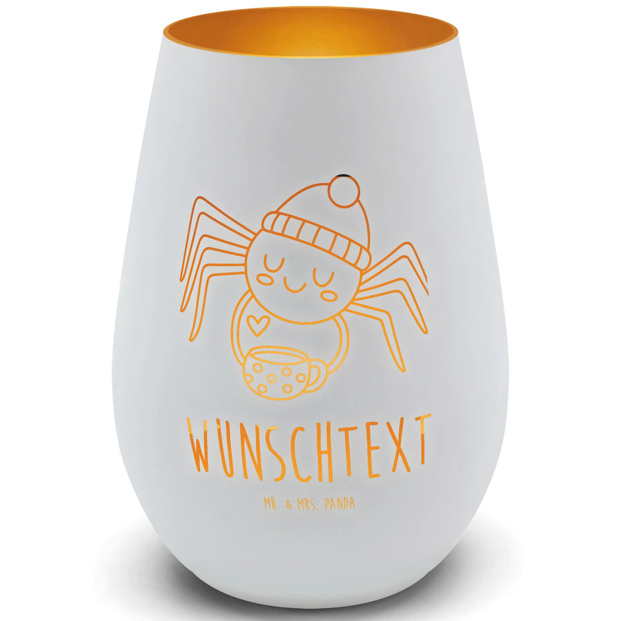 Das personalisierte Gold Windlicht Spinne Agathe Kaffee von Mr. & Mrs. Panda ist das perfekte Geschenk für alle, die die kleinen Dinge im Leben schätzt. Mit einem charmanten Motiv der niedlichen Spinne Agathe, die genüsslich ihren Kaffee schlürft, zaubert dieses Windlicht ein Lächeln in jedes Gesicht.