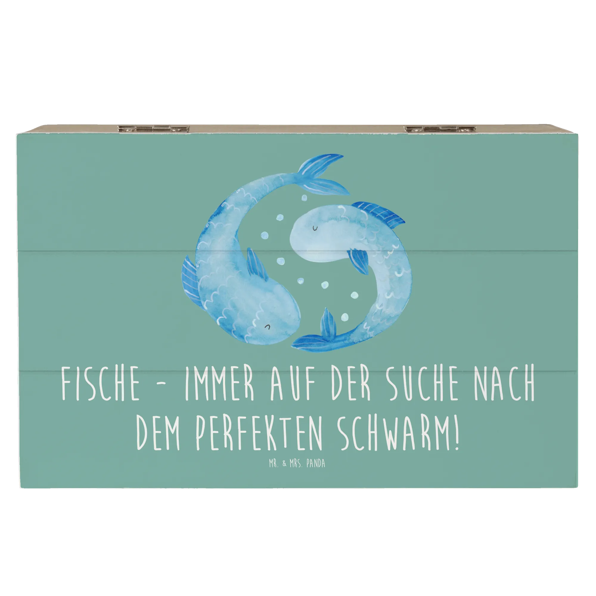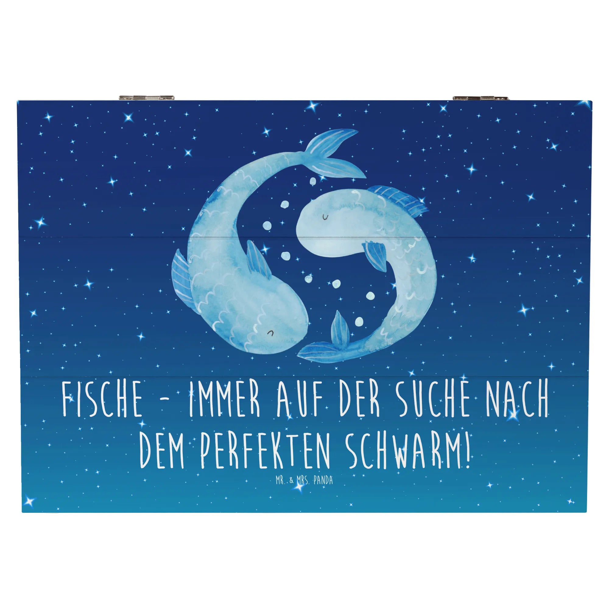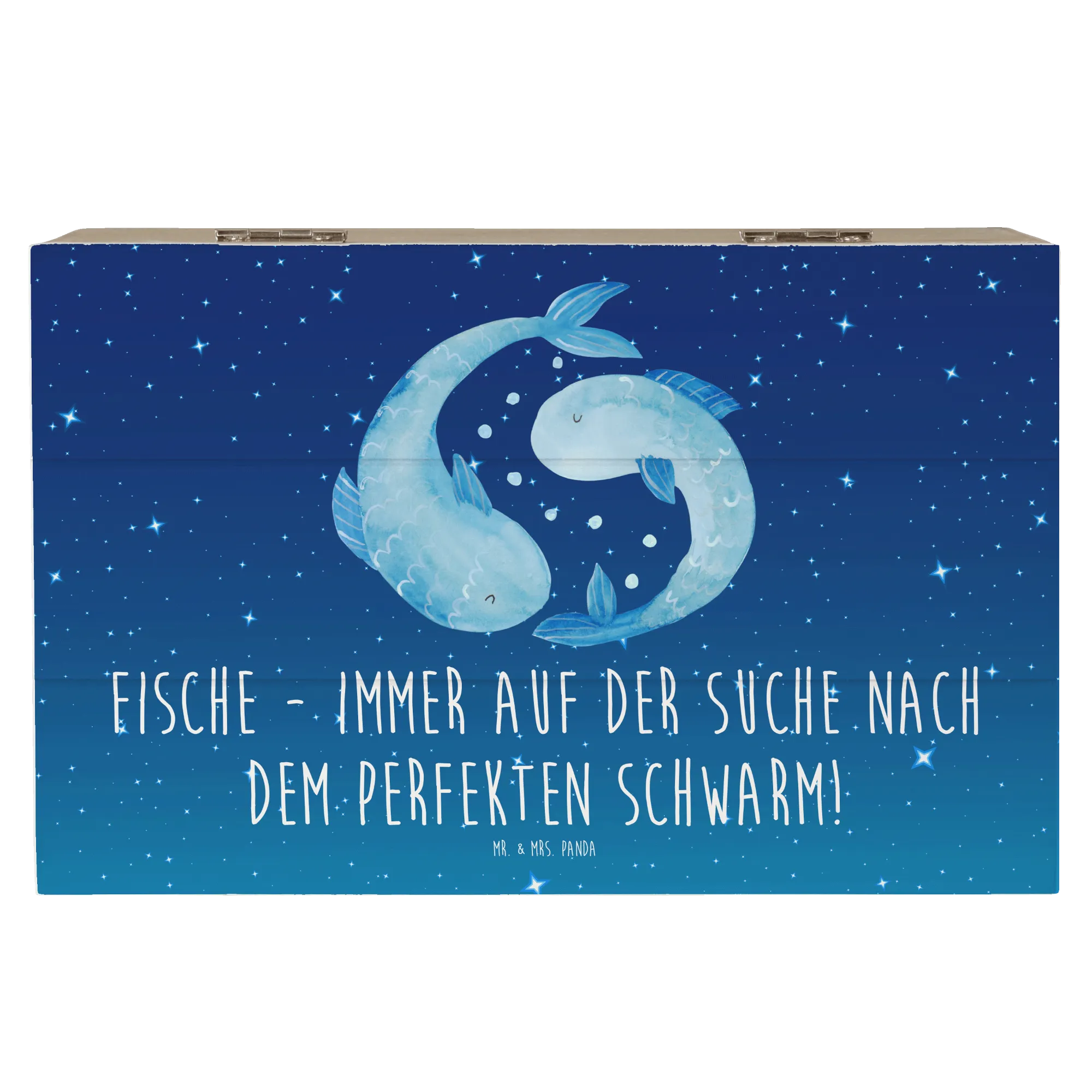 Die wunderschöne Holzkiste "Fische – immer auf der Suche nach dem perfekten Schwarm!" von Mr. & Mrs. Panda ist das ideale Geschenk für alle, die die Magie der Sternzeichen lieben! Mit ihrem liebevollen Design und dem süßen Spruch zieht diese Kiste in jedes Zuhause ein und verleiht jedem Raum eine besondere Note.