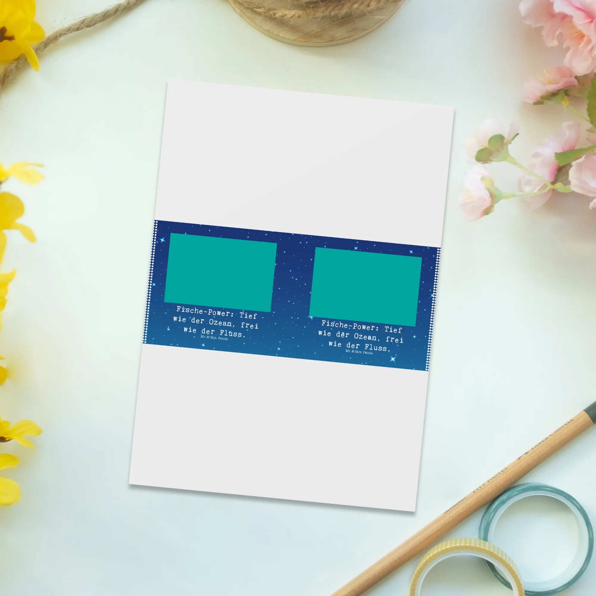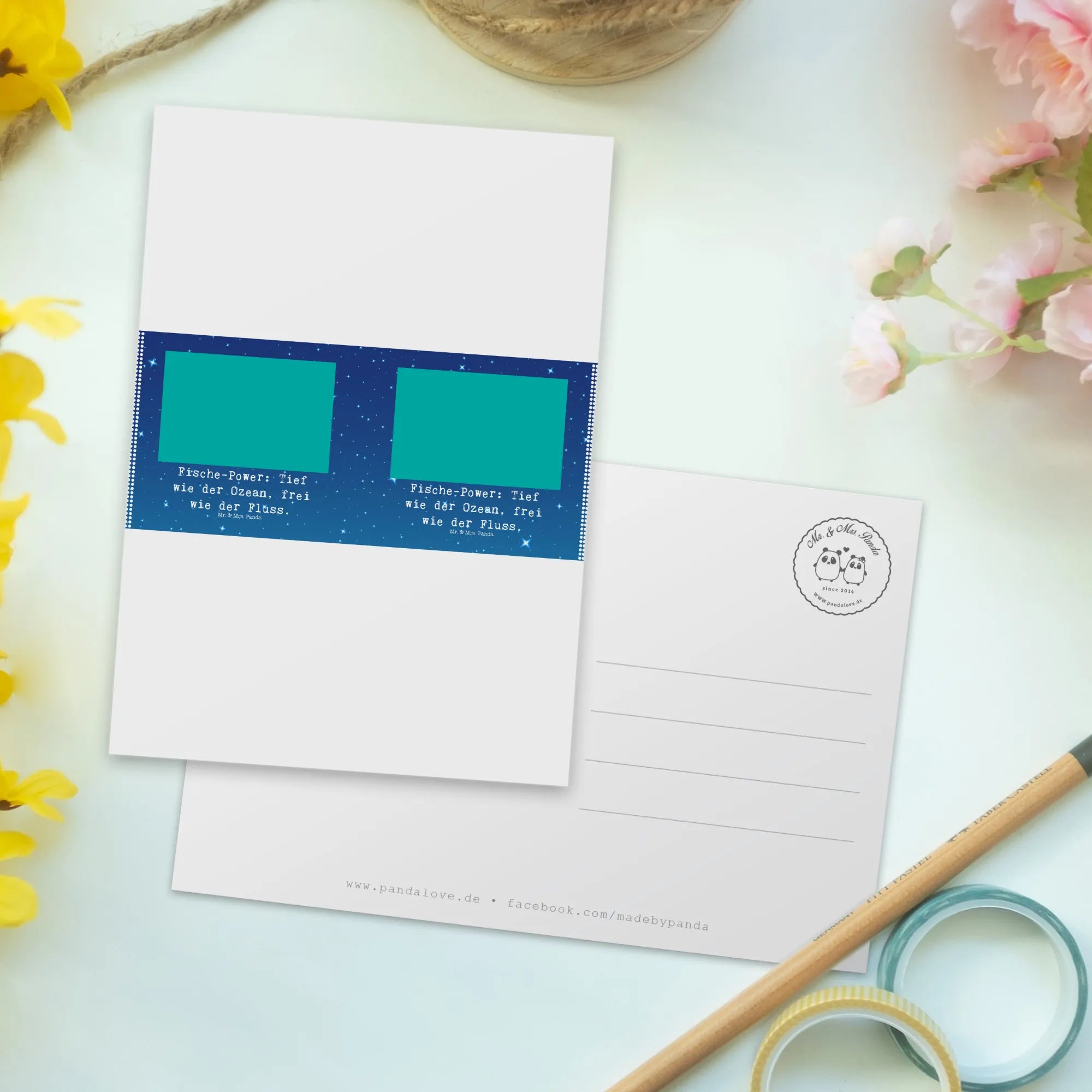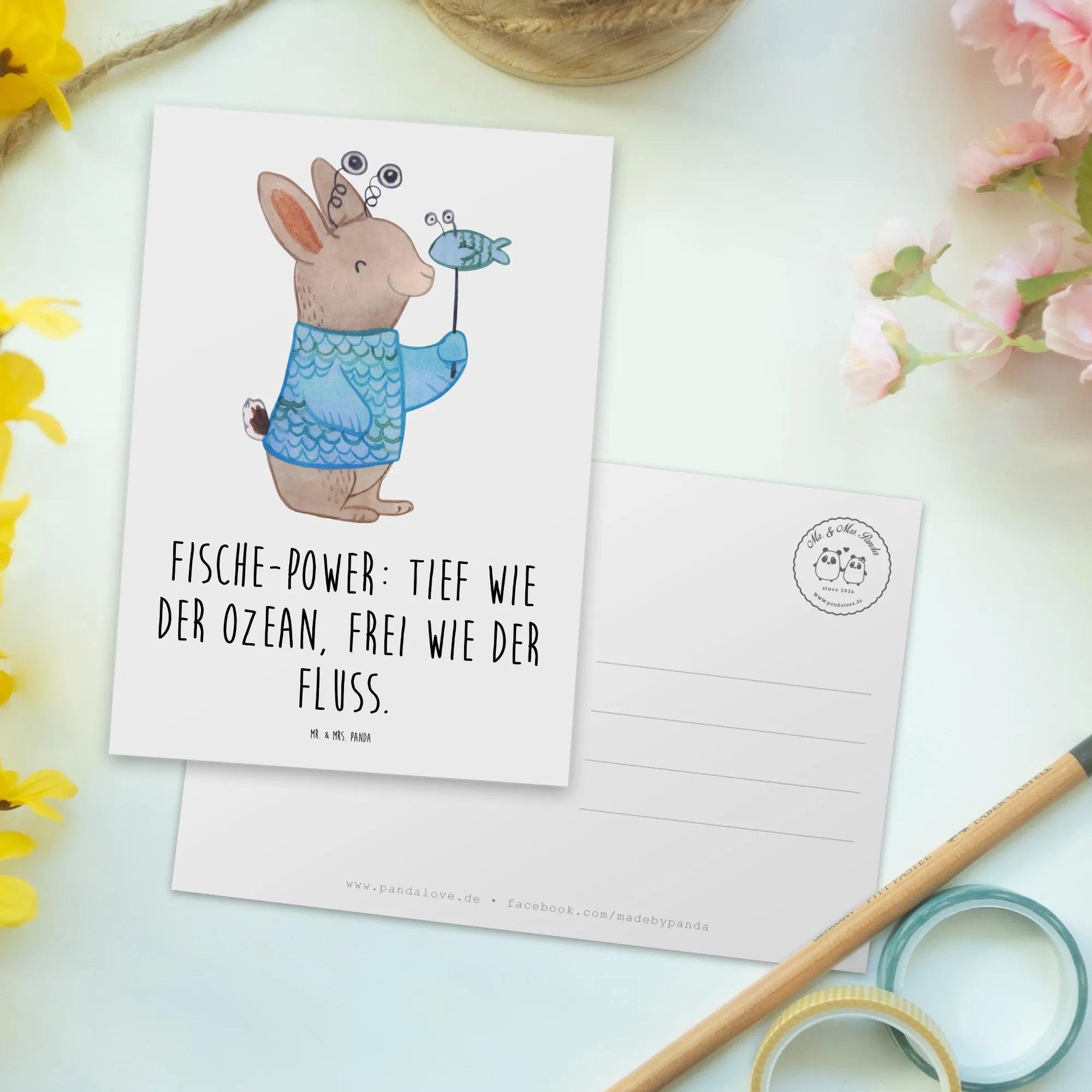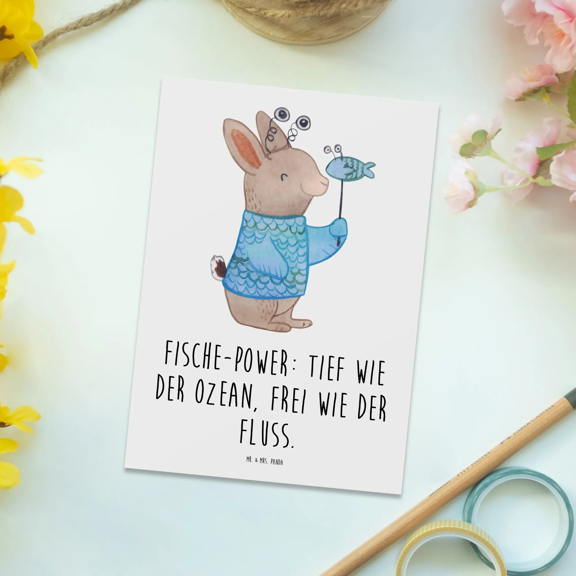 Die Postkarte mit dem Motiv Fische Astrologie von Mr. & Mrs. Panda ist das perfekte Geschenk für alle, die an die Magie der Sternzeichen glauben. Diese bezaubernde Karte verbindet die faszinierende Welt der Astrologie mit einem künstlerischen Design, das jeden Anlass zum Leuchten bringt. Der liebevoll gestaltete Hase im Fischkostüm strahlt Lebensfreude aus und bringt die "Fische-Power" zum Ausdruck: Tief wie der Ozean, frei wie der Fluss. Ob als Einladung zu einem Geburtstag, als Dankeskarten für liebe Freunde oder einfach als nette Geste zwischendurch – diese Karte ist vielseitig verwendbar.