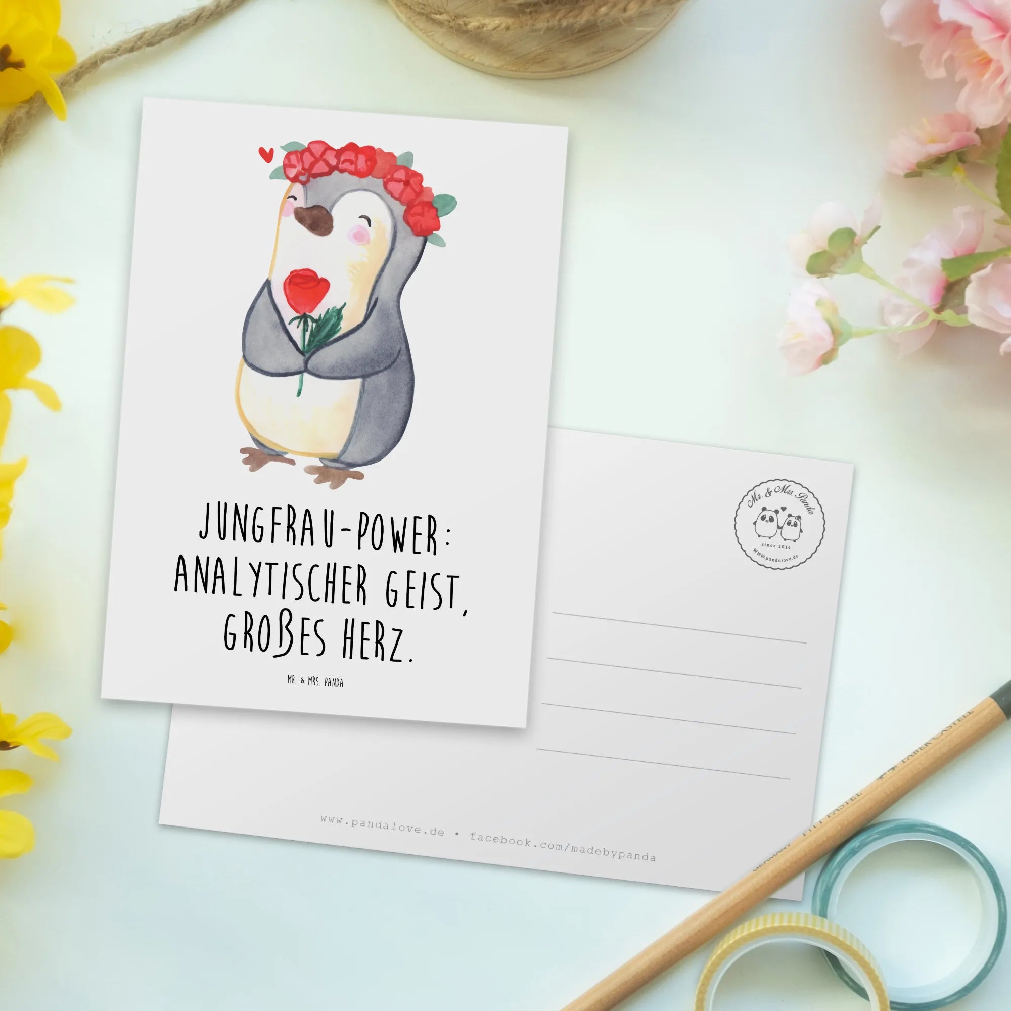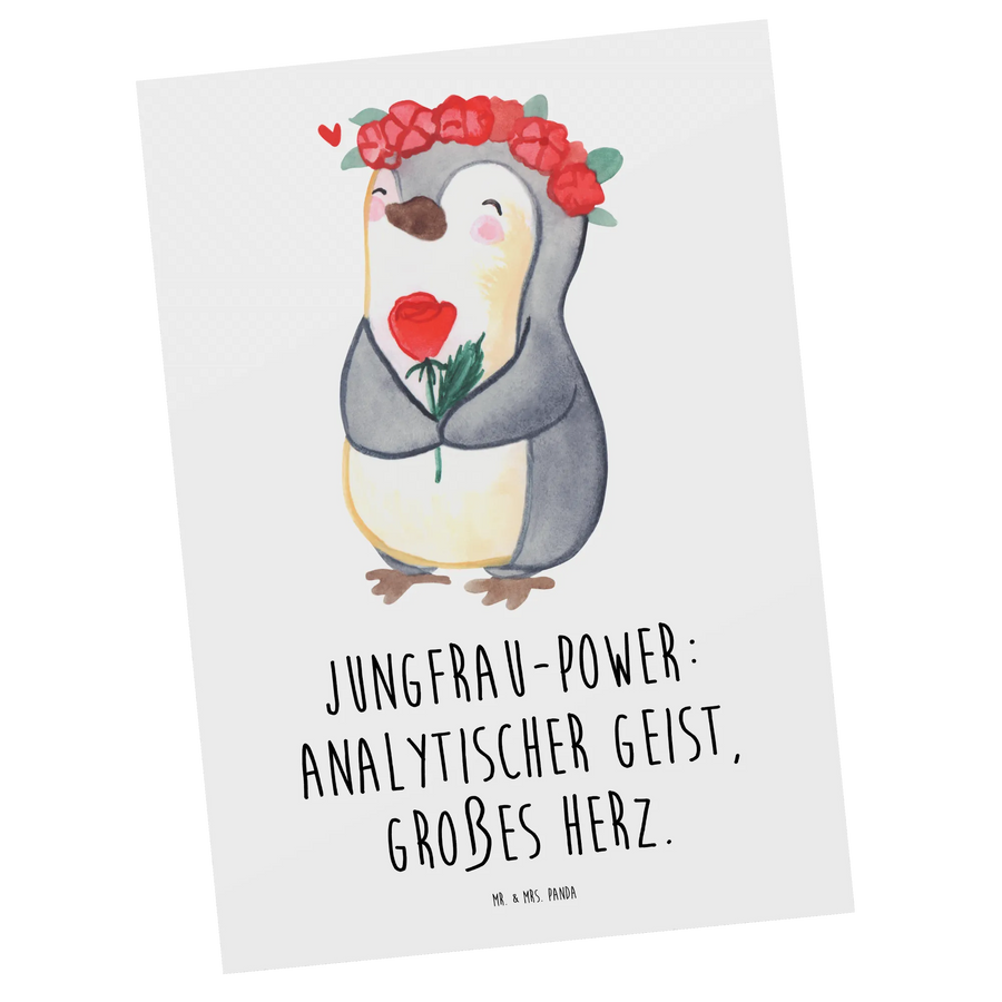 Unsere liebevoll von Mrs. Panda handgezeichnete Jungfrau Astrologie zeigt einen niedlichen Pinguin mit einem Blumenkranz auf dem Kopf, der eine Blume in der Flosse hält. Es ist ein perfektes Geschenk für eine Jungfrau, die sich durch das Element Erde und die Planeten Merkur zugeteilt fühlt.