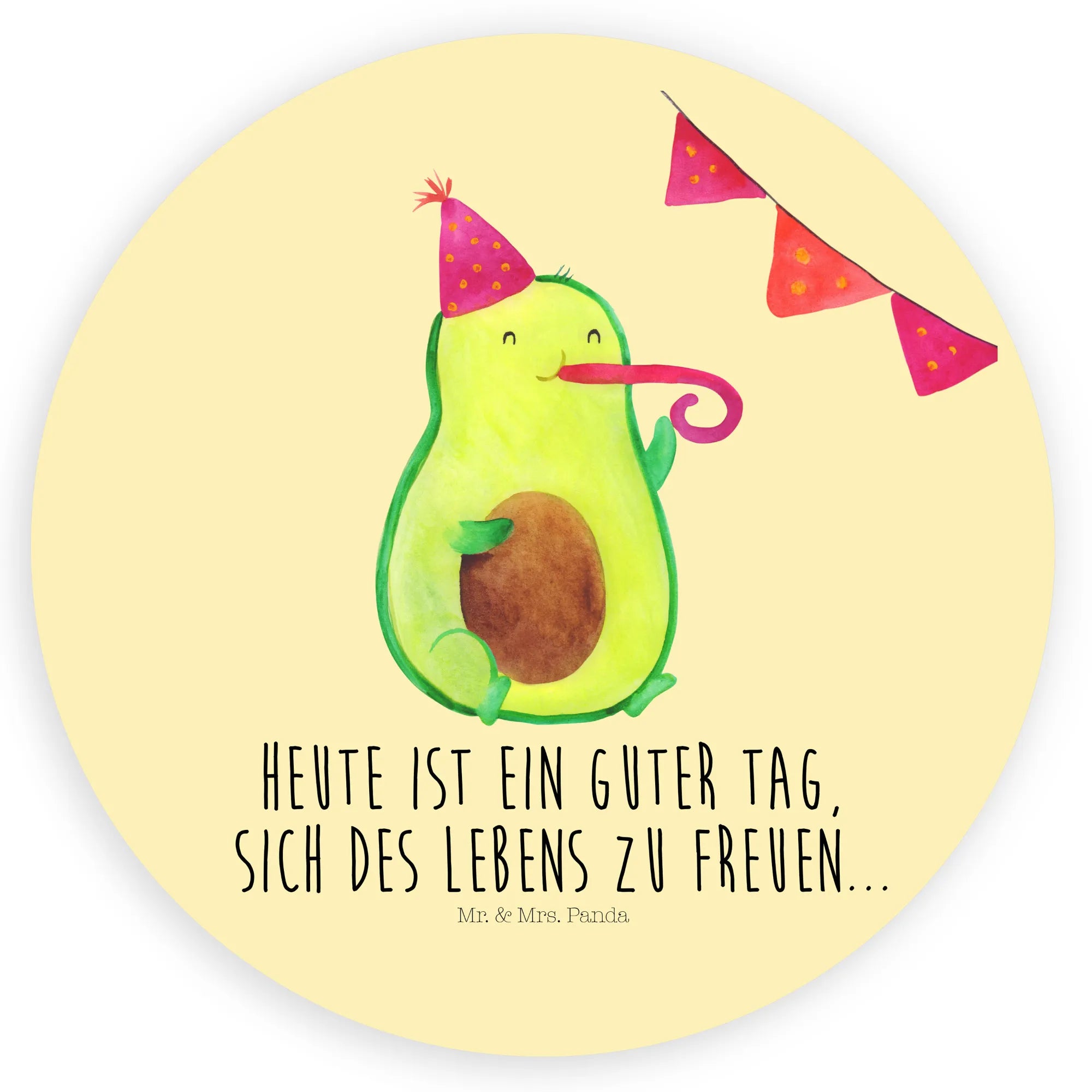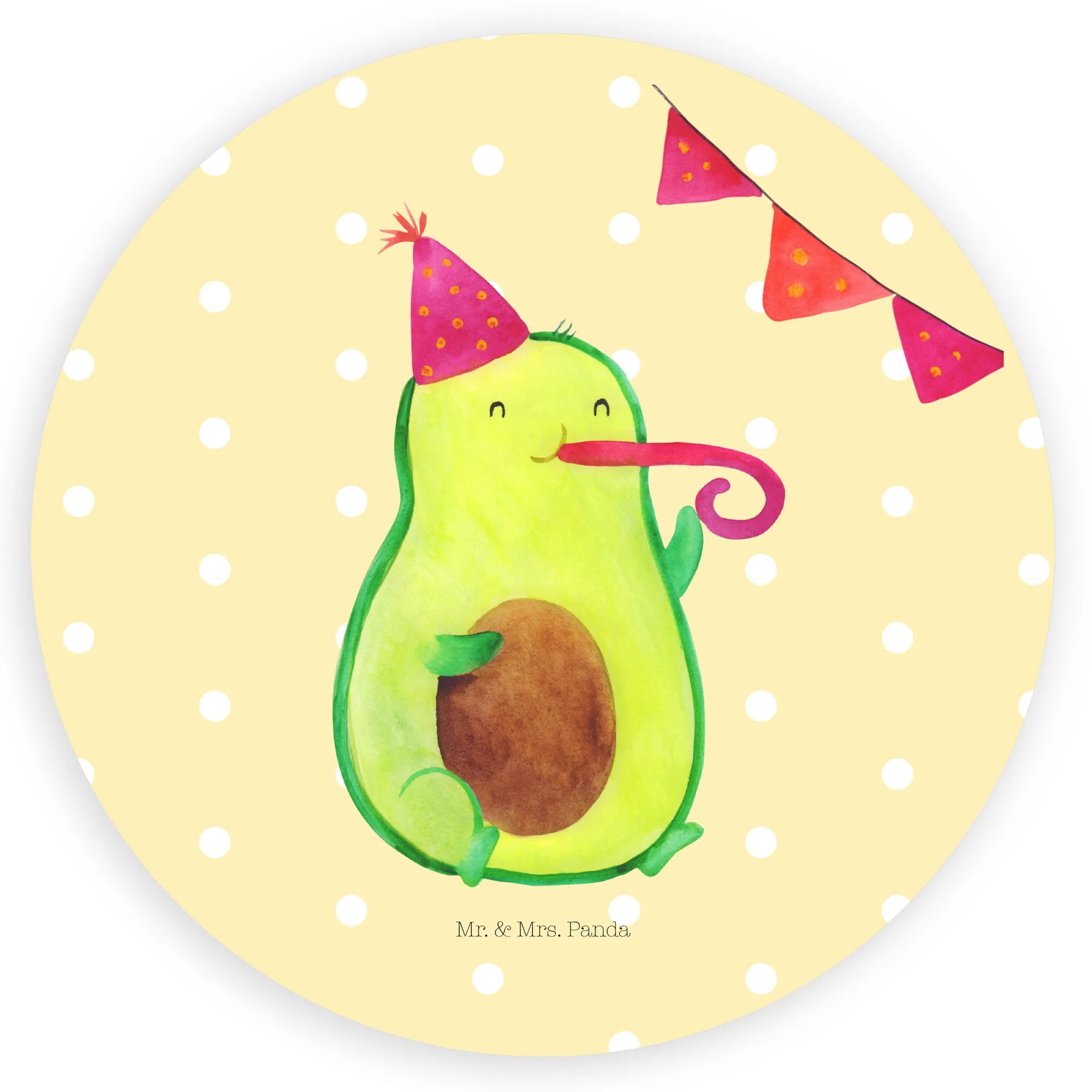 Ein fröhlicher 80mm Rund Aufkleber „Avocado Party“ von Mr. & Mrs. Panda – handgezeichnetes Design, das sofort gute Laune verbreitet. Die kleine Avocado mit Partyhut und Partypfeife ist das perfekte Motiv für Geburtstagsfeiern, Kindergeburtstag, Abi-Feiern und alle, die gerne sammeln oder schöne Dinge verschenken.