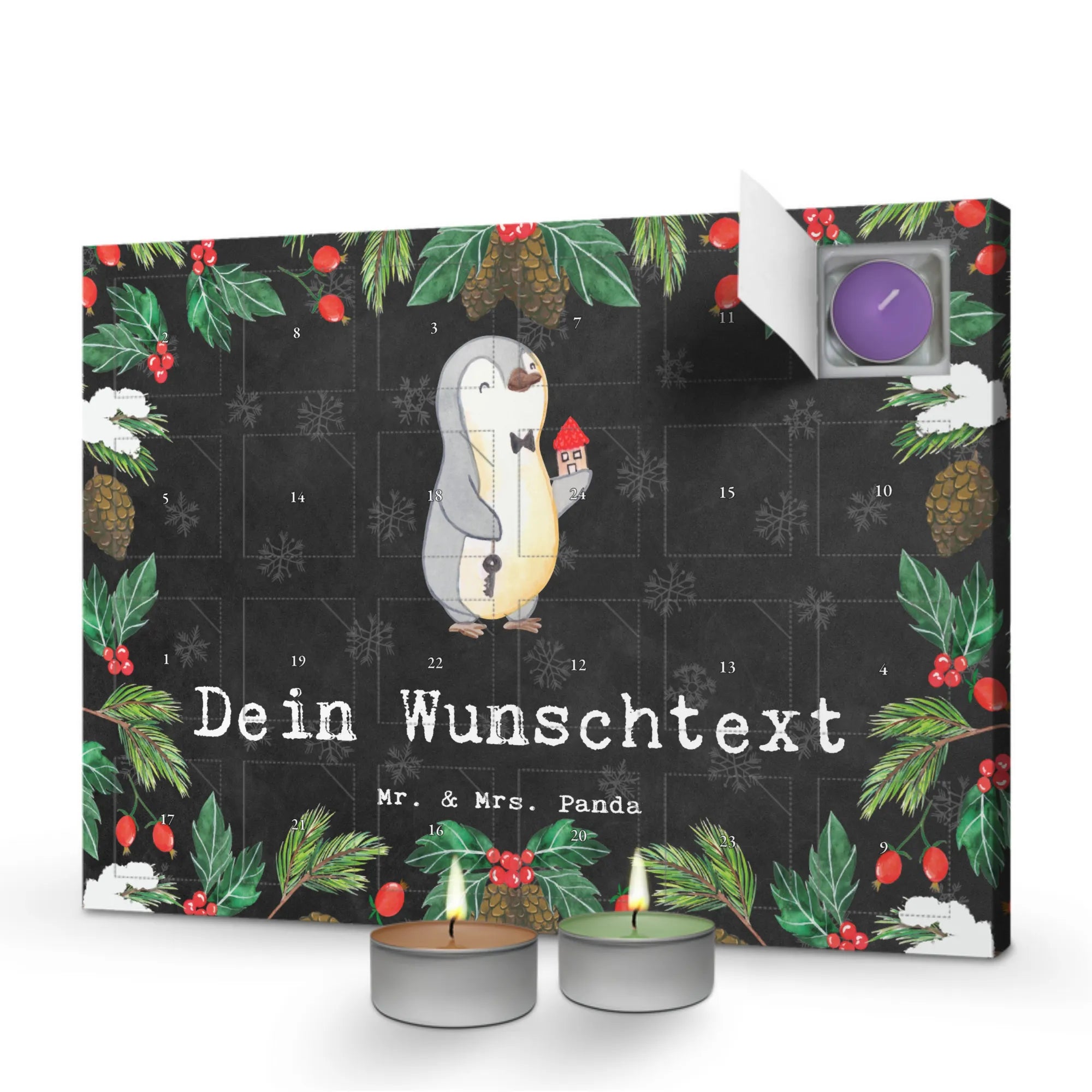 Der personalisierte Duftkerzen Adventskalender "Immobilienkaufmann aus Leidenschaft" von Mr. & Mrs. Panda ist das perfekte Geschenk für Immobilienmakler, Immobilienhändler und Immobilienkaufleute, die ihren Beruf mit Liebe ausüben. Dieser Kalender ist nicht nur eine schöne Dekoration für das Büro, sondern bringt auch eine tägliche Portion Freude mit seinen sechs unterschiedlichen, weihnachtlichen Düften: Vanille, Lavendel, Grüner Tee, Apfel-Zimt, Granatapfel und Oud Wood. Jeder Tag entfaltet einen neuen, berauschenden Duft, der die Vorfreude auf die Feiertage steigert.