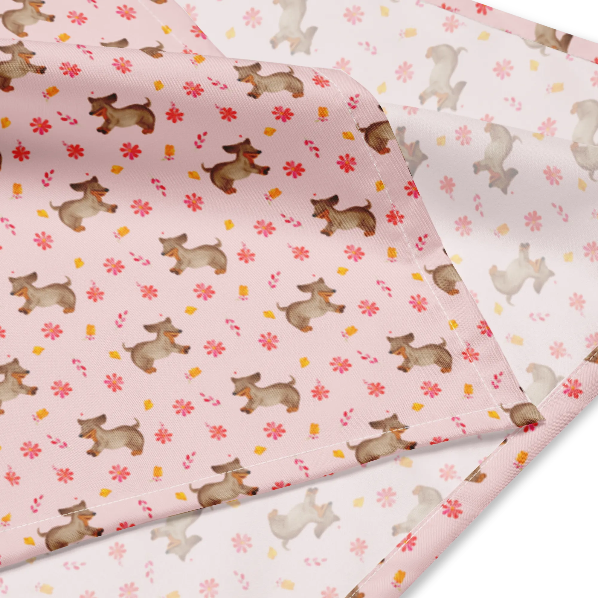 Ob als sportliches Halstuch beim Joggen, als schickes Accessoire beim Spaziergang oder einfach nur zum Schutz gegen die Sonne – dieses multifunktionale Bandana ist äußerst vielseitig einsetzbar. Hergestellt aus 65 % recyceltem Polyester und 35 % Polyester, bietet es ein angenehmes Tragegefühl und ist gleichzeitig umweltfreundlich. Die spezielle rosa Hintergrundfarbe sorgt dafür, dass der fröhliche Dackel strahlt und die gute Laune verbreitet.