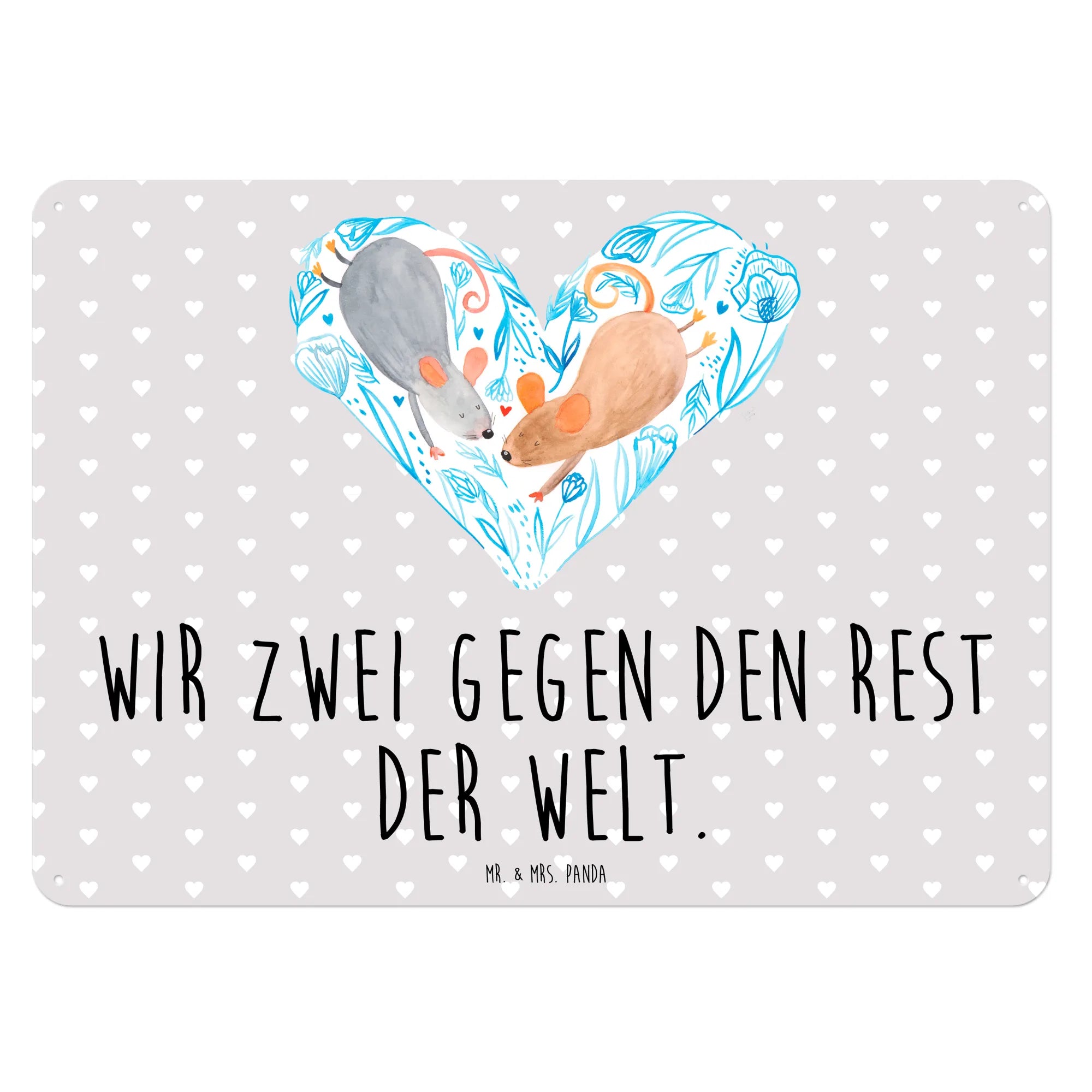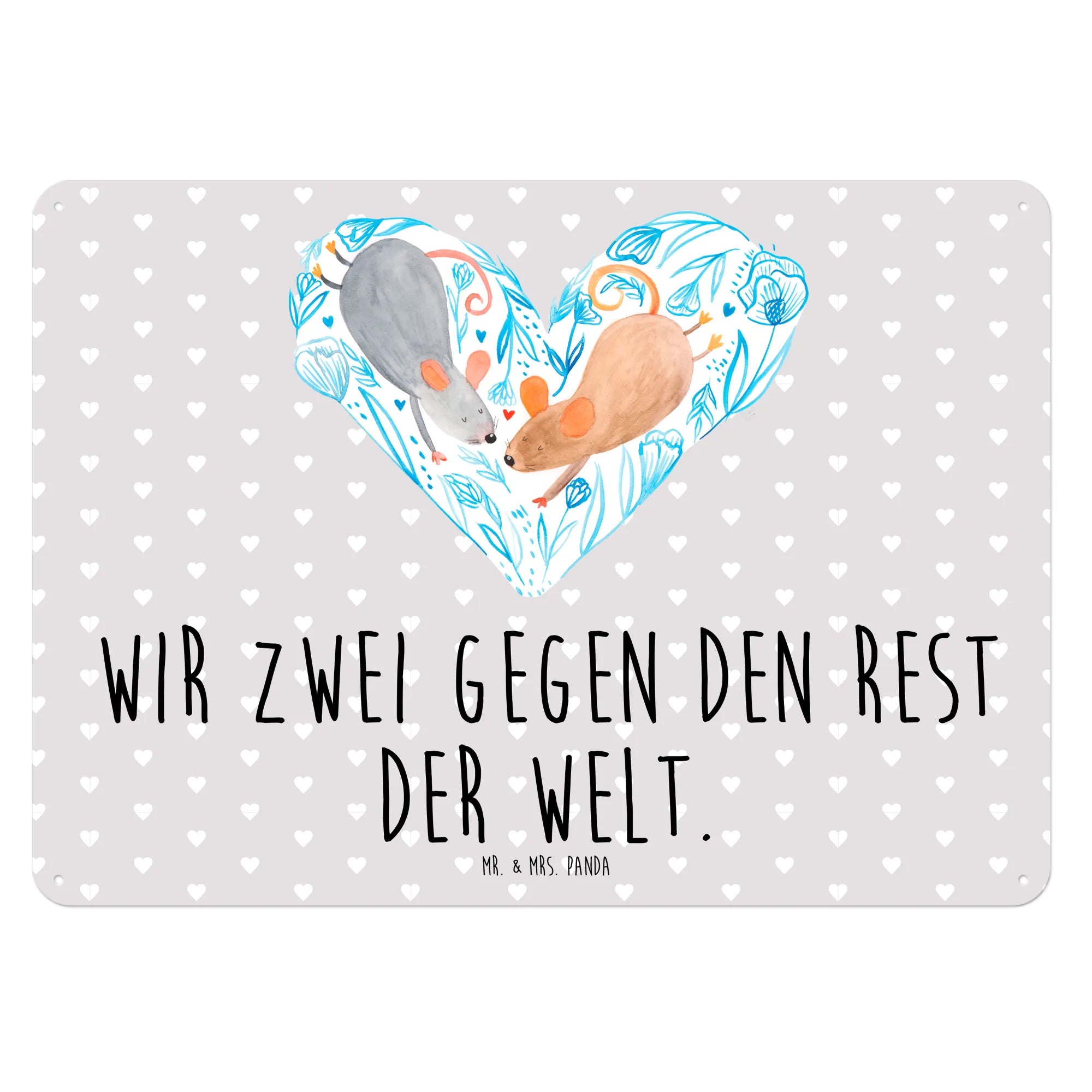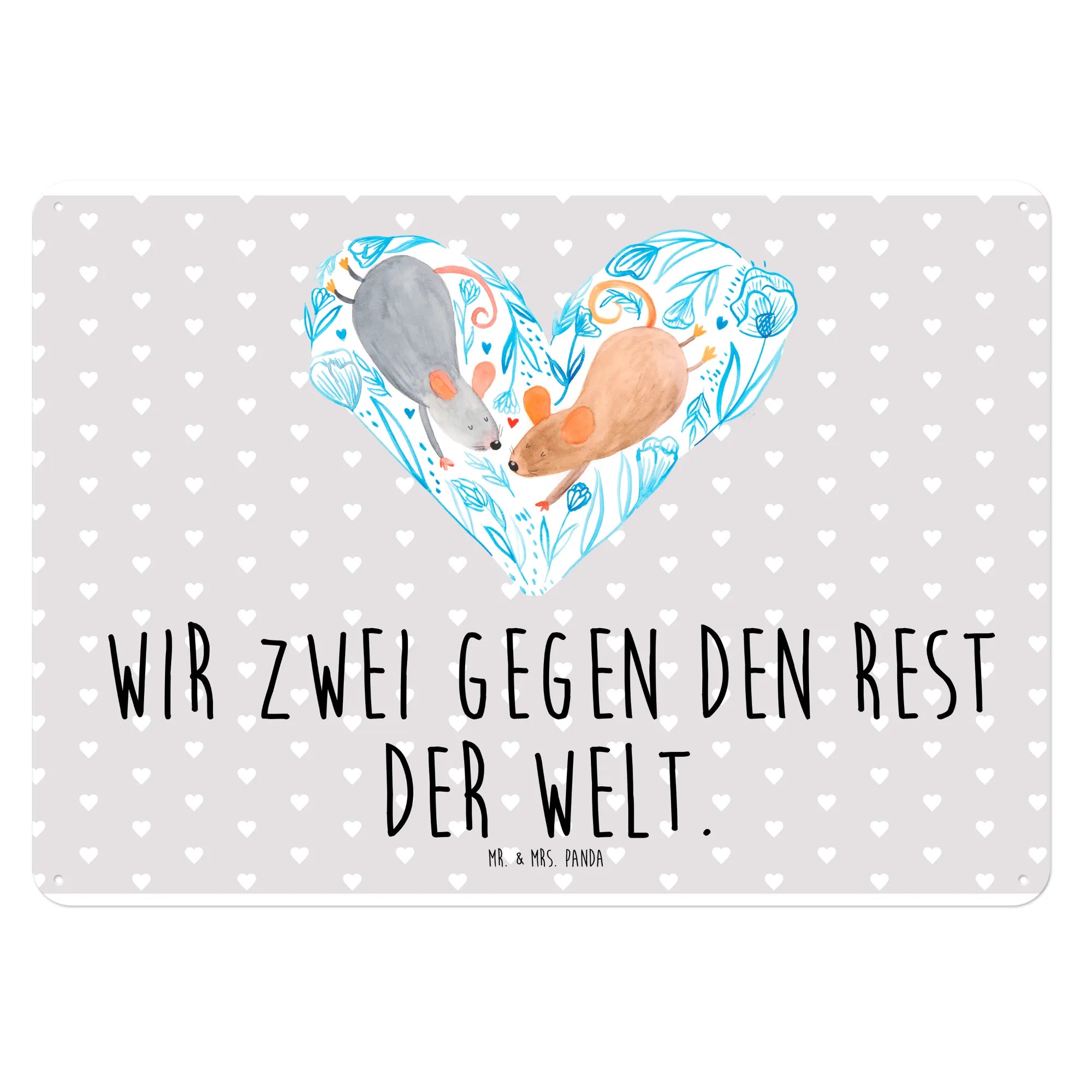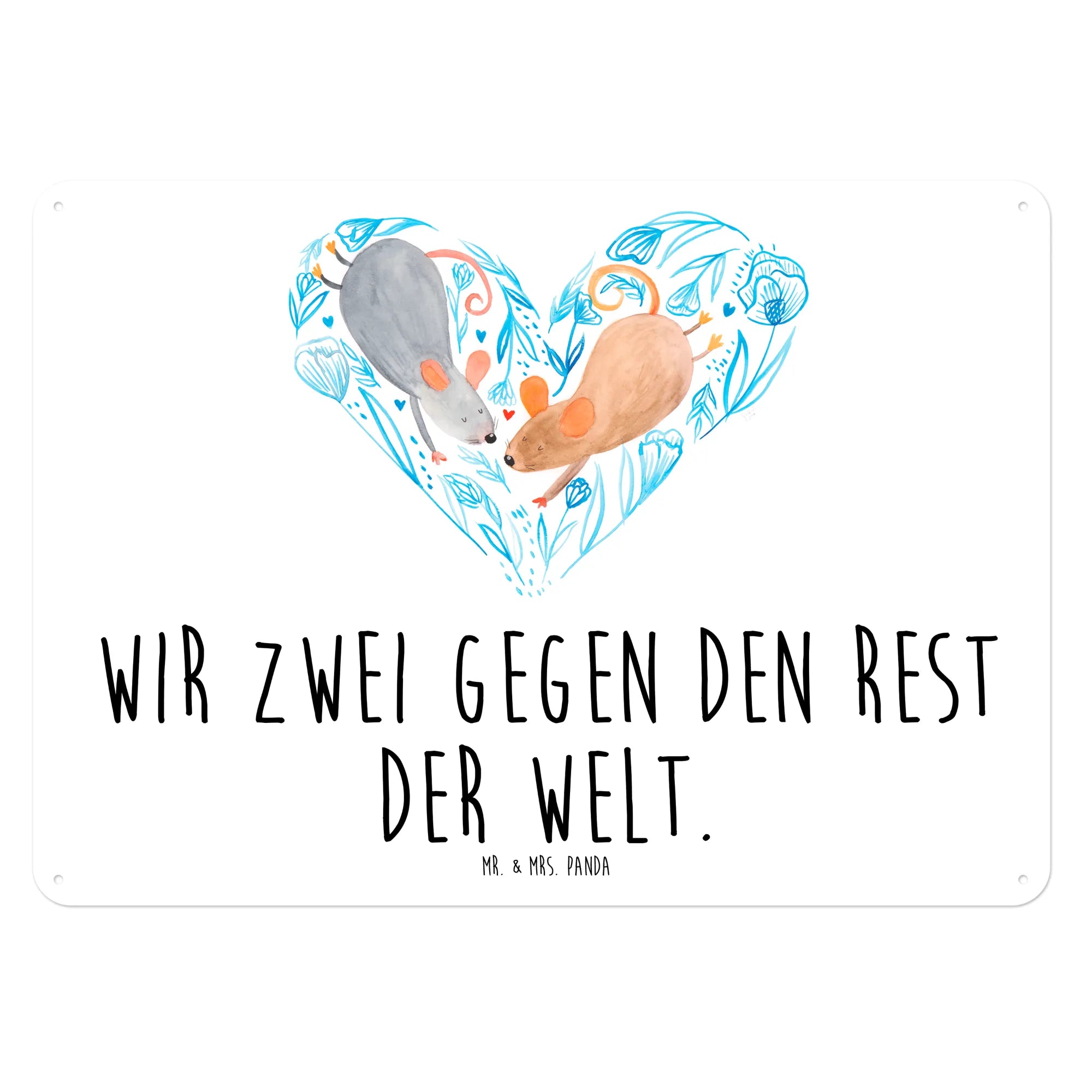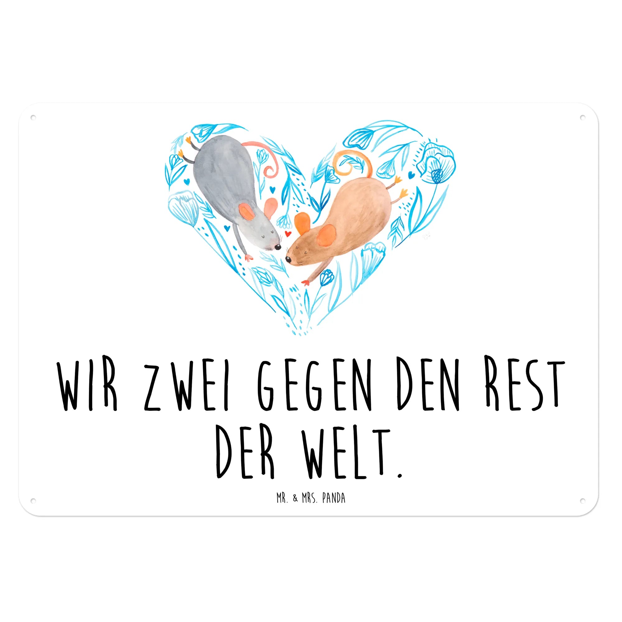 Das edle Blechschild "Mäuse Herz" von Mr. & Mrs. Panda ist das perfekte Geschenk für alle Verliebten und romantischen Seelen! Mit seiner herzlichen Botschaft "Wir zwei gegen den Rest der Welt" und den bezaubernden, handgezeichneten Aquarellmotiven bringt es Liebe und Freude in jedes Zuhause.