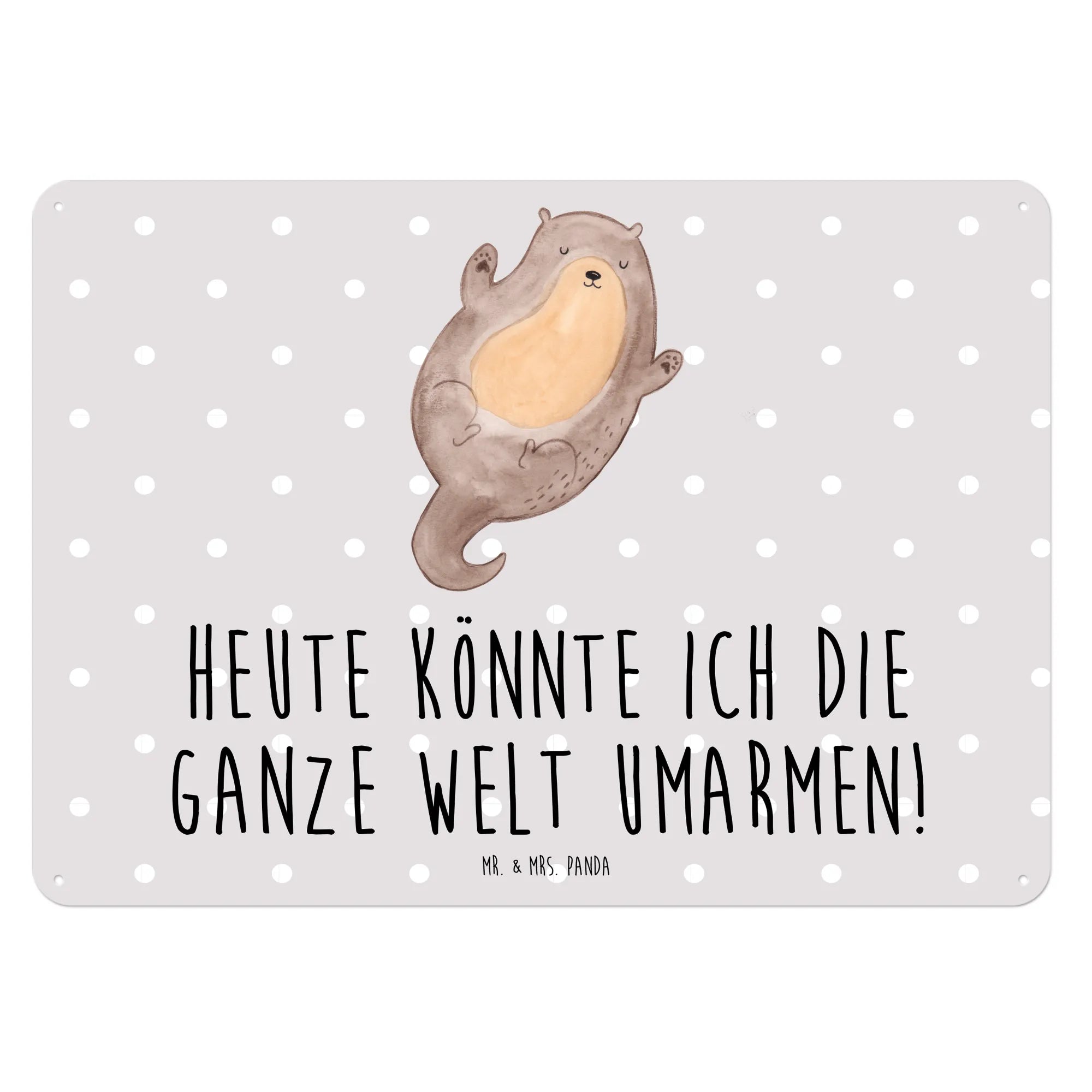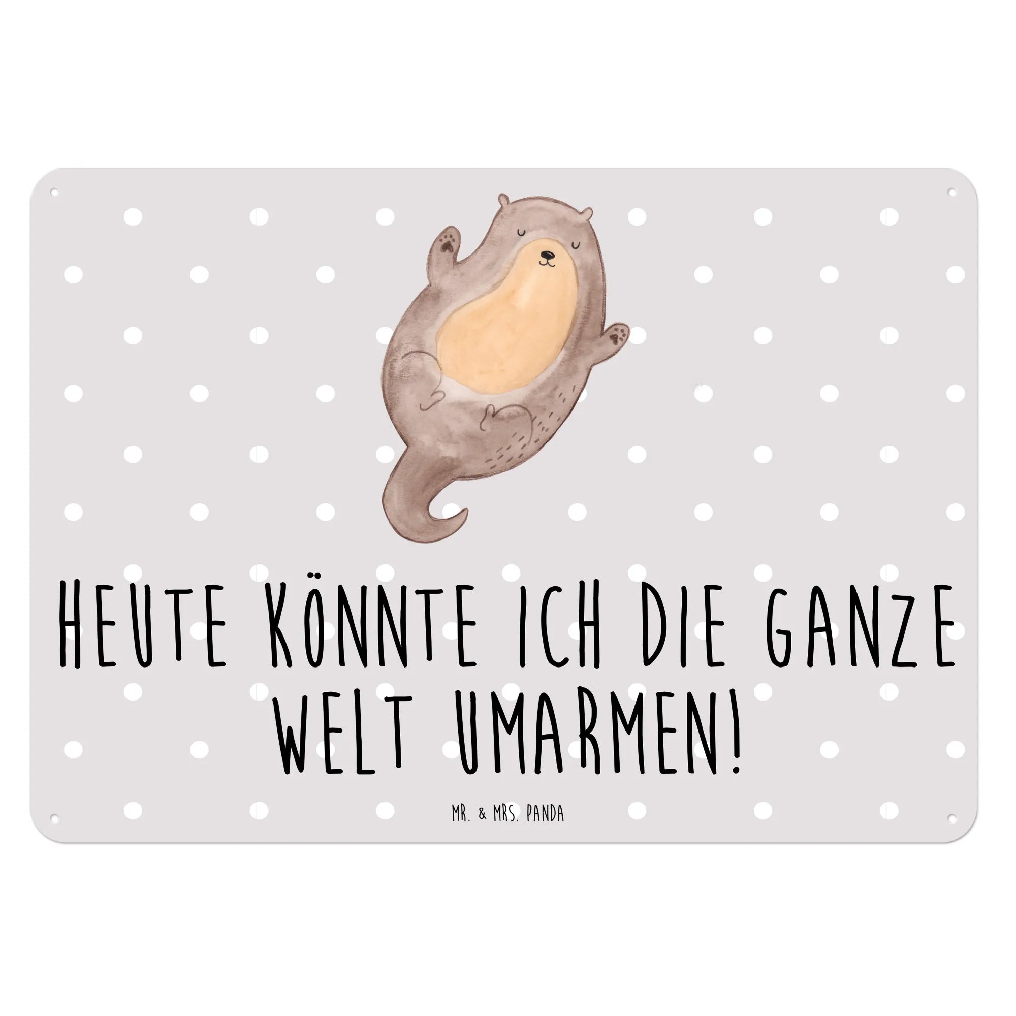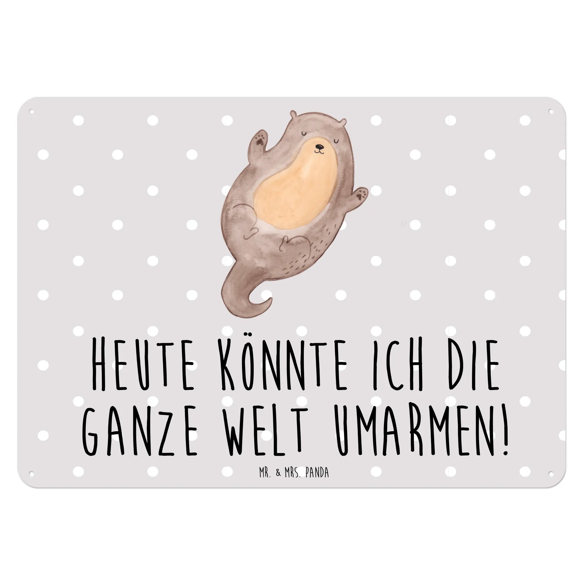 Ein wunderschönes Blechschild von Mr. & Mrs. Panda: Das „Otter Umarmen“ Blechschild aus der Otter - Kollektion bringt ein Lächeln in jeden Raum. Auf einem zarten grau-pastelligen Hintergrund schwimmt ein niedlicher Seeotter auf dem Rücken und breitet die Arme aus – dazu der herzliche Spruch „Heute könnte ich die ganze Welt umarmen!“