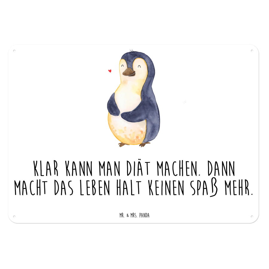 Das edle Blechschild aus der Pinguin-Kollektion von Mr. & Mrs. Panda ist das perfekte Geschenk für alle, die einen besonderen Blick auf ihre Diät werfen möchten. Dieses charmante Metallschild zeigt einen fröhlichen Pinguin, der sich über seinen runden Bauch streichelt, begleitet von dem witzigen Spruch: 'Klar kann man Diät machen. Dann macht das Leben halt keinen Spaß mehr.'