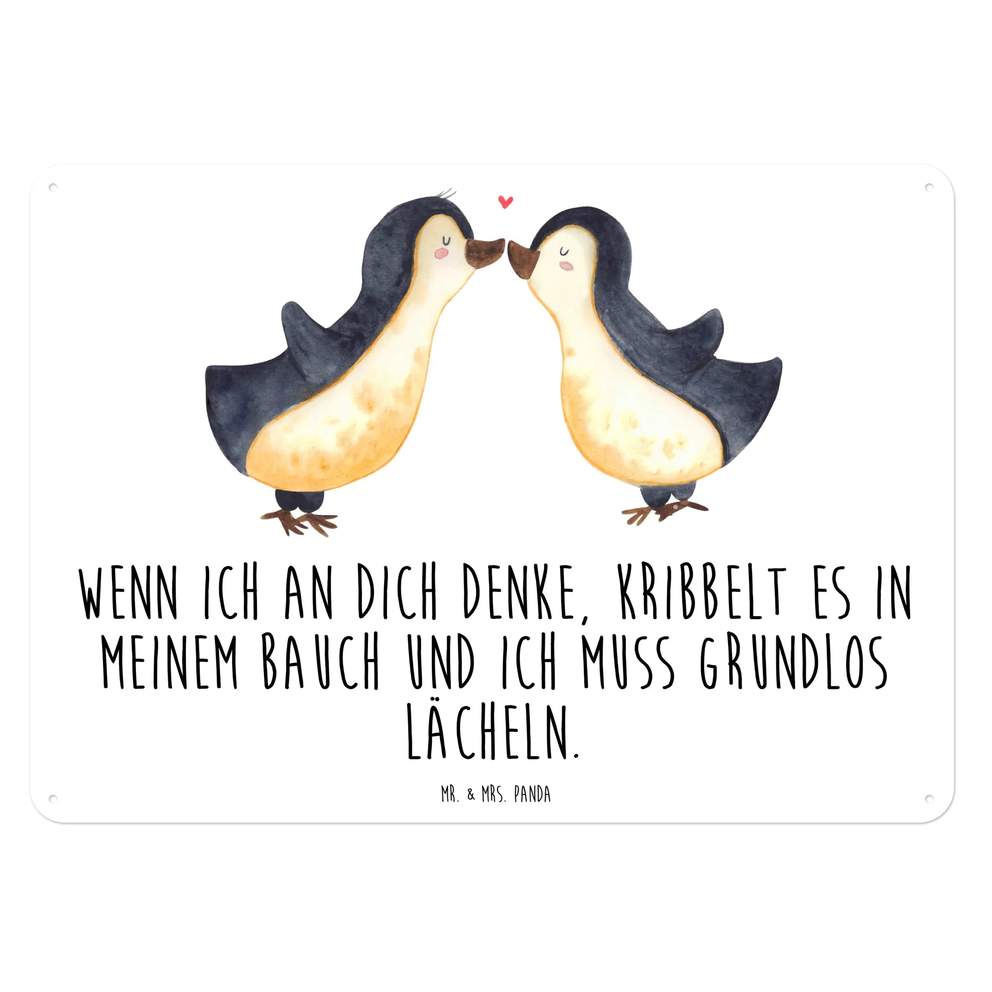 Das edle Blechschild "Pinguine Kuss" von Mr. & Mrs. Panda ist das perfekte Geschenk für alle, die Liebe und Zuneigung zeigen möchten. Mit dem herzlichen Motiv zwei Pinguine, die sich zärtlich küssen, bringt es Liebe und Glück in jedes Zuhause. Der Spruch "Wenn ich an dich denke, kribbelt es in meinem Bauch und ich muss grundlos lächeln." unterstreicht die süße Botschaft und macht dieses Schild zu einem unvergesslichen Liebesbeweis.