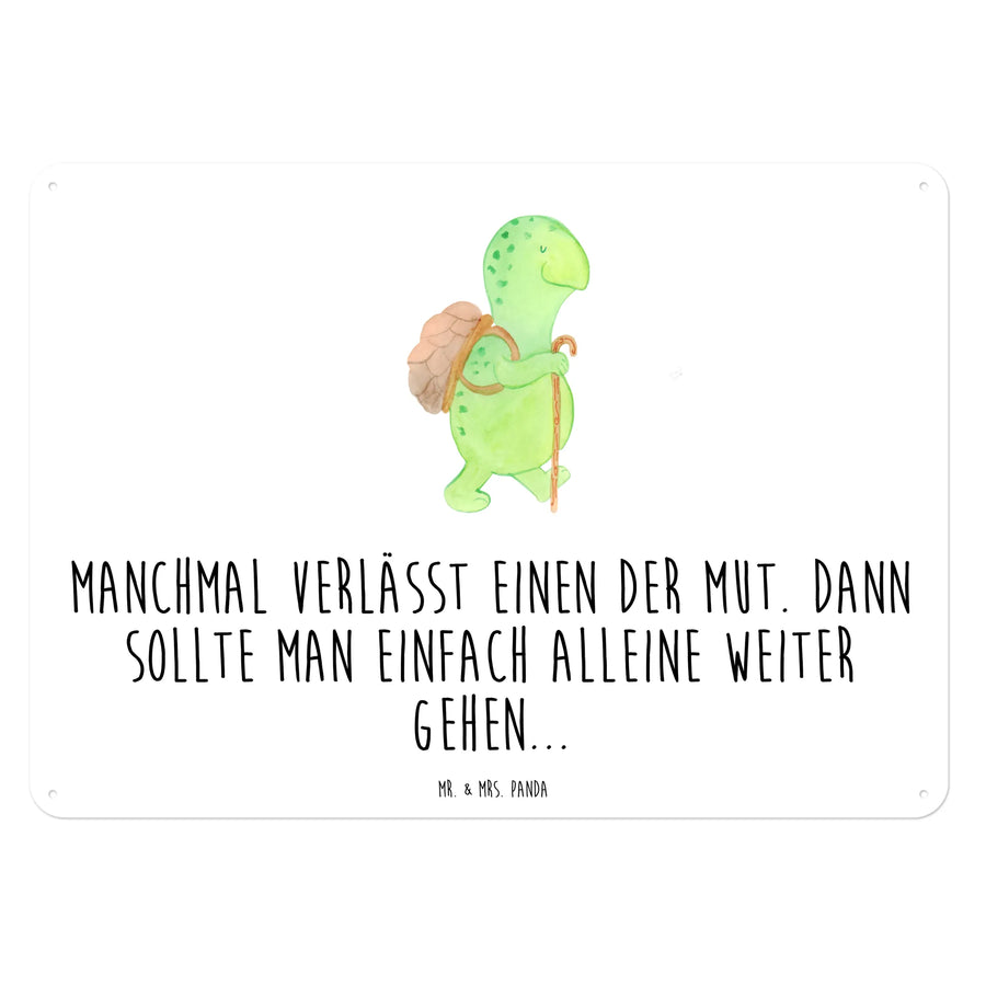 Entdecke das wundervolle Blechschild mit der süßen Schildkröte Wanderer von Mr. & Mrs. Panda! Dieses charmante Metallschild ist mehr als nur ein Deko-Objekt – es ist eine Quelle der Motivation und Inspiration, die dir jeden Tag ein Lächeln ins Gesicht zaubert. Mit dem Slogan 'Manchmal verlässt einen der Mut. Dann sollte man einfach alleine weiter gehen...' spricht dieses Schild all diejenigen an, die sich auf ihren eigenen Weg begeben möchten!
