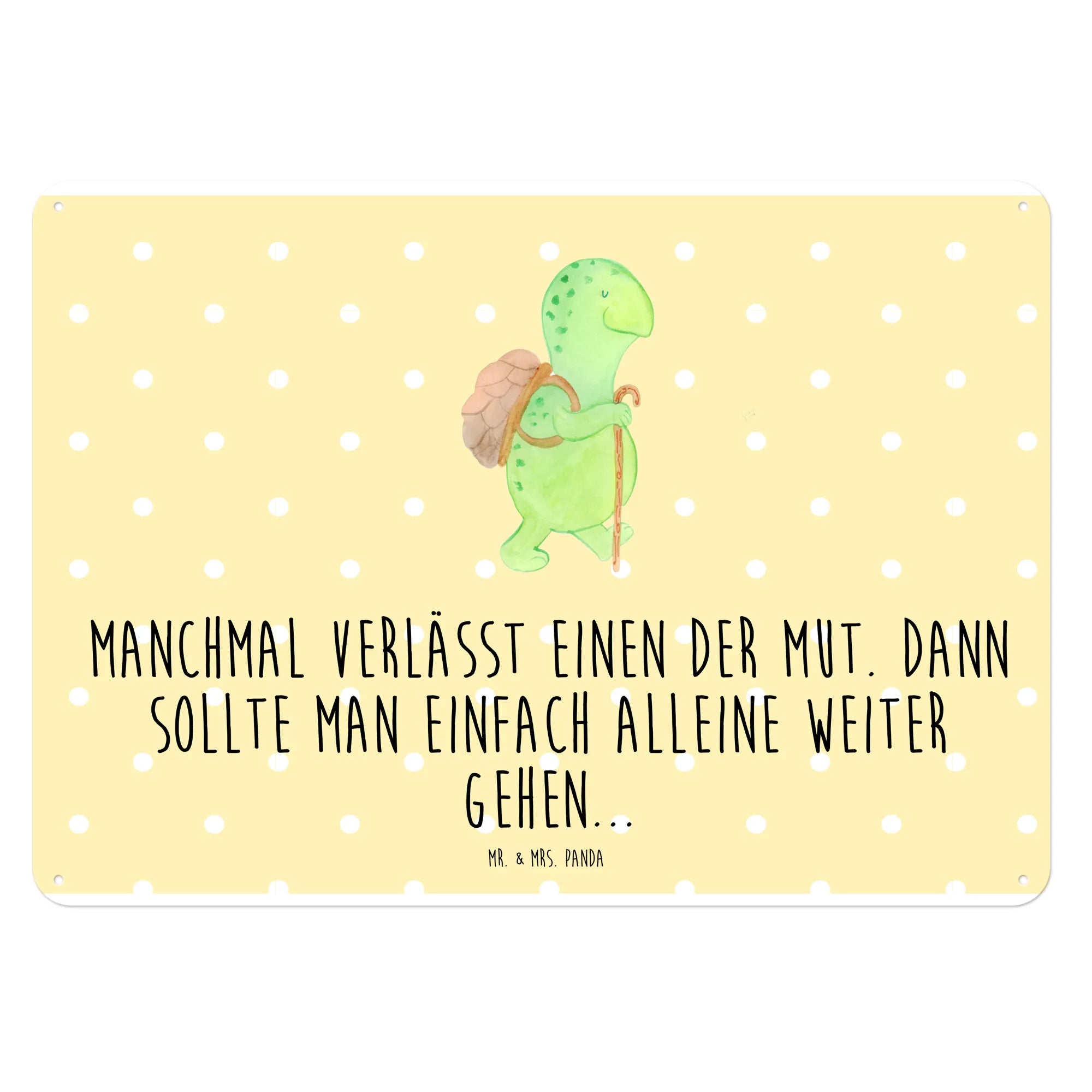 Mit einer süßen Schildkröte, die ihren Panzer wie einen kleinen Rucksack trägt und mit einem Gehstock in der Hand einen Spaziergang macht, bringt dieses Schild ein Lächeln auf dein Gesicht. Das Motiv ist nicht nur herzerwärmend, sondern auch mit dem inspirierenden Spruch "Manchmal verlässt einen der Mut. Dann sollte man einfach alleine weiter gehen..." bedruckt. Diese Botschaft erinnert uns daran, dass es manchmal okay ist, neue Wege zu gehen, ganz gleich, wie herausfordernd sie erscheinen mögen.