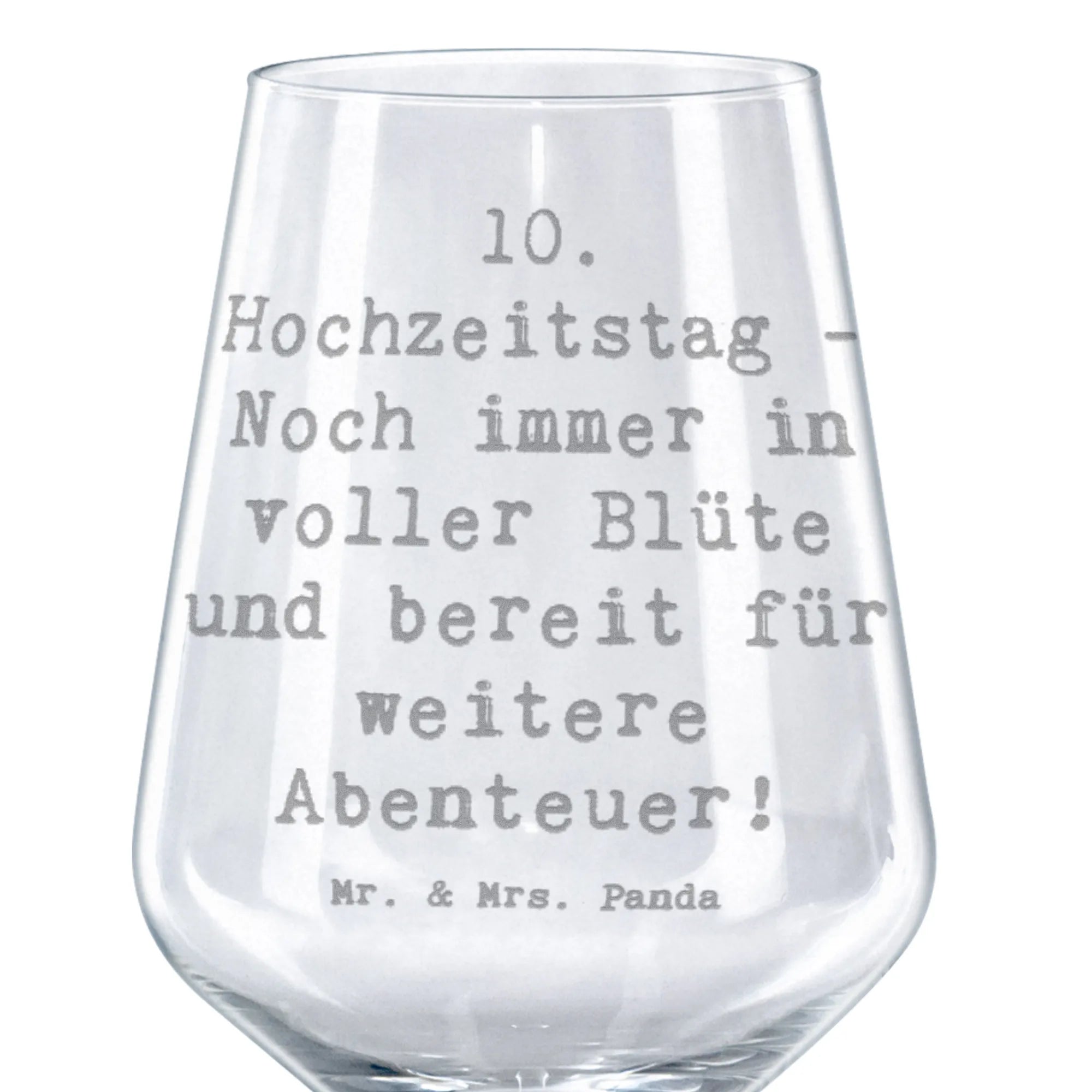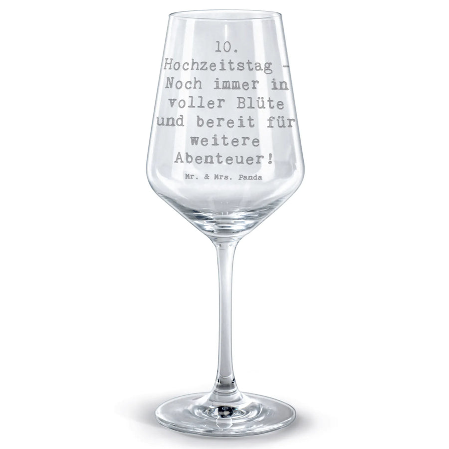 Das Rotweinglas mit dem liebevollen Motiv "10. Hochzeitstag – Noch immer in voller Blüte und bereit für weitere Abenteuer!" von Mr. & Mrs. Panda ist das perfekte Geschenk für jeden Weinliebhaber, der seinen runden Hochzeitstag stilvoll feiern möchte.