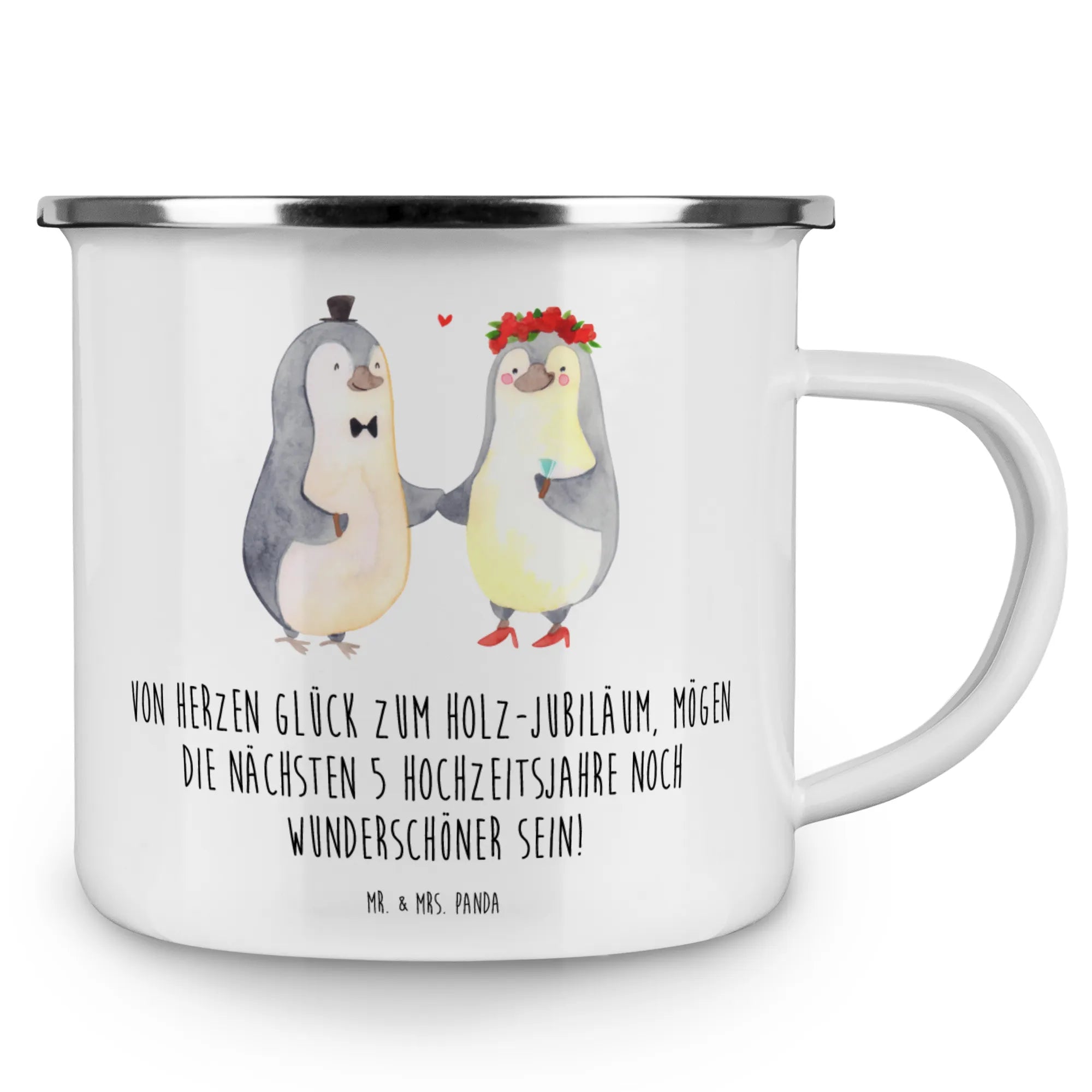 Die Camping Emaille Tasse "5. Hochzeitstag Holzhochzeit" von Mr. & Mrs. Panda ist das perfekte Geschenk für frisch verheiratete Paare, die ihren fünften Hochzeitstag feiern! Diese exquisite und kratzfeste Emaille Tasse bringt nicht nur Freude bei jedem Schluck, sondern ist auch ein wunderbares Andenken an gemeinsame Abenteuer in der Natur. Mit einem herzlichen Spruch "Von Herzen Glück zum Holz-Jubiläum, mögen die nächsten 5 Hochzeitsjahre noch wunderschöner sein!" ist diese Tasse ein einzigartiges Geschenk, das die Magie der Liebe und die Bedeutung von gemeinsamen Erinnerungen einfängt.