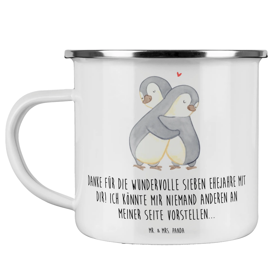 Schenke deinem Partner oder deiner Partnerin ein ganz besonderes Geschenk zum 7. Hochzeitstag – unsere bezaubernde Camping Emaille Tasse mit dem liebevollen Motiv "7. Hochzeitstag Kupferhochzeit"!