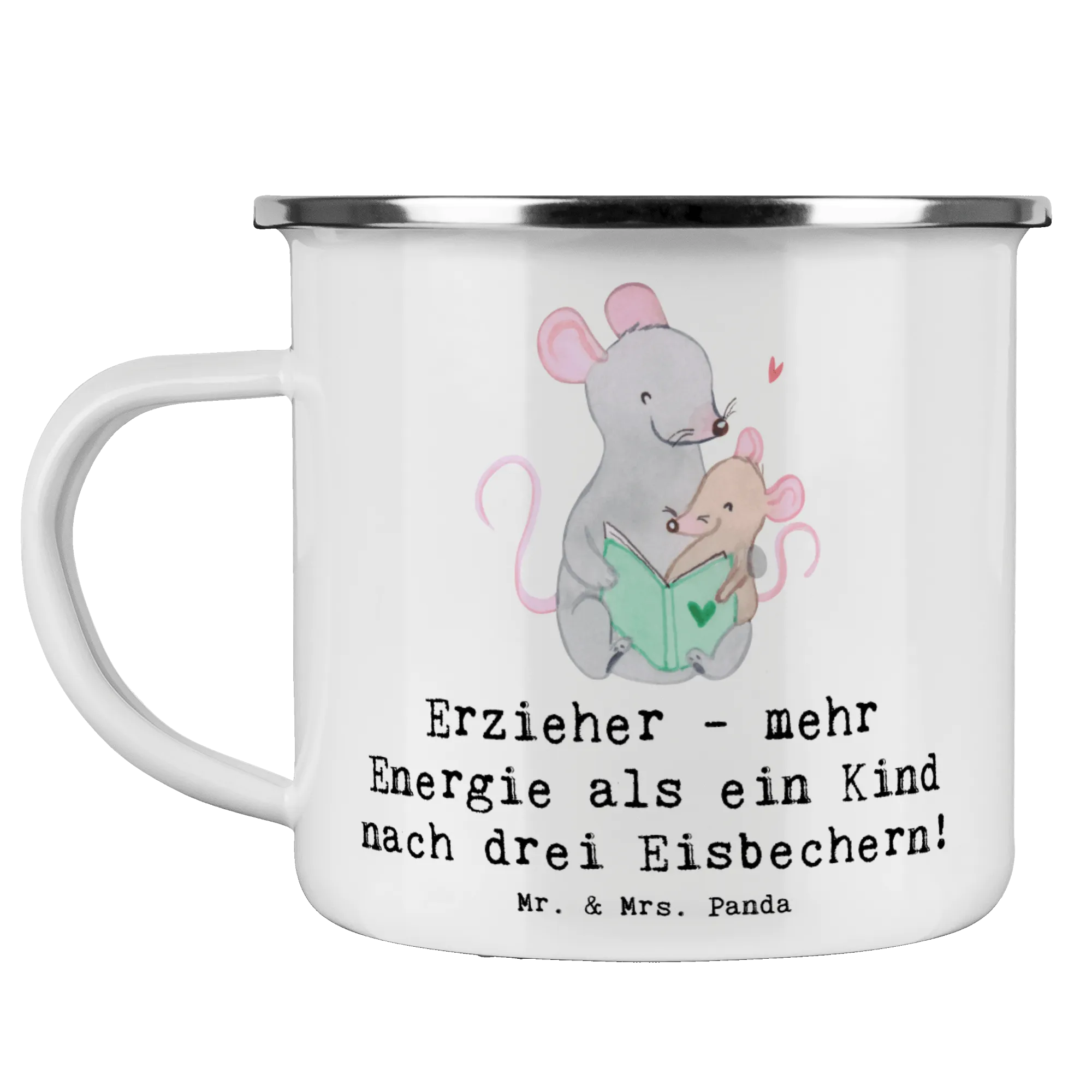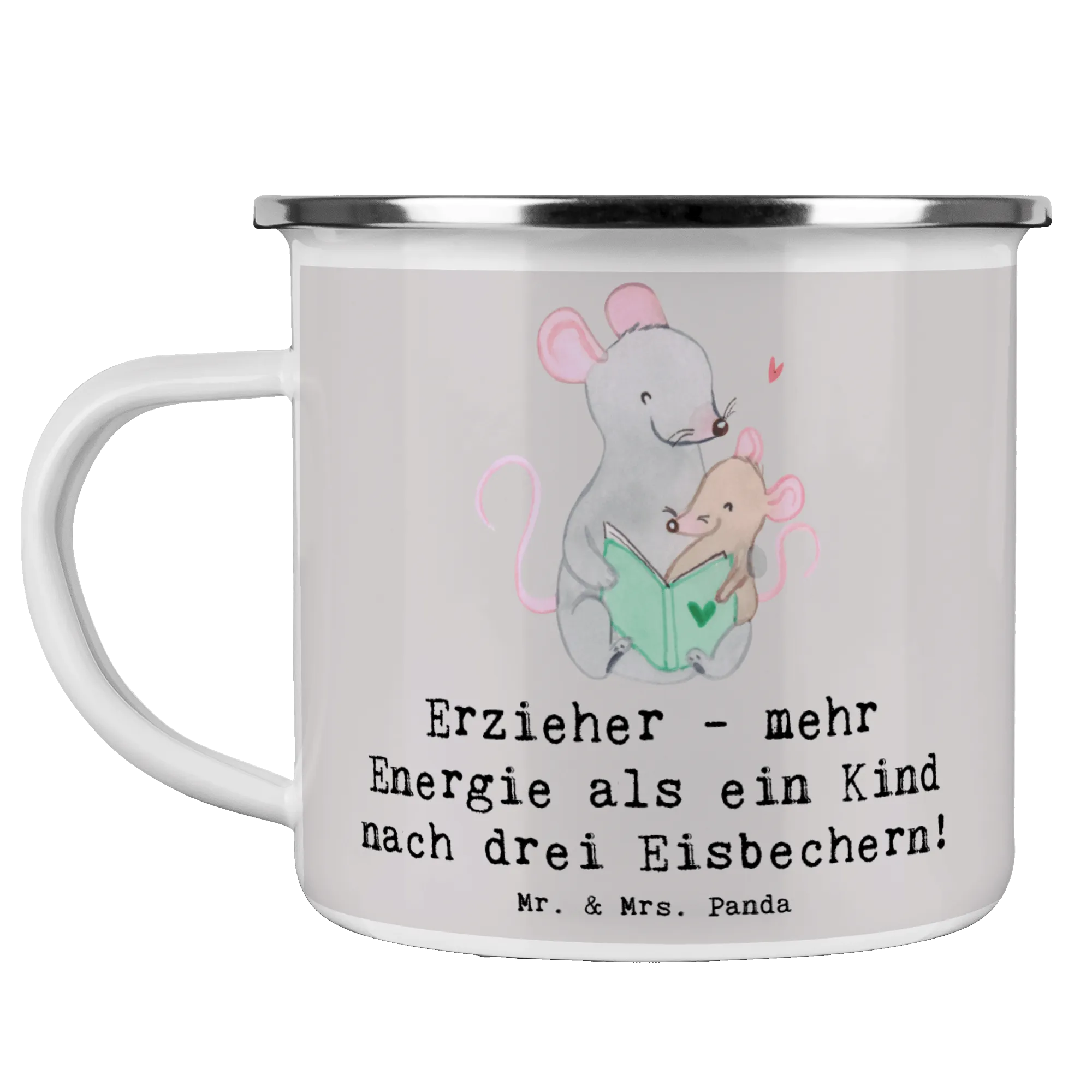 Du suchst das perfekte Geschenk für einen Erzieher oder eine Erzieherin? Dann ist die Camping Emaille Tasse "Erzieher - mehr Energie als ein Kind nach drei Eisbechern!" von Mr. & Mrs. Panda genau das Richtige!