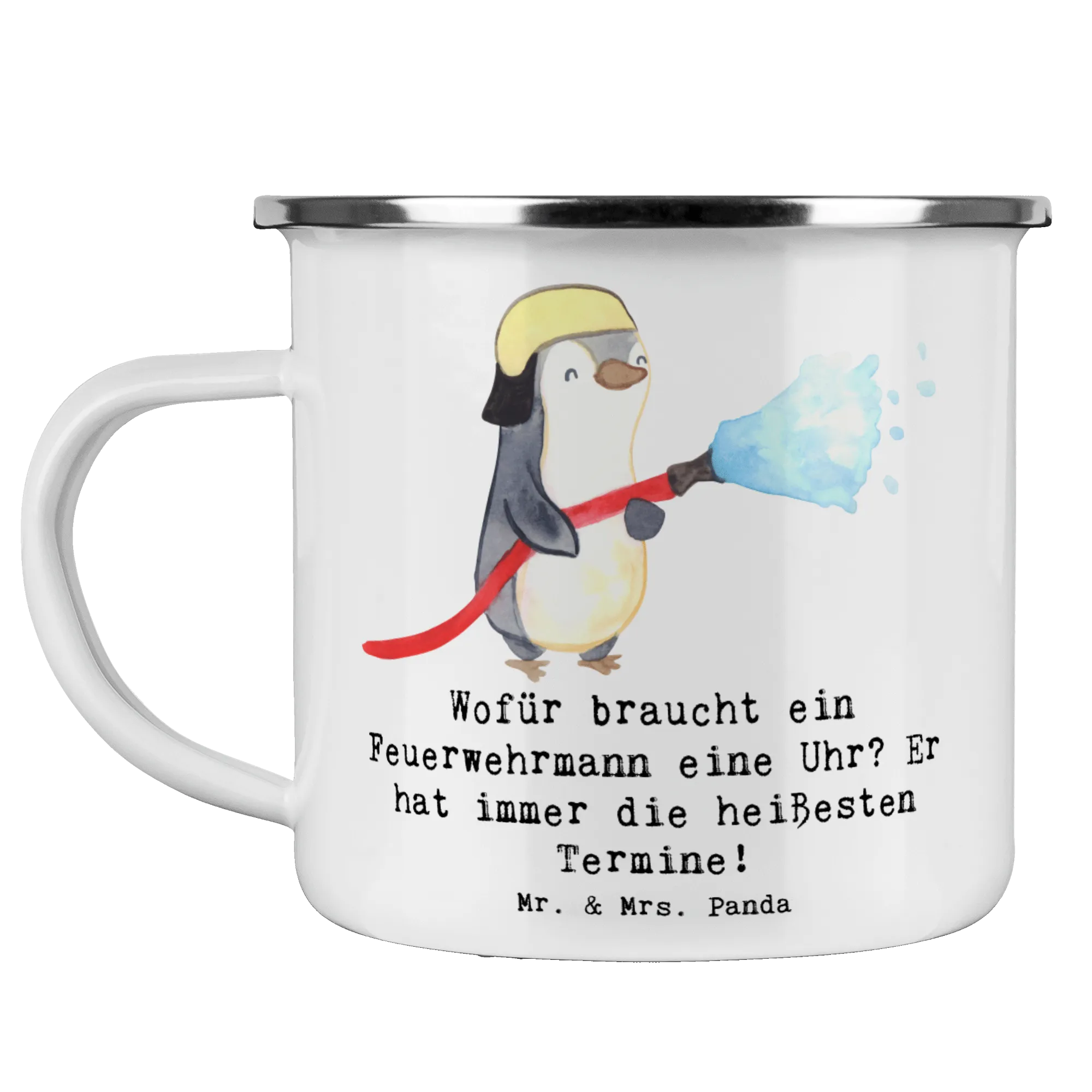 Die perfekte Camping Emaille Tasse für alle Feuerwehrmann-Fans! Diese wunderschöne und beständige Tasse von Mr. & Mrs. Panda ist nicht nur ein echter Hingucker, sondern auch der ideale Begleiter für deine nächsten Abenteuer in der Natur. Mit einem liebevoll gestalteten Motiv eines Feuerwehrmanns und dem humorvollen Spruch "Wofür braucht ein Feuerwehrmann eine Uhr? Er hat immer die heißesten Termine!" zaubert sie dir ein Lächeln ins Gesicht, während du deinen Kaffee oder Tee genießt.