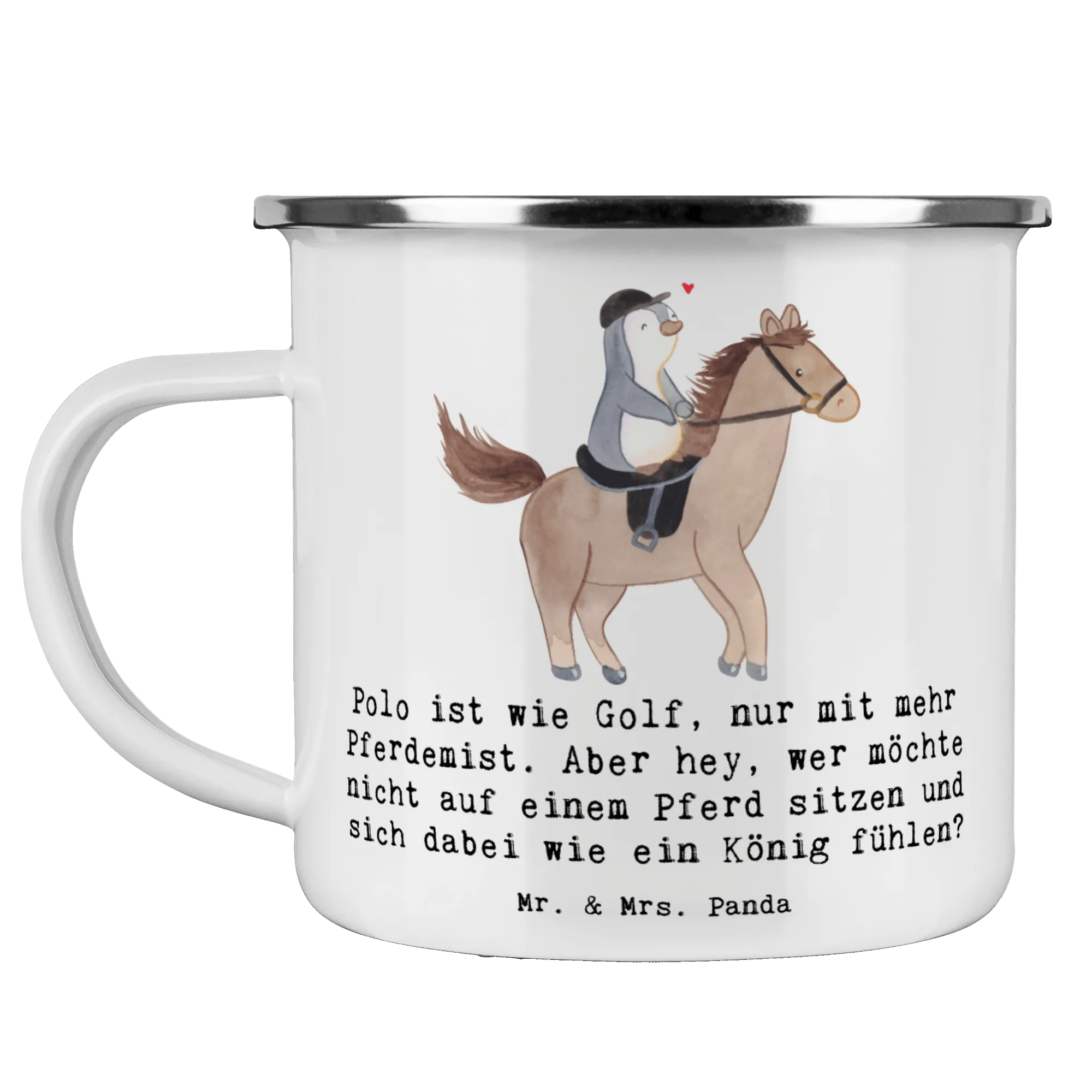 Die Camping Emaille Tasse mit dem witzigen Polo-Motiv von Mr. & Mrs. Panda ist das perfekte Geschenk für Sportliebhaber und Campingfans!