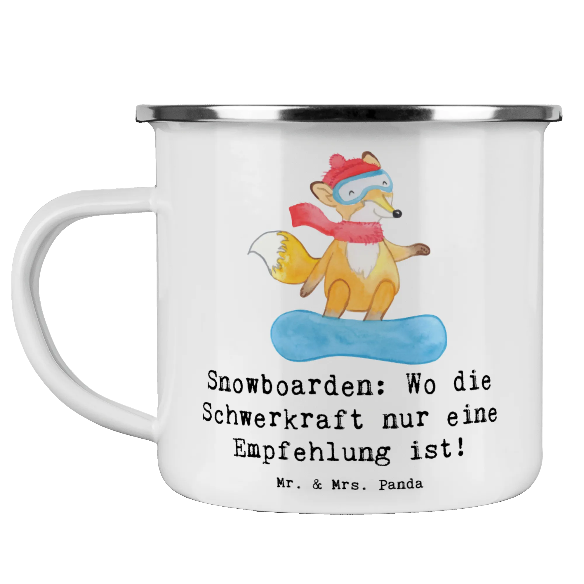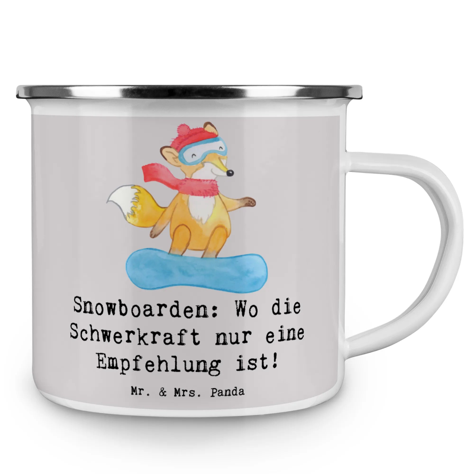 Die Camping Emaille Tasse von Mr. & Mrs. Panda mit dem Motiv Snowboarden ist der perfekte Begleiter für all deine Outdoor-Abenteuer. Egal, ob du beim Camping, Wandern oder einfach nur im Garten entspannst, diese stylische und robuste Emaille Tasse wird dich mit Sicherheit begeistern!