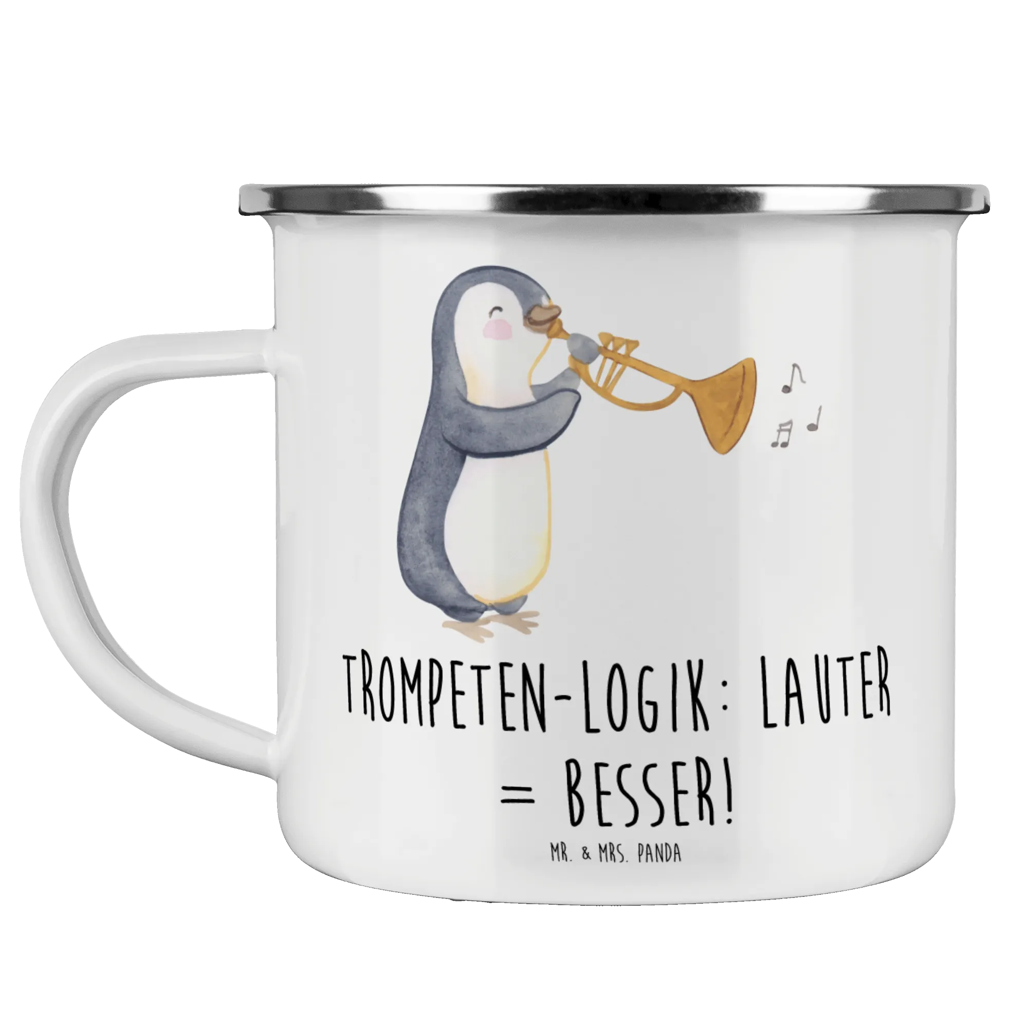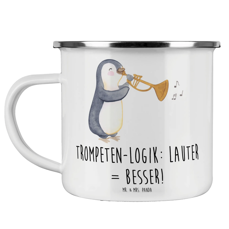 Die Tasse besteht aus kratzfester Emaille und ist super leicht sowie praktisch, wodurch sie sich perfekt für Campingausflüge oder Wanderungen eignet. Der nicht personalisierbare Druck zeigt eine schicke Trompete, die stark und durchdringend zu Freude und Feier einlädt. Das Motto "Trompeten-Logik: Lauter = Besser!" bringt das Musizieren in die Natur und sorgt für gute Stimmung.