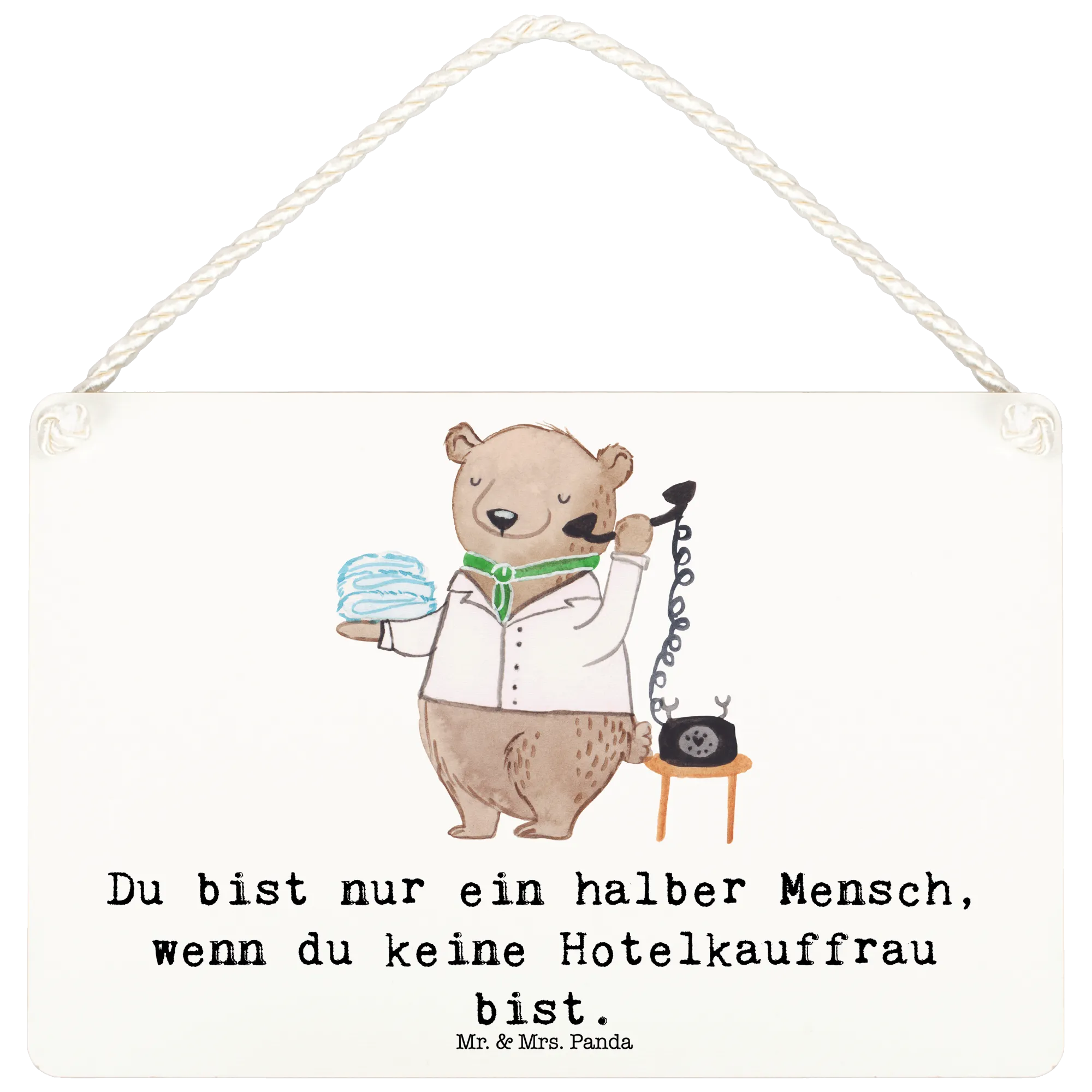 Entdecke unser bezauberndes Deko Schild "Hotelkauffrau mit Herz" von Mr. & Mrs. Panda! Dieses liebevoll gestaltete Holzschild ist das perfekte Geschenk für alle Hotelfachfrauen, Hotelfachangestellten und die, die es noch werden wollen. Es bringt nicht nur ein Lächeln ins Gesicht, sondern zeigt auch deine Wertschätzung für die engagierte Arbeit im Gastgewerbe. Mit dem spritzigen Slogan "Du bist nur ein halber Mensch, wenn du keine Hotelkauffrau bist", sorgt dieses Schild für gute Laune und positive Vibes im Büro oder zu Hause.