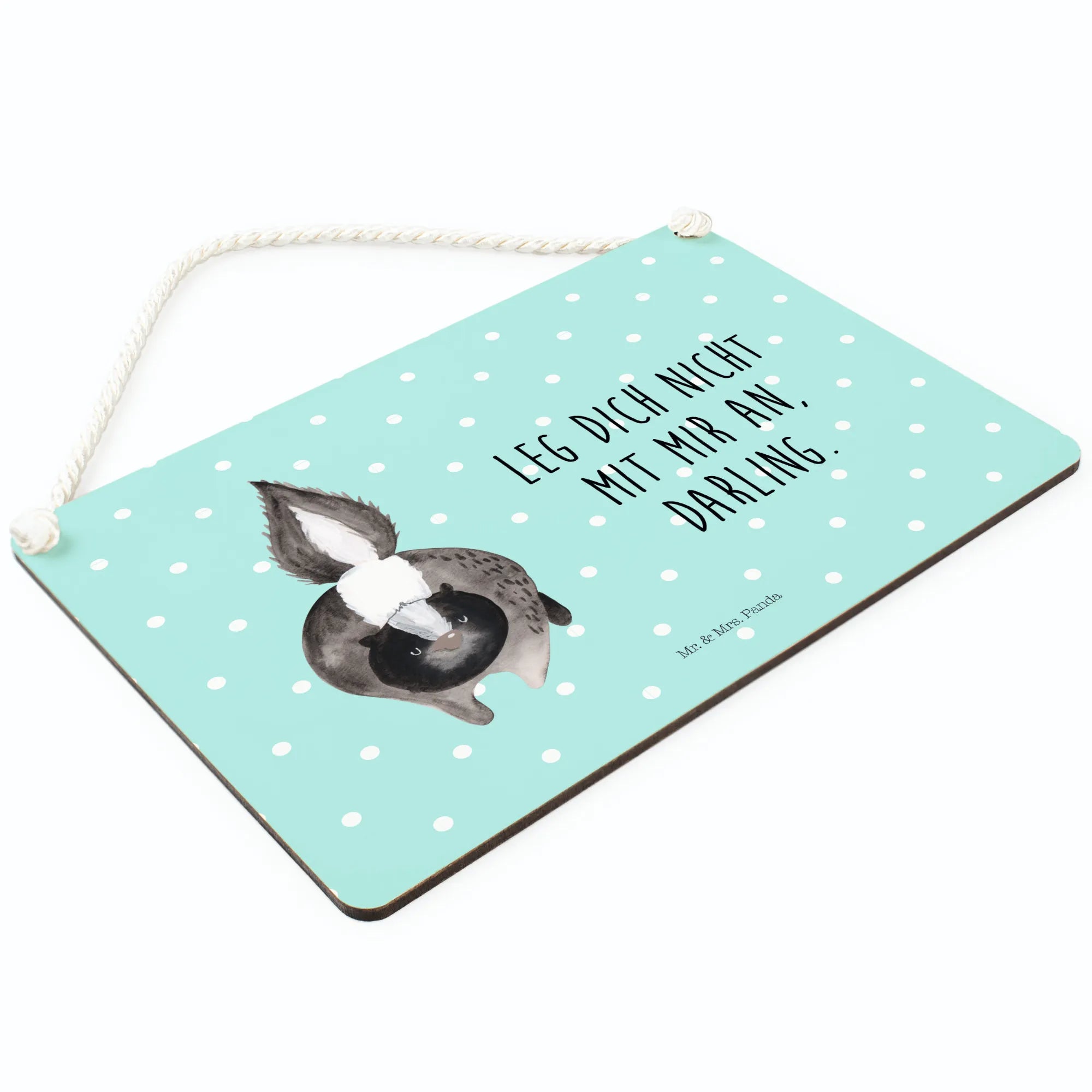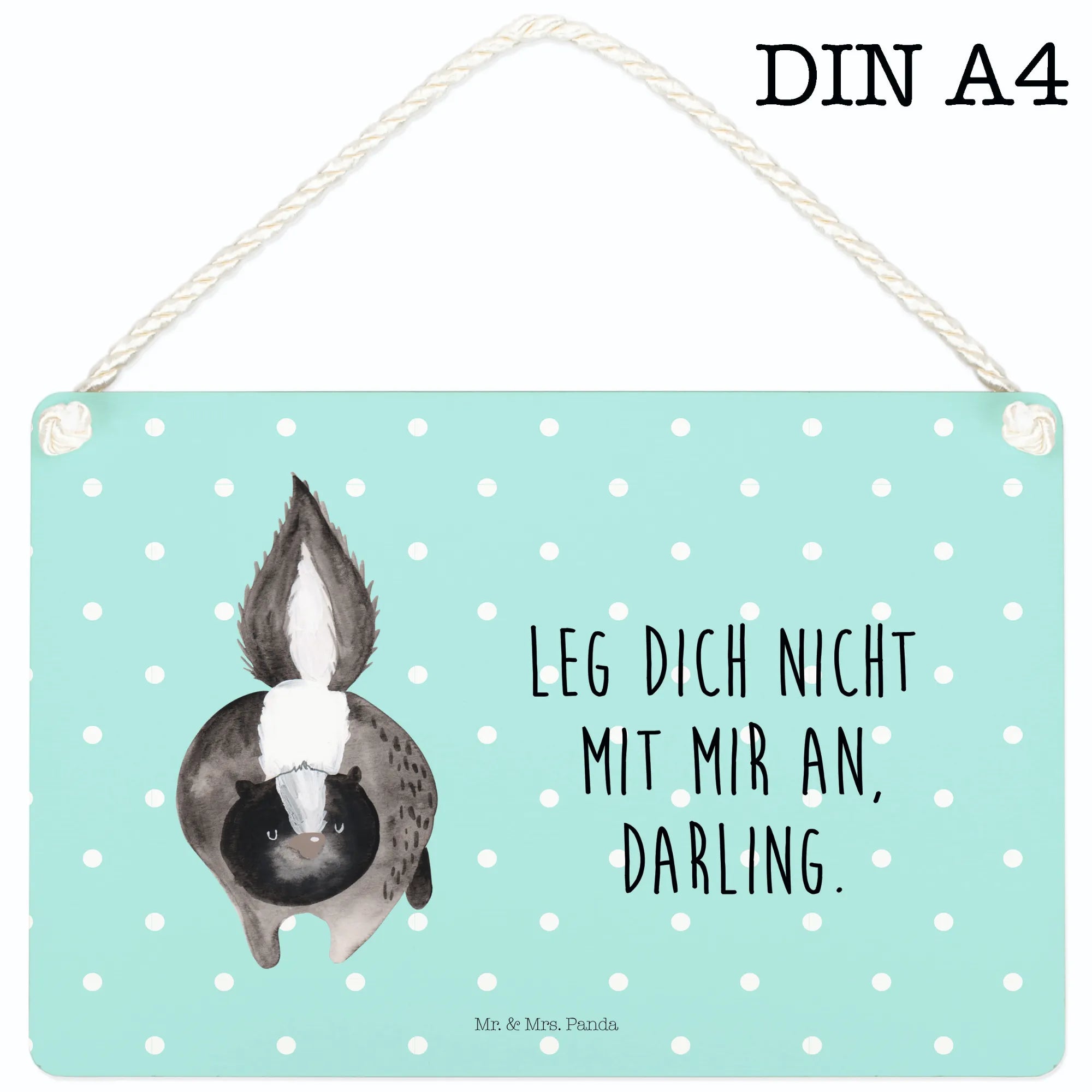 Das Deko Schild "Stinktier Angriff" aus der süßen Stinktier-Kollektion von Mr. & Mrs. Panda ist der perfekte Hingucker für jedes Zuhause. Ob als witzige Wanddeko oder als originelles Türschild - dieses Holzschild ist vielseitig einsetzbar und sorgt garantiert für gute Laune. Mit seinem charmanten Motiv eines bedrohlich aufbäumenden Stinktiers, das seinen buschigen Schwanz in die Luft hebt, kombiniert es Niedlichkeit mit einer witzigen Ansage: "Leg dich nicht mit mir an, Darling!".