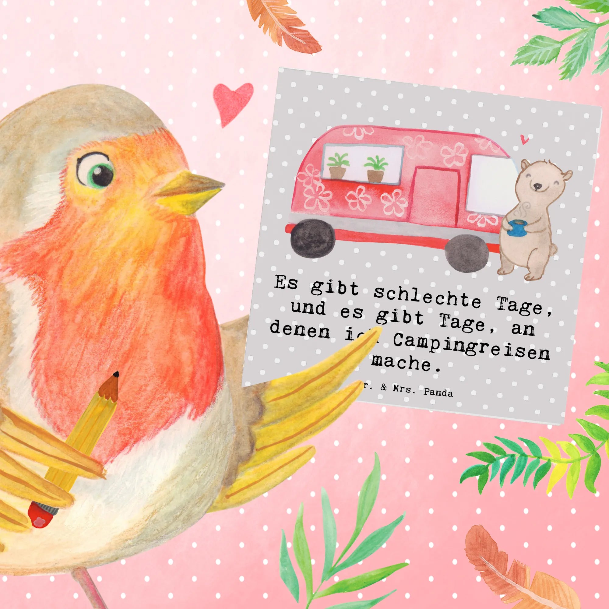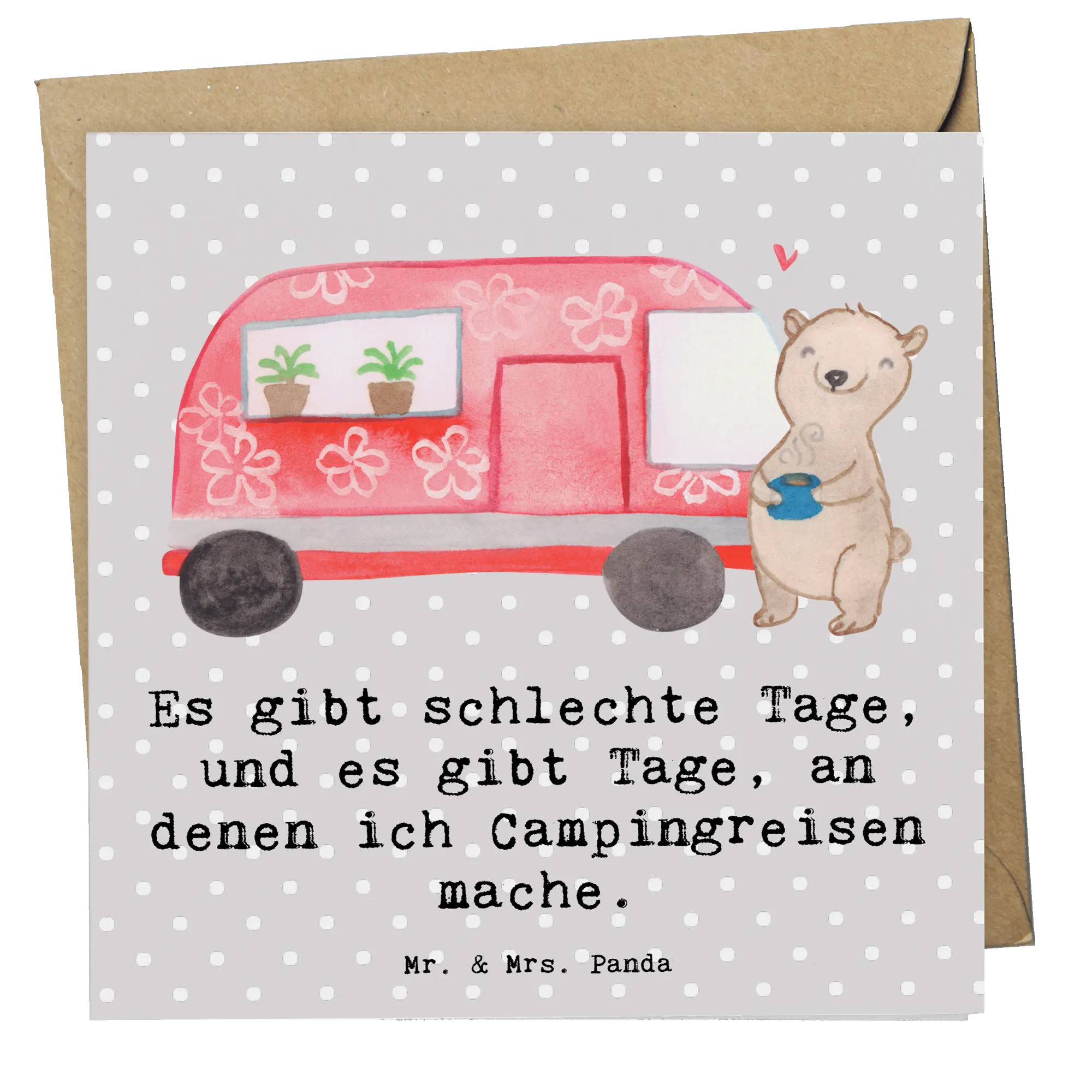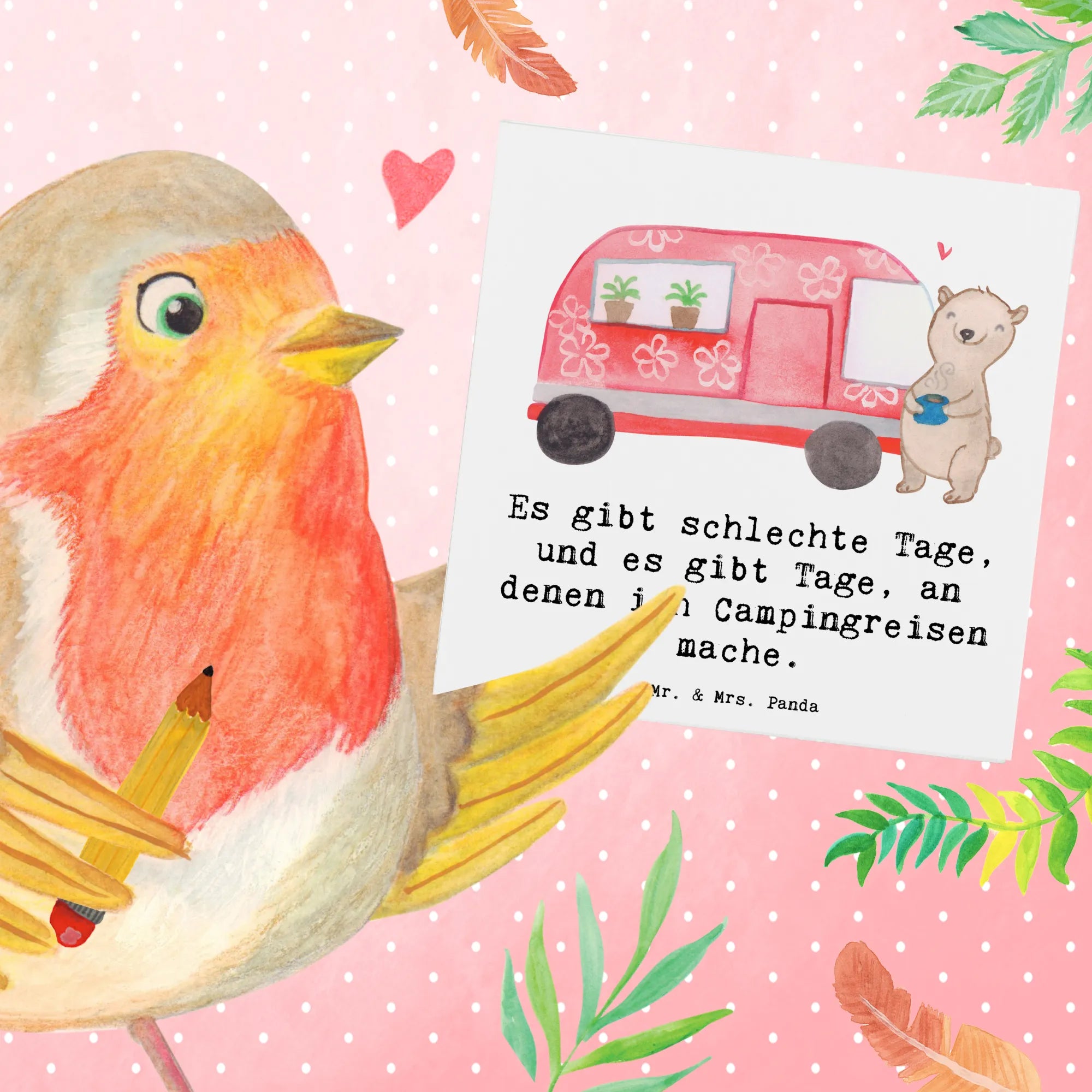 Diese Karte ist mehr als nur ein Stück Papier – sie ist eine bleibende Erinnerung an gemeinsame Erlebnisse. Und mit dem Spruch ‚Es gibt schlechte Tage, und es gibt Tage, an denen ich Campingreisen mache‘ wird umso mehr deutlich, dass das Leben auch voller schöner Momente ist, die man unterwegs erleben kann.