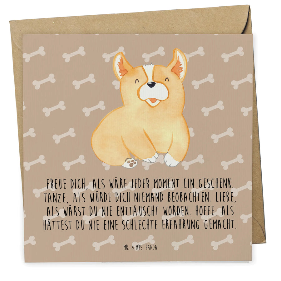 Die Vorderseite der Karte ziert ein bezaubernder Corgie und der inspirierende Spruch: "Freue dich, als wäre jeder Moment ein Geschenk. Tanze, als würde dich niemand beobachten. Liebe, als wärst du nie enttäuscht worden. Hoffe, als hättest du nie eine schlechte Erfahrung gemacht." Dieser liebevolle Spruch versprüht Lebensfreude und Motivation, perfekt für jeden Anlass. Mit der hochwertigen Kartonoptik und dem edel glänzenden Finish ist diese Karte ein echter Hingucker.