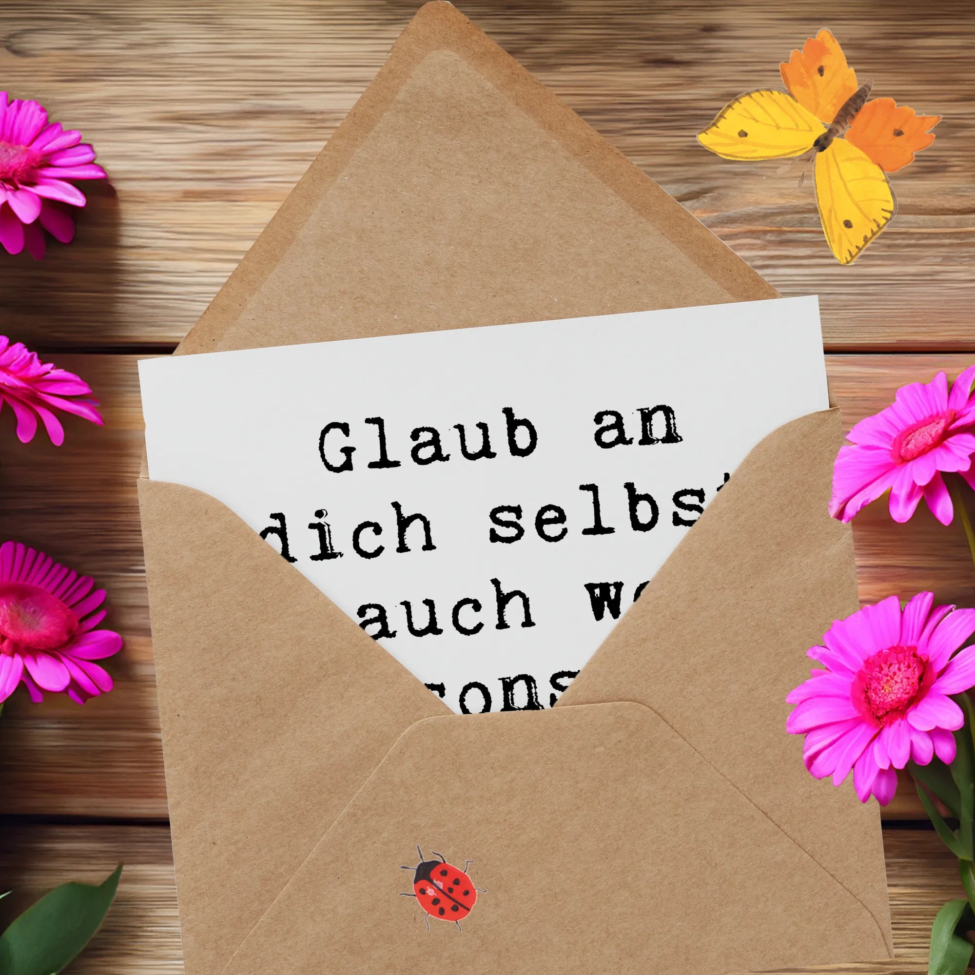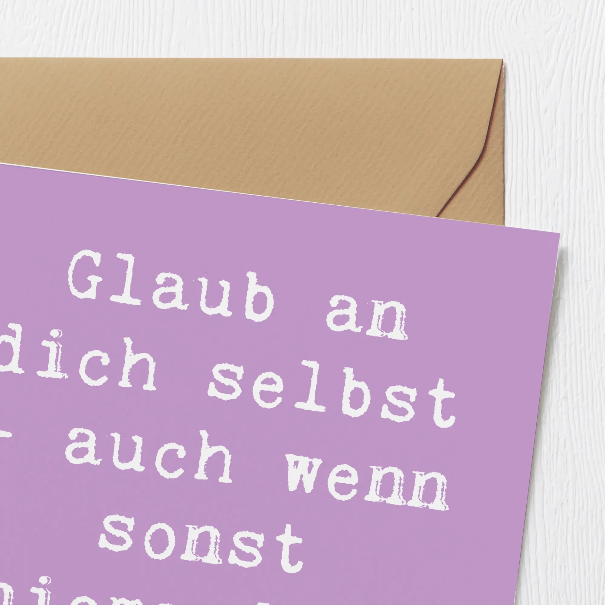 Der Spruch 'Glaub an dich selbst - auch wenn sonst niemand an dich glaubt.' ist nicht nur motivierend, sondern wirkt auch aufmunternd und wertschätzend. Diese Karte eignet sich hervorragend als Glückwunschkarte, Einladungskarte oder als persönliche Nachricht an einen Freund oder eine Freundin, die vielleicht gerade eine schwere Phase durchlebt. Mit ihrer hochglänzend veredelten Vorderseite und der matten Innenseite zur einfachen Beschriftung, lässt sich diese Karte ganz individuell gestalten.