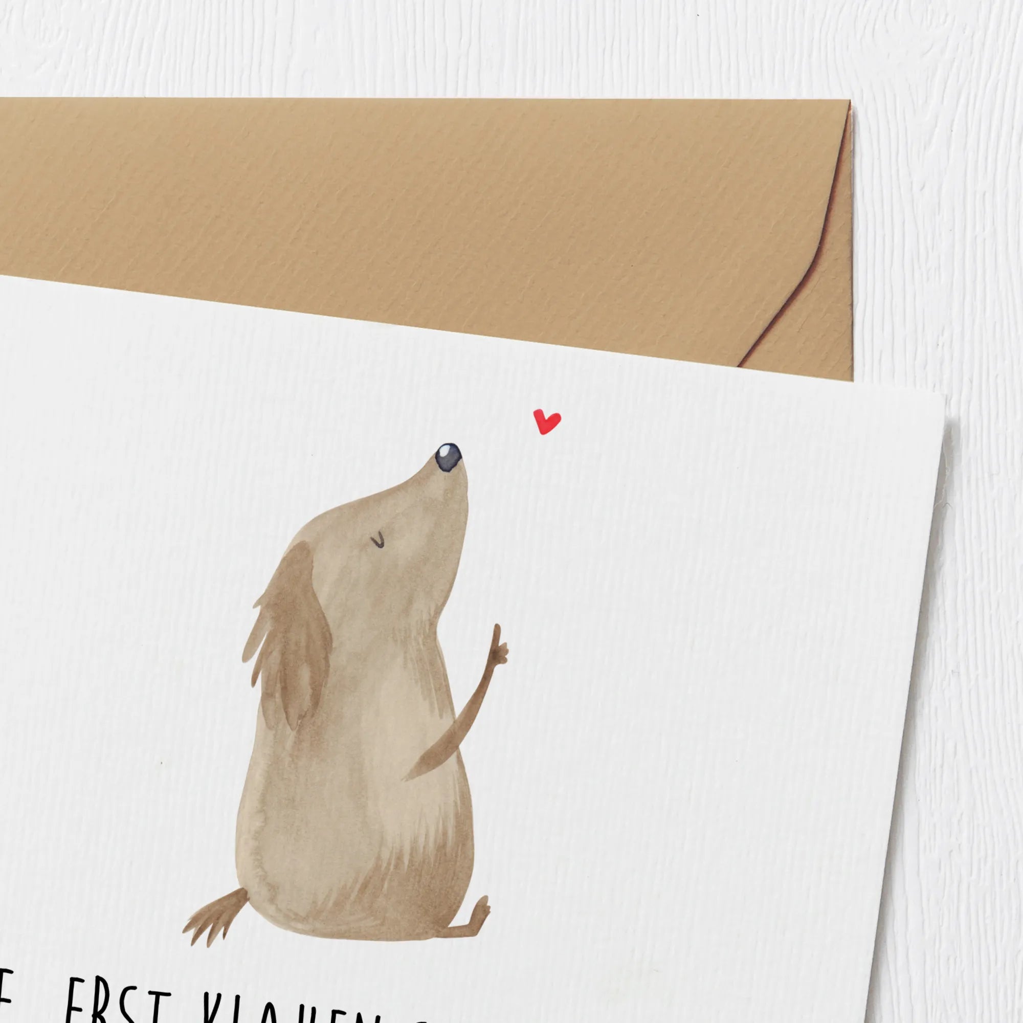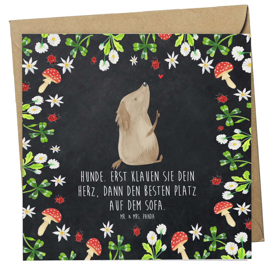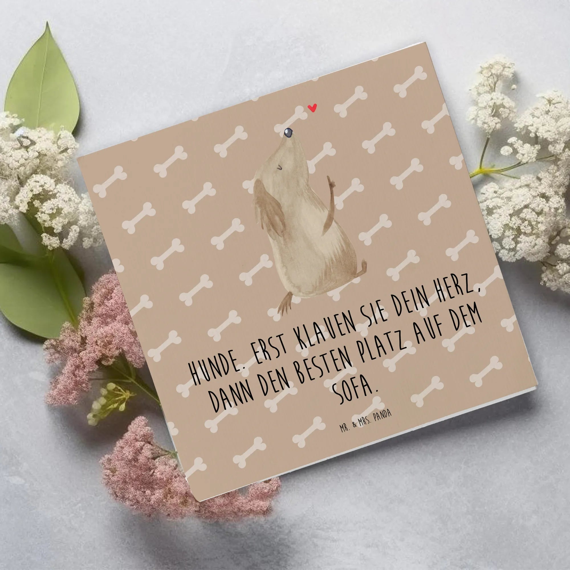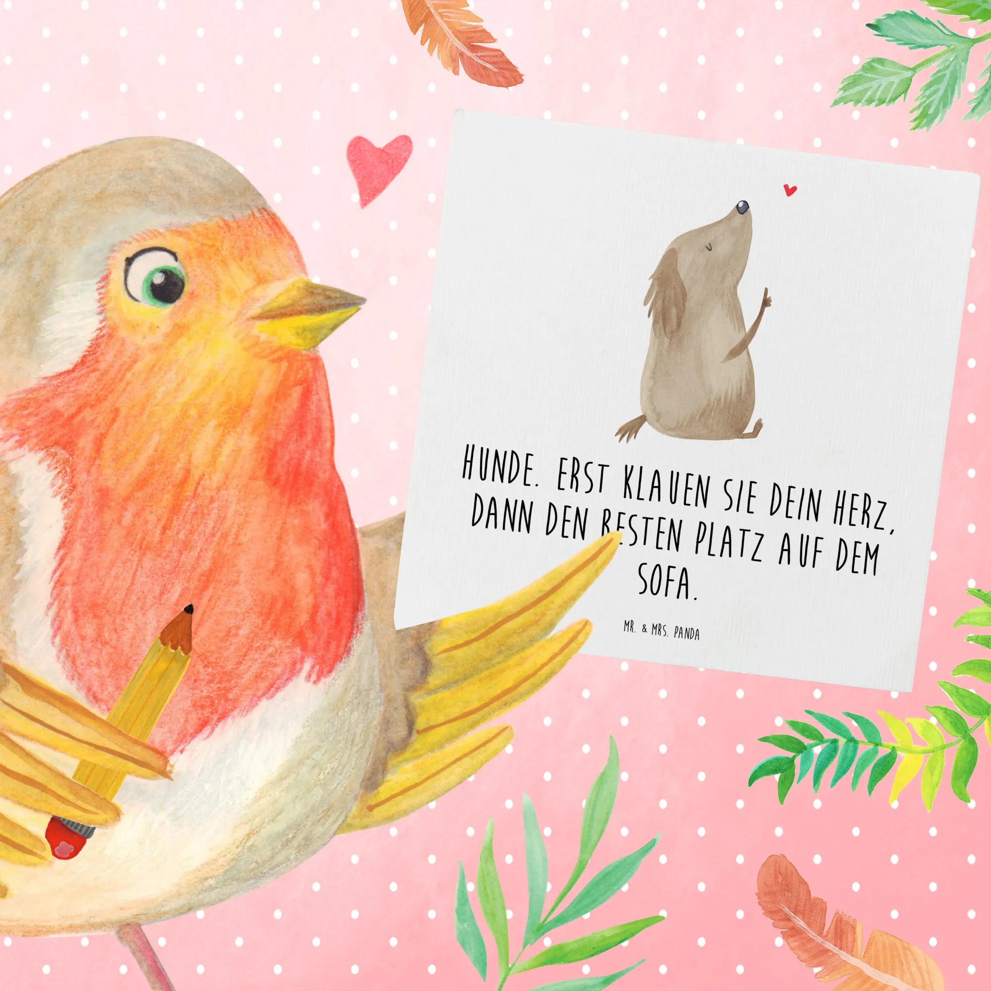 Egal ob zu einem Geburtstag, einer Hochzeit oder einfach als liebevolle Geste zwischendurch – mit dieser Karte wirst du garantiert Herzen erobern. Diese Karte besticht durch ihr süßes Hundemotiv, das einen entzückenden Hund zeigt, der auch noch ein kleines Herz präsentiert. So vermitteln die Worte "Hunde. Erst klauen sie dein Herz, dann den besten Platz auf dem Sofa." auf spielerische Art und Weise, was Hundeliebe wirklich bedeutet.