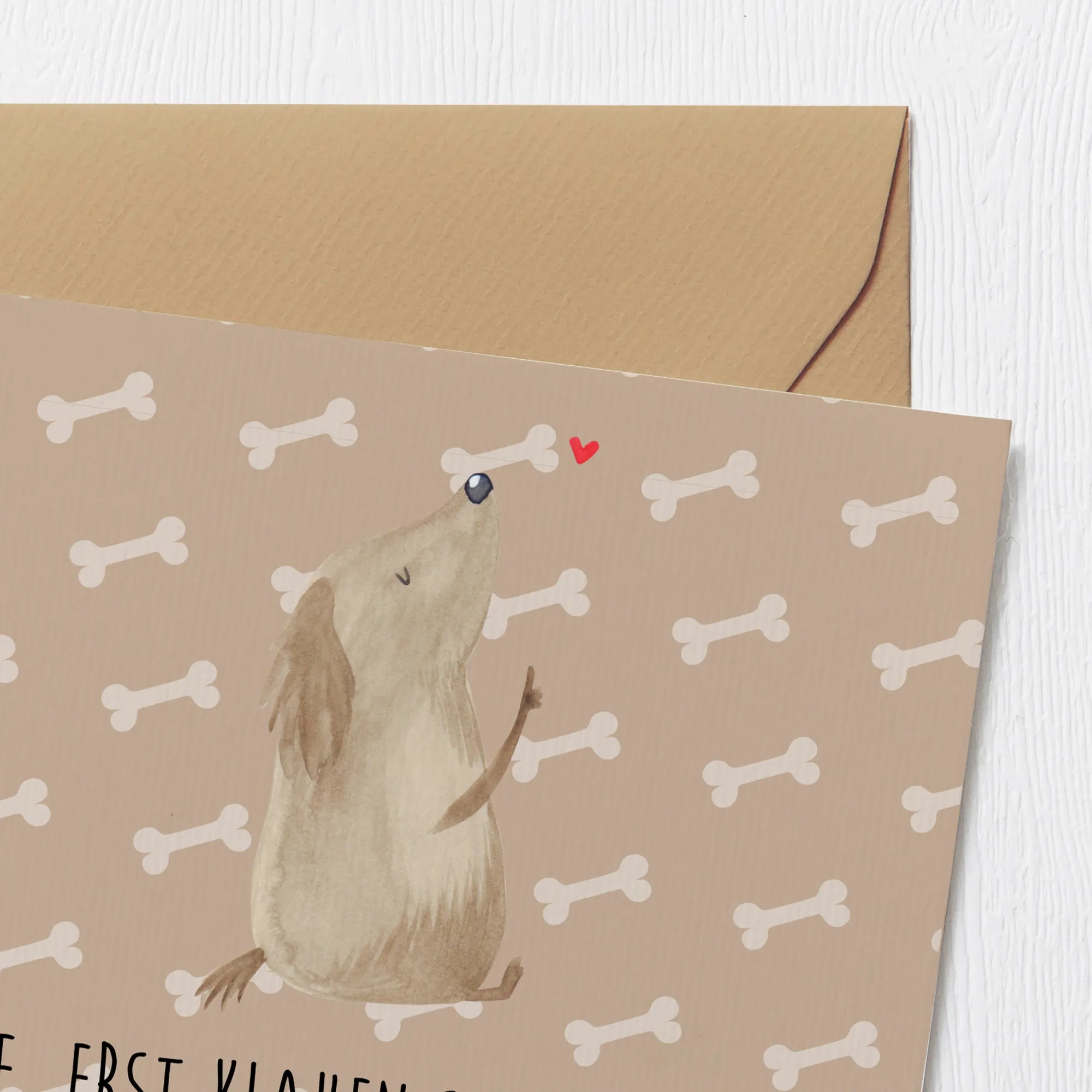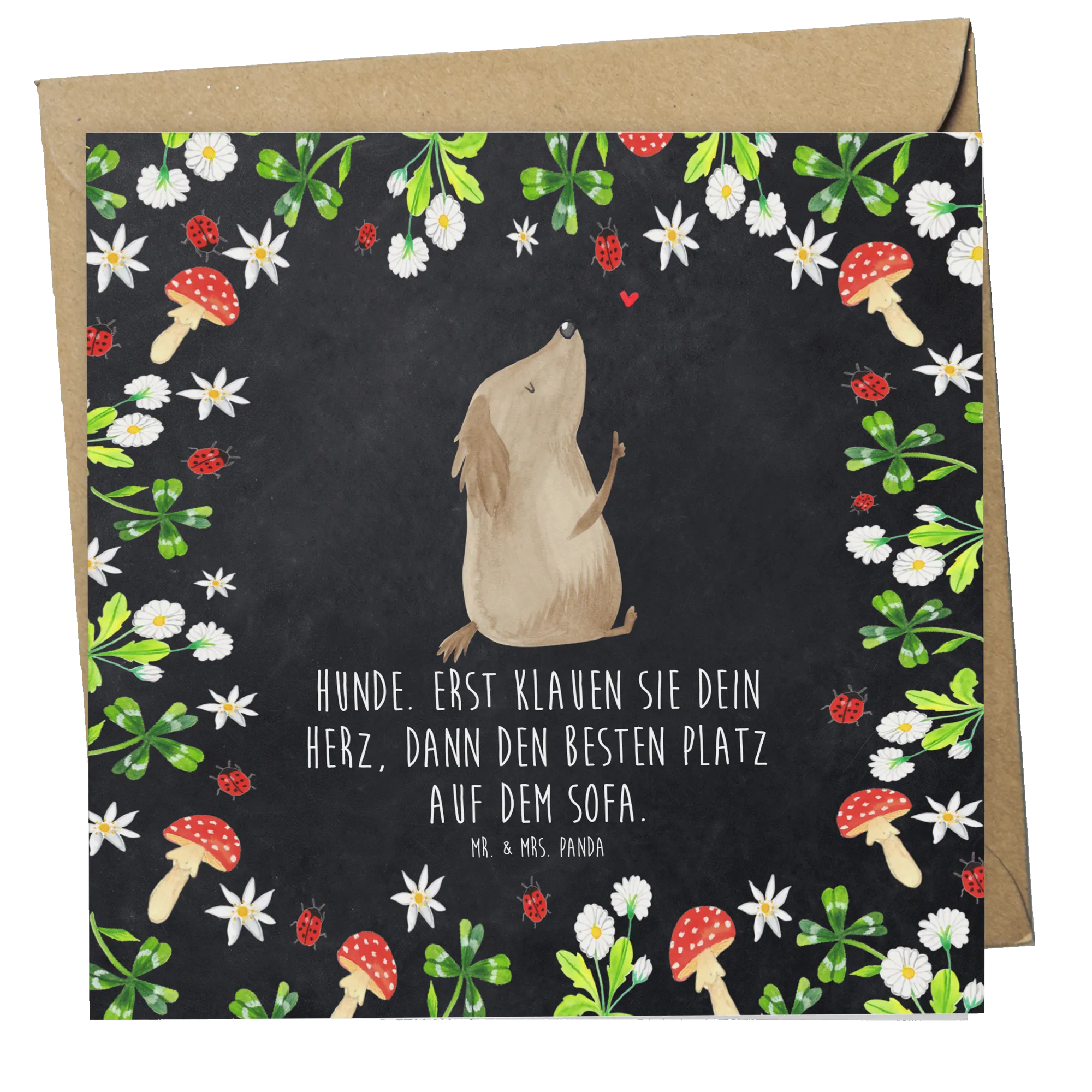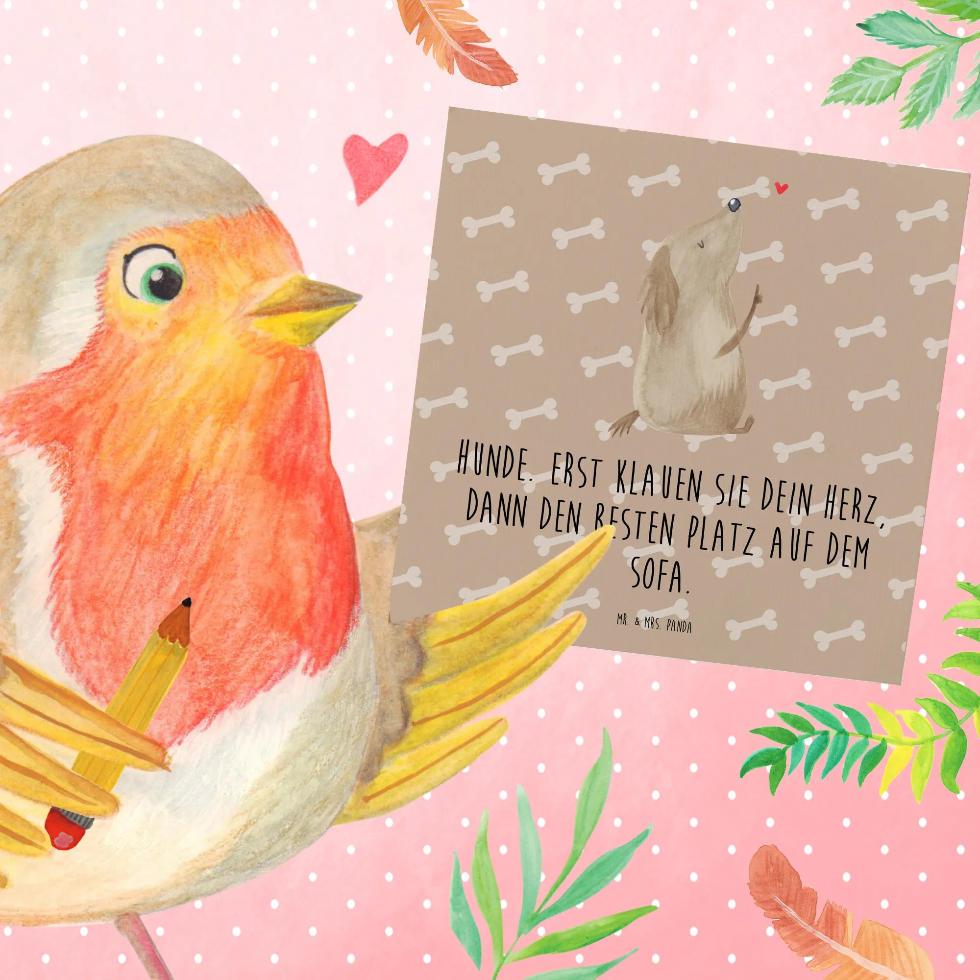 Egal ob zu einem Geburtstag, einer Hochzeit oder einfach als liebevolle Geste zwischendurch – mit dieser Karte wirst du garantiert Herzen erobern. Diese Karte besticht durch ihr süßes Hundemotiv, das einen entzückenden Hund zeigt, der auch noch ein kleines Herz präsentiert. So vermitteln die Worte "Hunde. Erst klauen sie dein Herz, dann den besten Platz auf dem Sofa." auf spielerische Art und Weise, was Hundeliebe wirklich bedeutet.