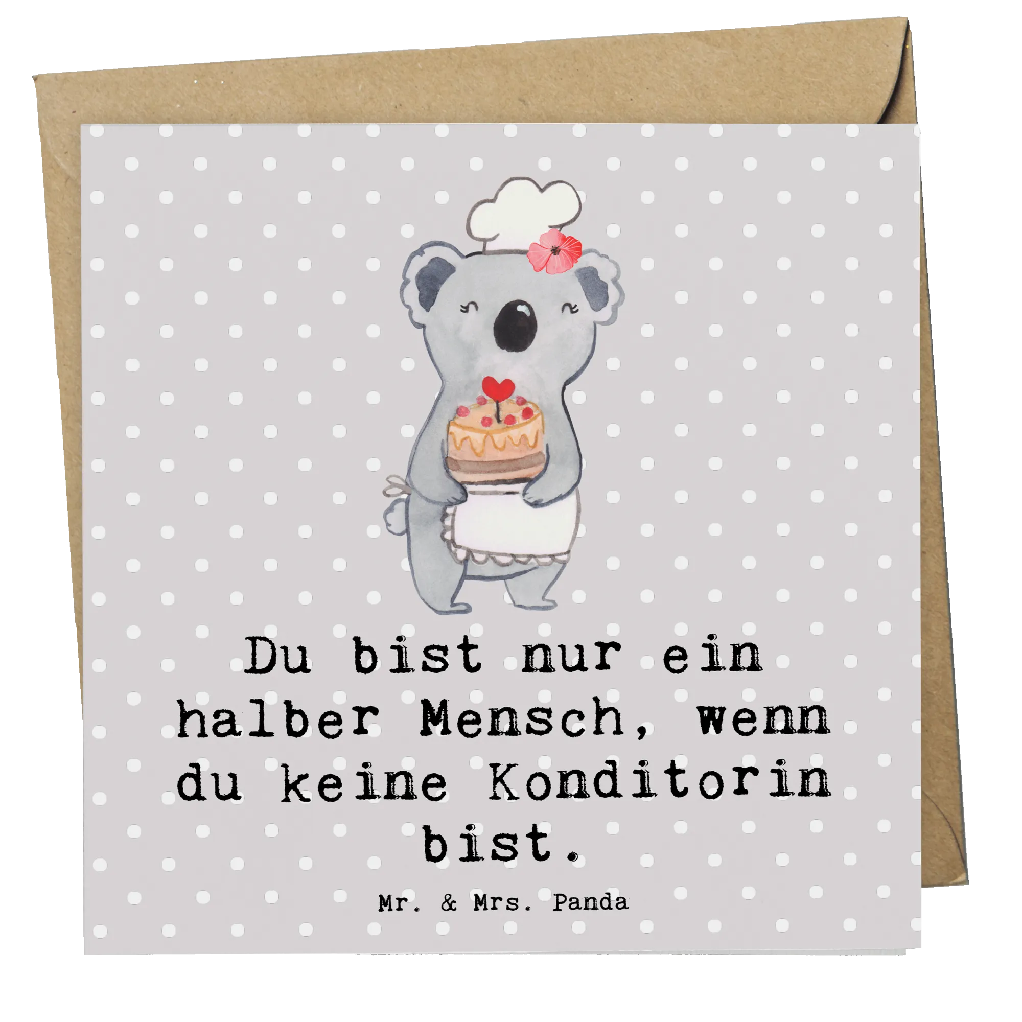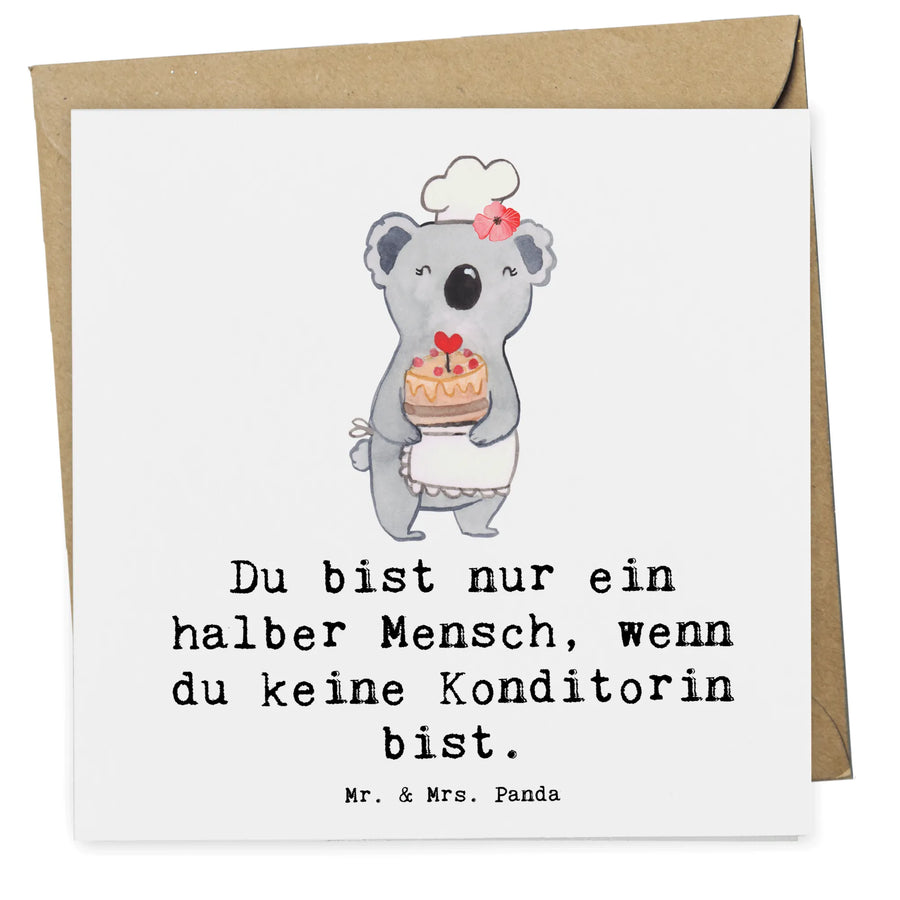 Die Karte ist quadratisch und misst 140 mm x 140 mm. Sie kommt in edler Optik und wurde aus hochwertigem 300 Gramm Karton gefertigt. Der einzigartige Druck der Vorderseite zeigt unseren süßen Koala, der stolz eine Torte hält, und wird durch den humorvollen Spruch "Du bist nur ein halber Mensch, wenn du keine Konditorin bist!" ergänzt.
