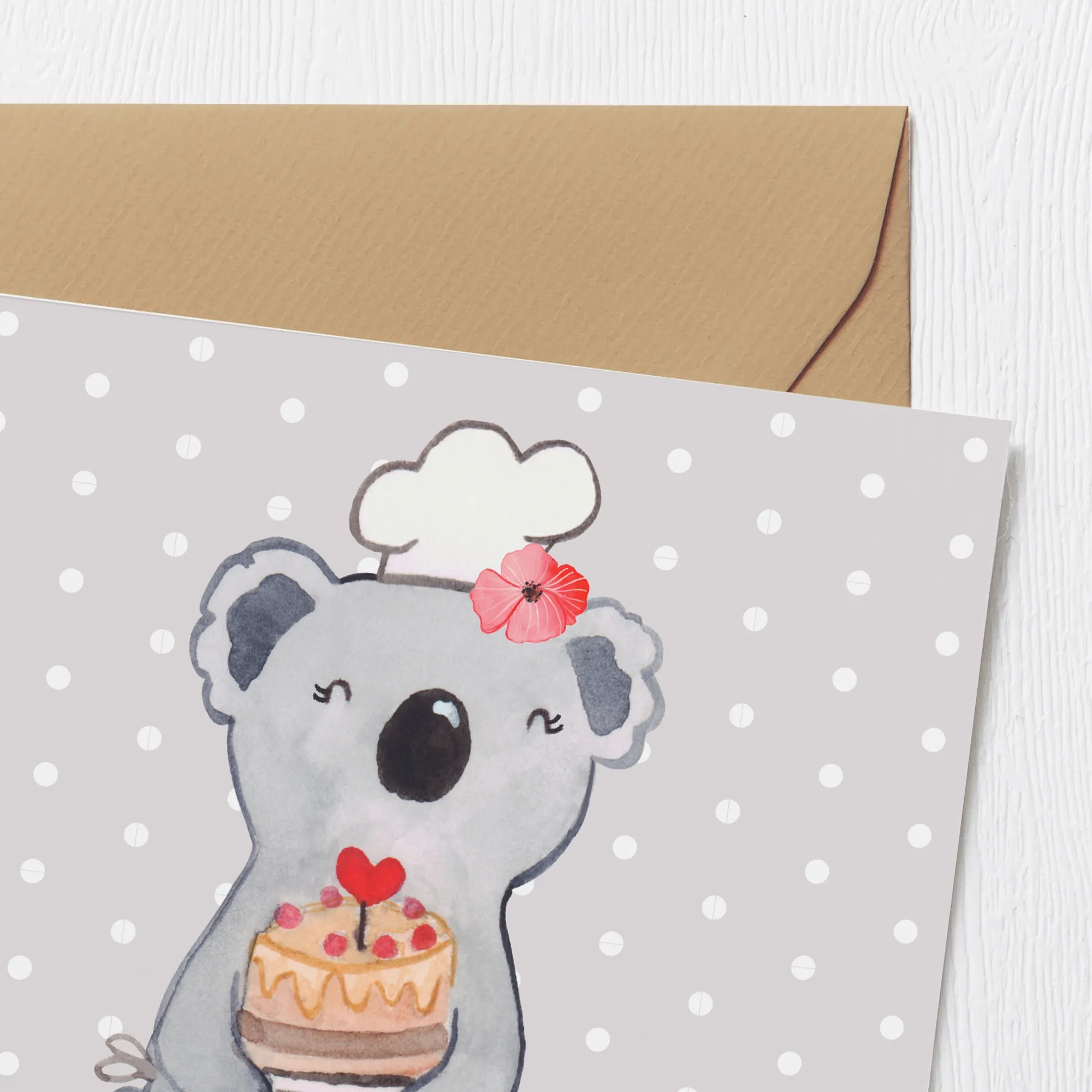 Auf der Vorderseite dieser edlen Klappkarte prangt ein süßer, handgezeichneter Koala, der stolz eine Torte in der Hand hält – ein absolut bezauberndes Motiv, das jeden Kuchenliebhaber verzaubert.