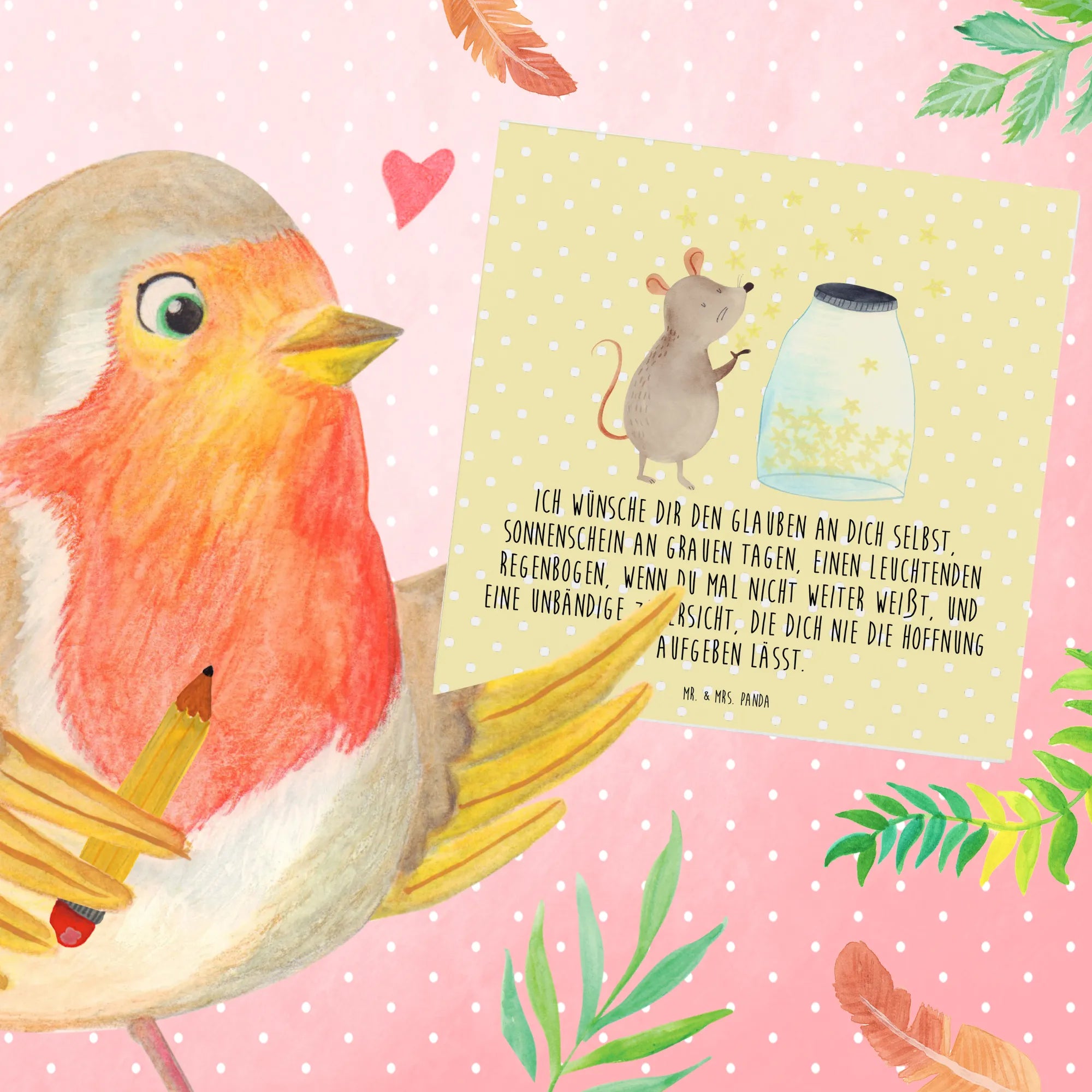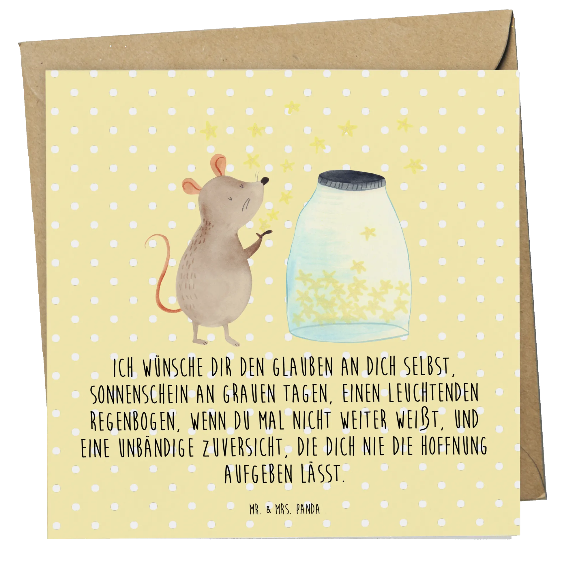 Das süße Motiv zeigt eine kleine Maus, die vor einem Glas voller funkelnder Sterne sitzt, bereit, jeden einzelnen in die Freiheit zu entlassen. Es ist nicht nur eine Karte – es ist ein kleines Kunstwerk, das Geschichten erzählen kann und die Fantasie anregt. Die Karte wird mit dem bewegenden Slogan "Ich wünsche dir den Glauben an dich selbst, Sonnenschein an grauen Tagen, einen leuchtenden Regenbogen, wenn du mal nicht weiter weißt, und eine unbändige Zuversicht, die dich nie die Hoffnung aufgeben lässt" bedruckt, perfekte Worte, die das Herz erwärmen.