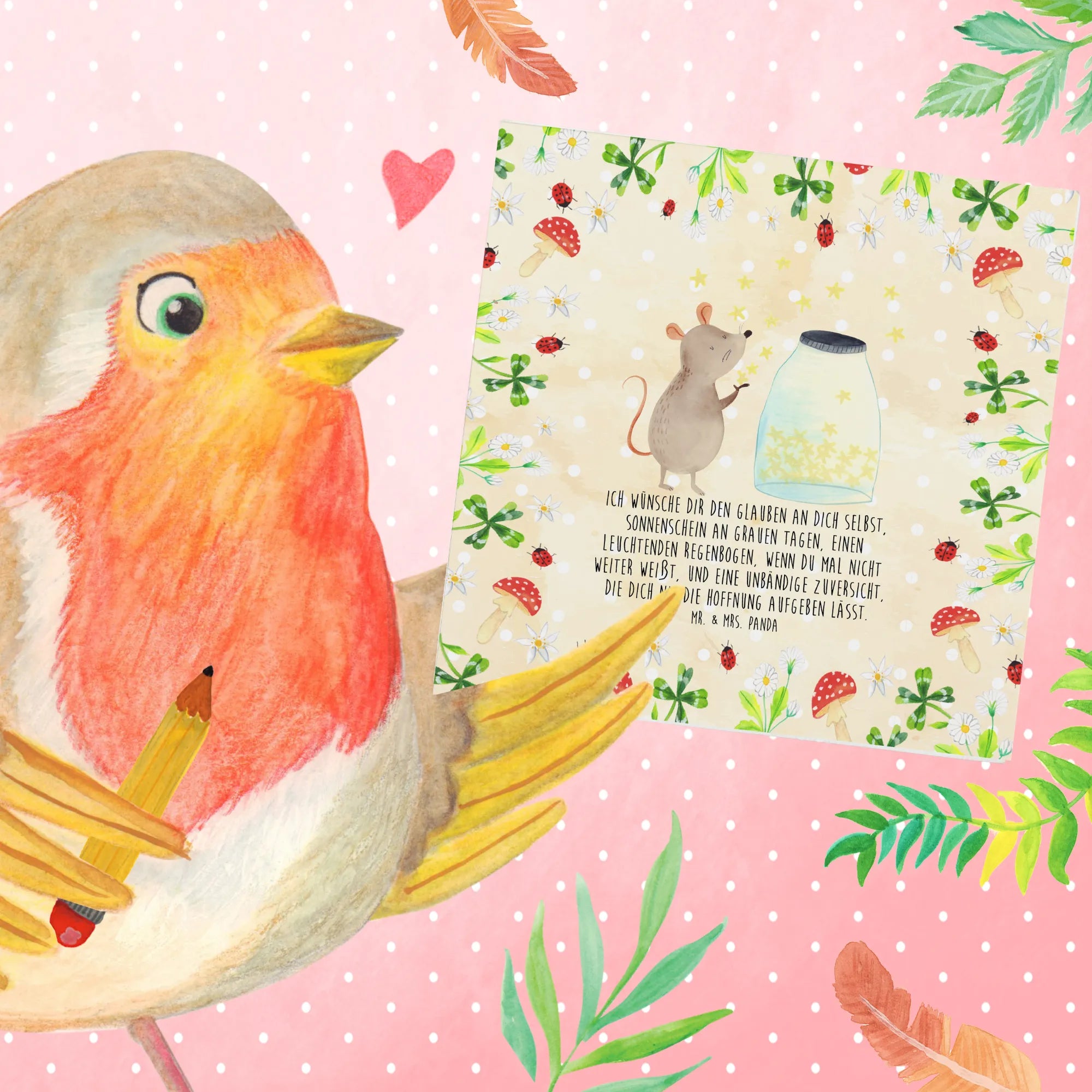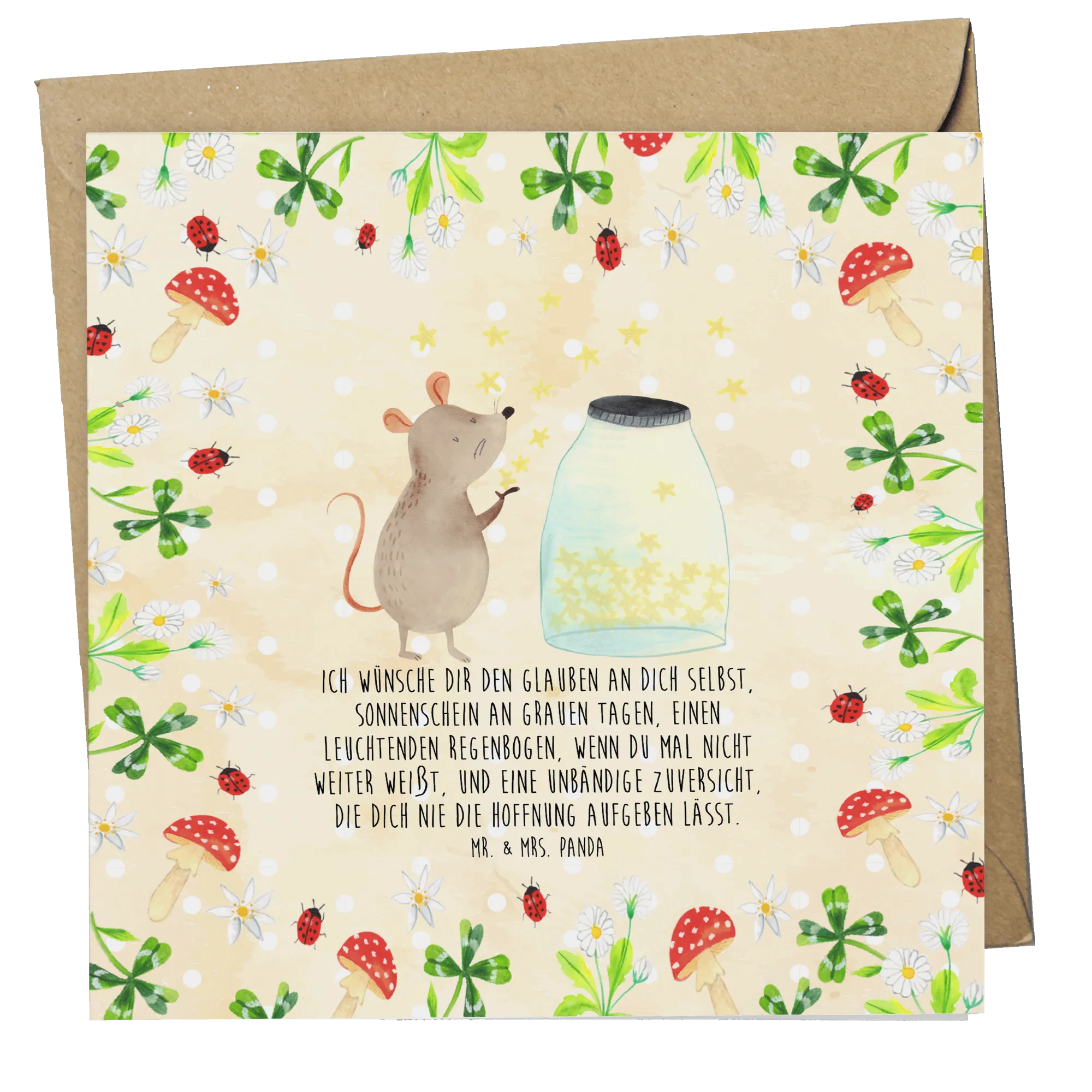 Die fröhliche Maus, die vor einem Glas mit strahlenden Sternen sitzt, symbolisiert Wünsche und Träume. Mit dem Spruch 'Ich wünsche dir den Glauben an dich selbst, Sonnenschein an grauen Tagen, einen leuchtenden Regenbogen, wenn du mal nicht weiter weißt, und eine unbändige Zuversicht, die dich nie die Hoffnung aufgeben lässt.' vermittelt diese Karte eine ganz besondere Botschaft der Hoffnung und des Optimismus.