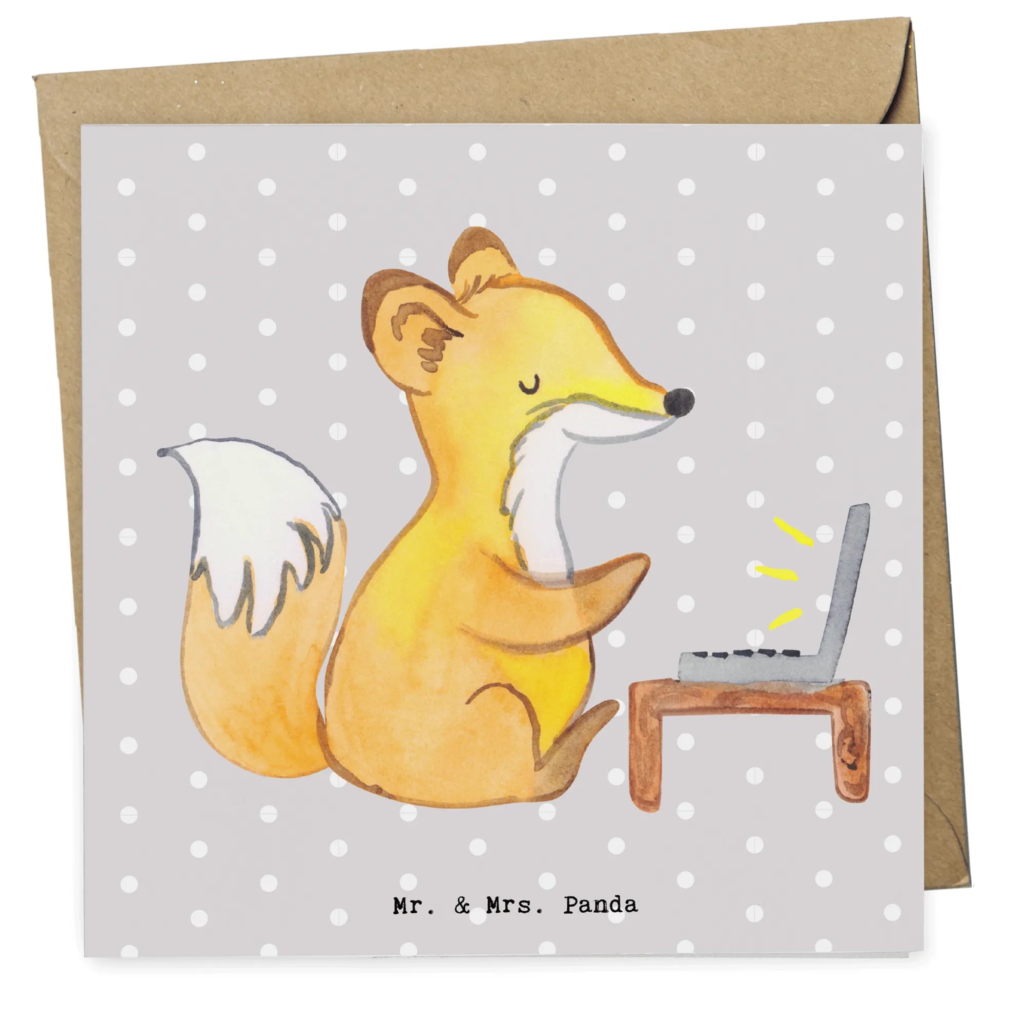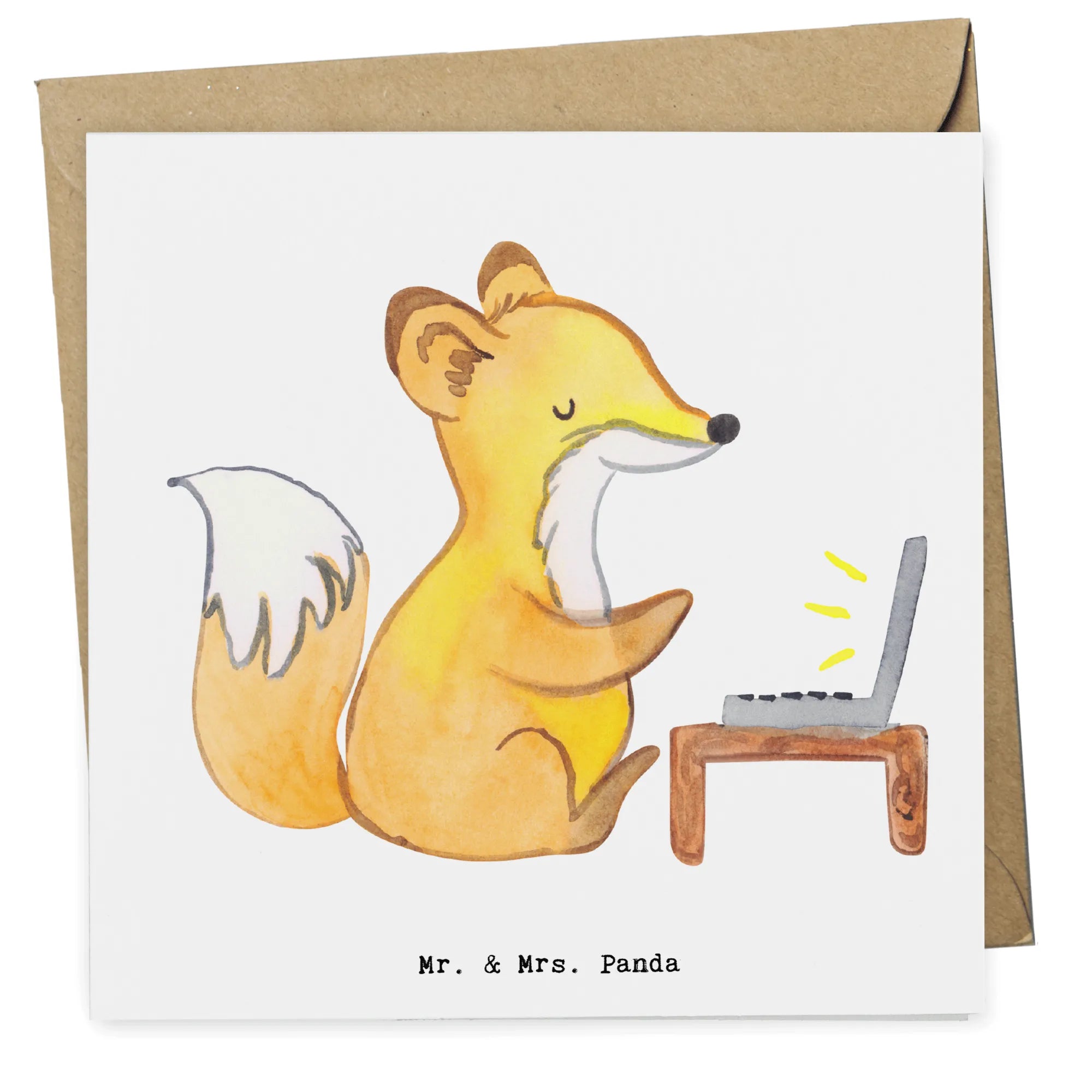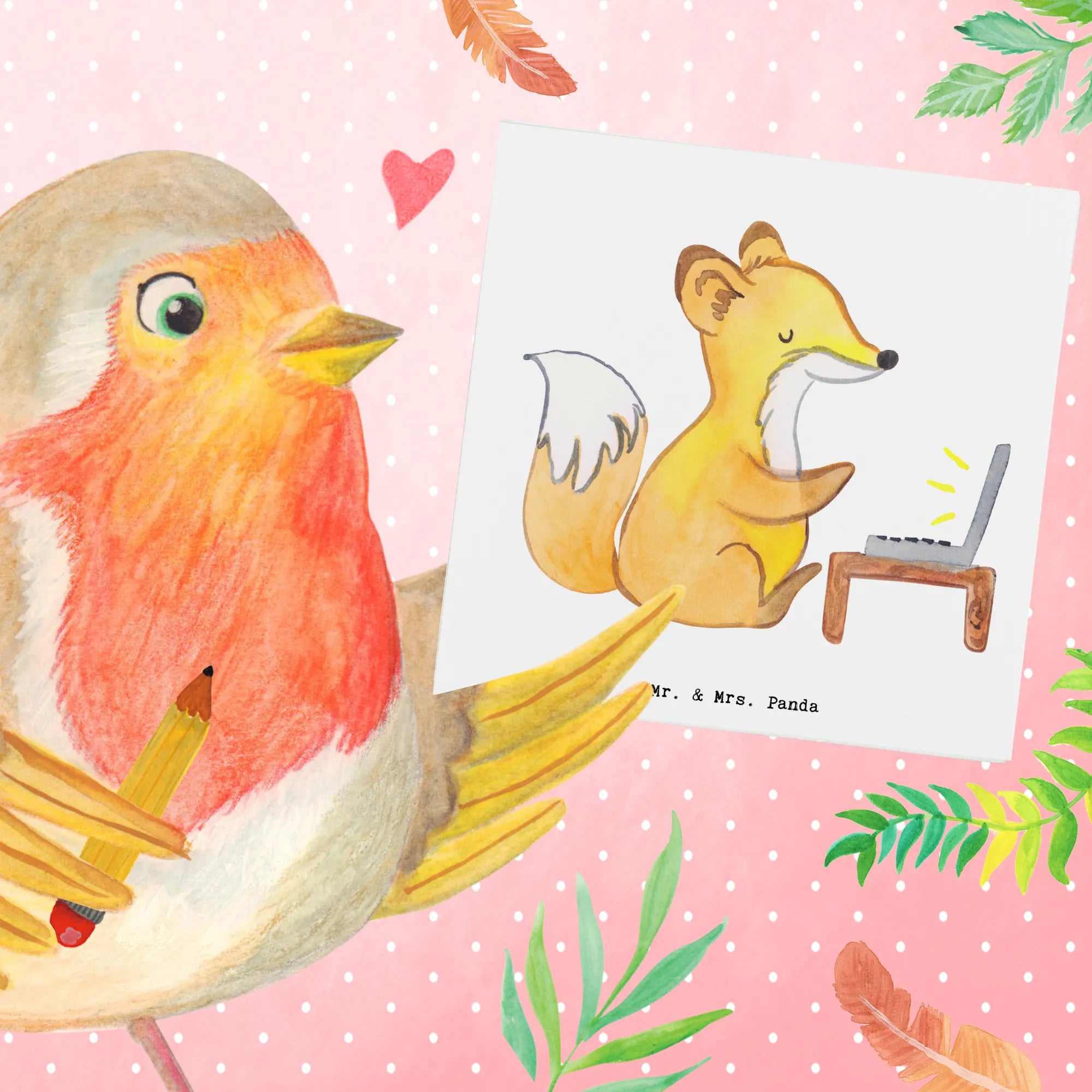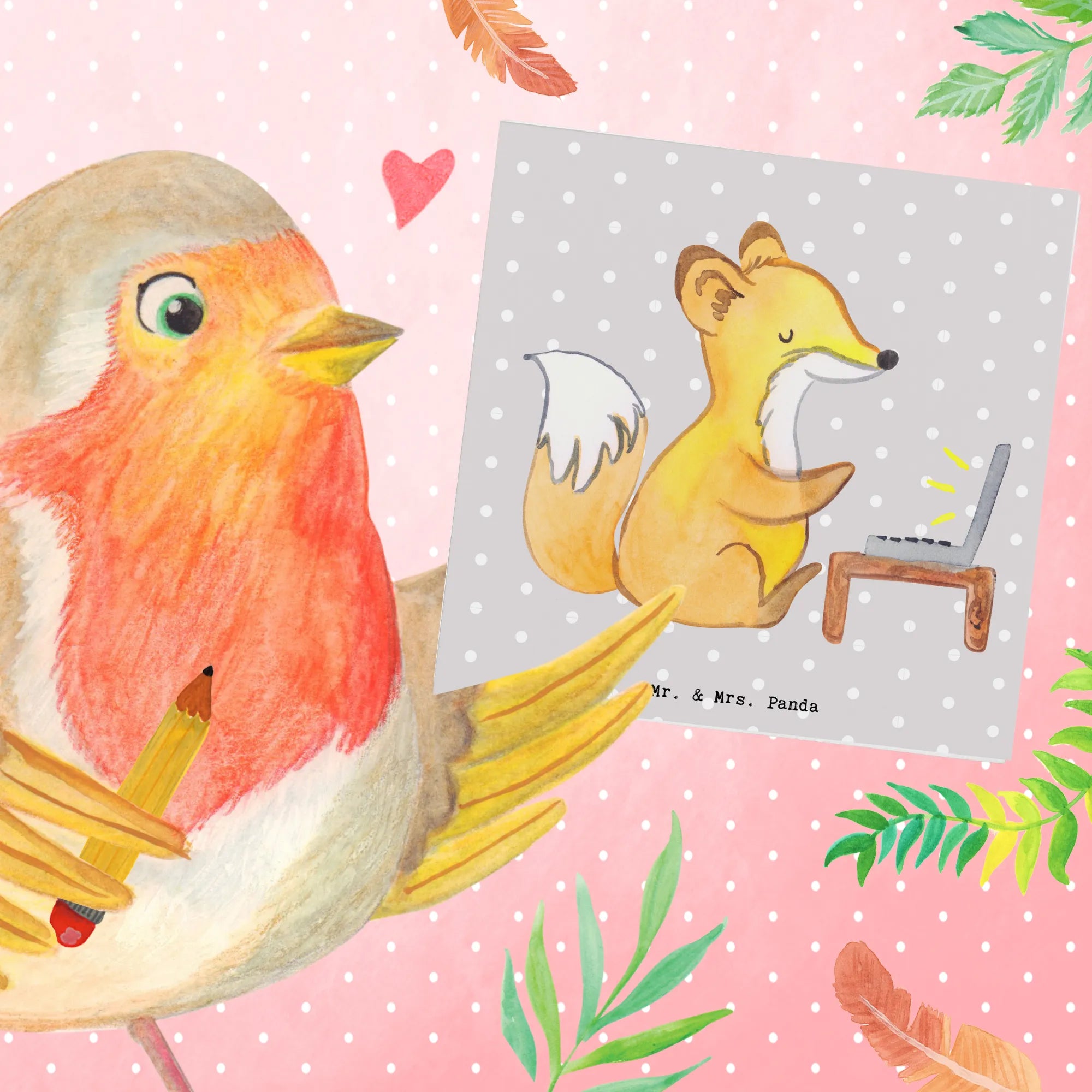 Die Karte hat die ideale Größe von 140 mm x 140 mm und besticht durch ihr edles Design. Auf der Vorderseite strahlt ein süßer Fuchs, der an einer Schreibmaschine arbeitet und mit viel Liebe zum Detail handgezeichnet wurde. Der Slogan "Du bist nur ein halber Mensch, wenn du keine Redakteurin bist" bringt nicht nur ein Schmunzeln, sondern zeigt auch, wie wichtig Redakteurinnen in unserer schnelllebigen Informationsgesellschaft sind.