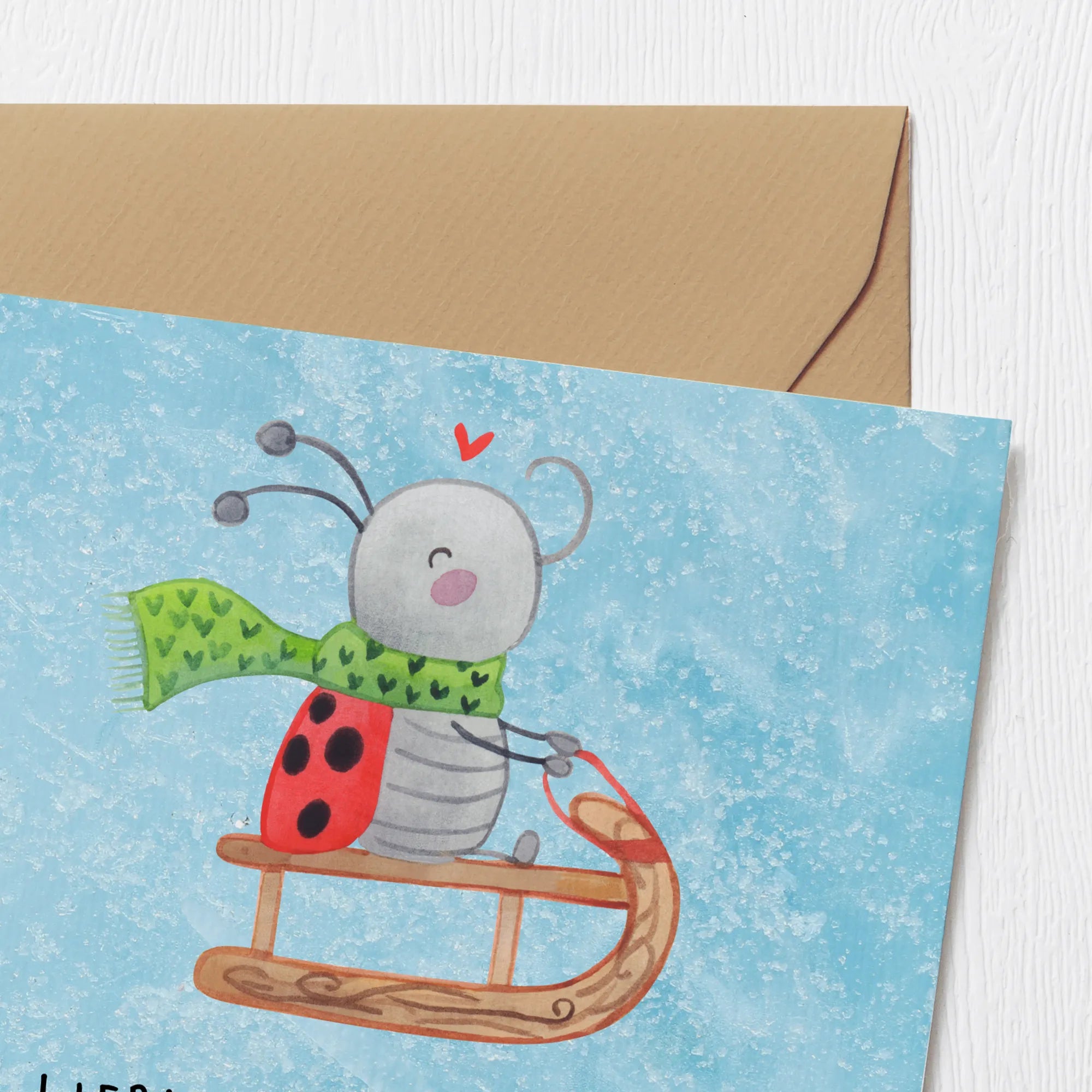 Mit einem liebevoll gestalteten Motiv zeigt die Karte unseren süßen Marienkäfer Smörle, der mit strahlendem Lächeln auf seinem Schlitten durch die verschneite Landschaft fährt. Sein grüner Schal, geschmückt mit kleinen Herzchen, und das schwebende Herz über seinem Kopf fangen die fröhliche Stimmung der Winterzeit ein.