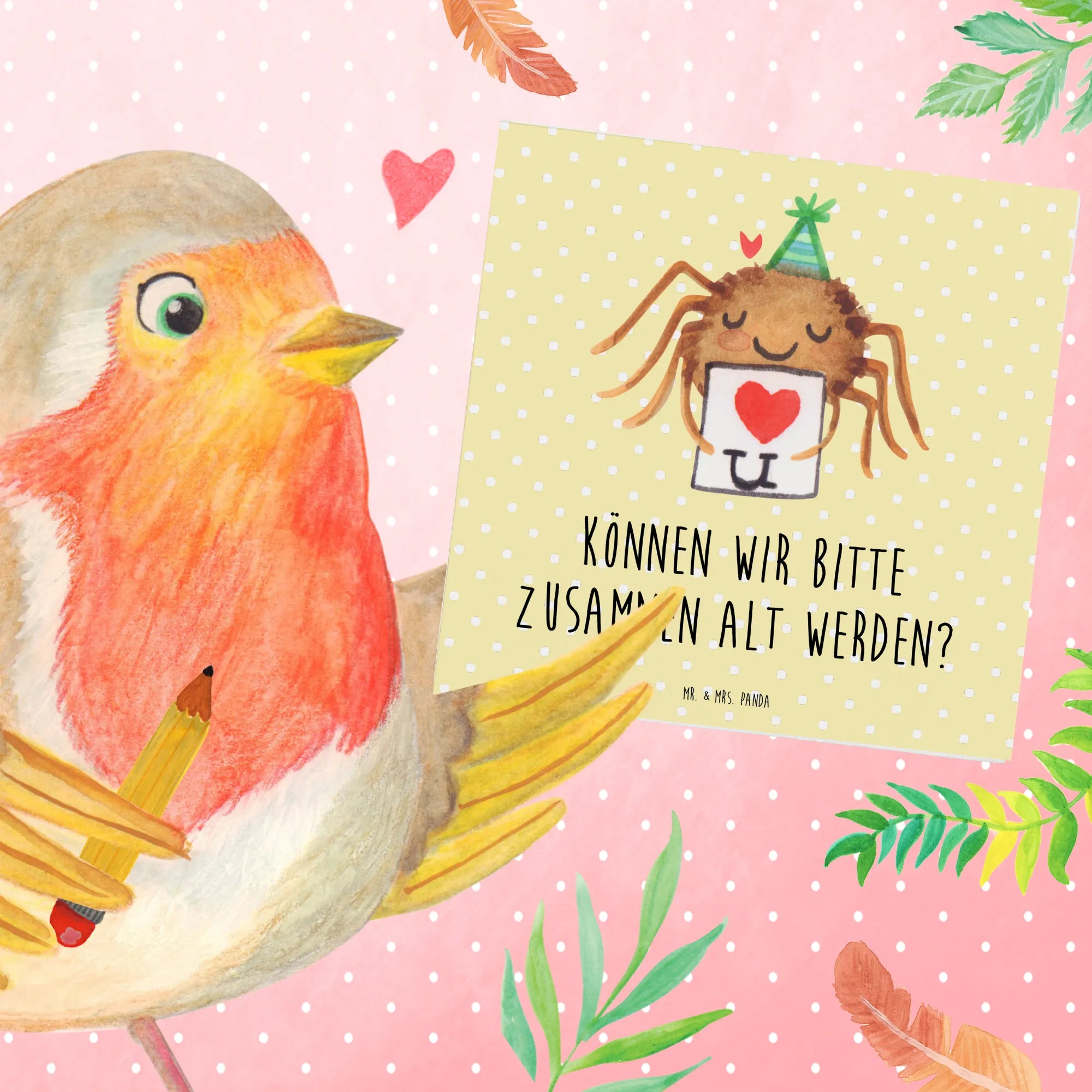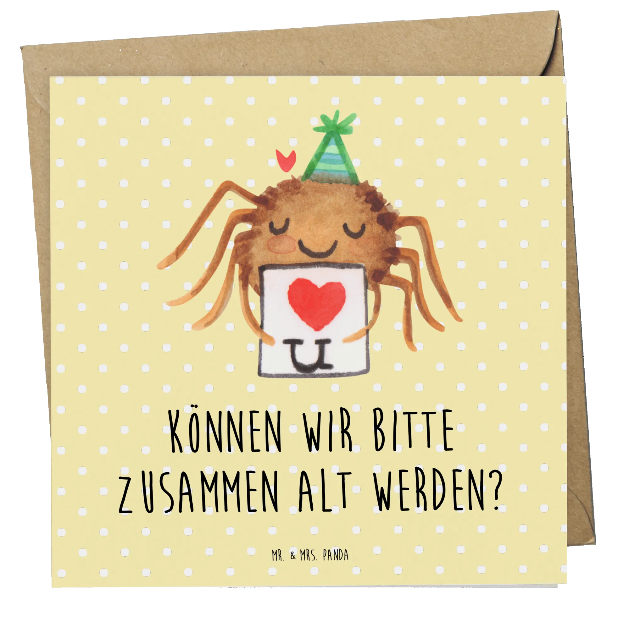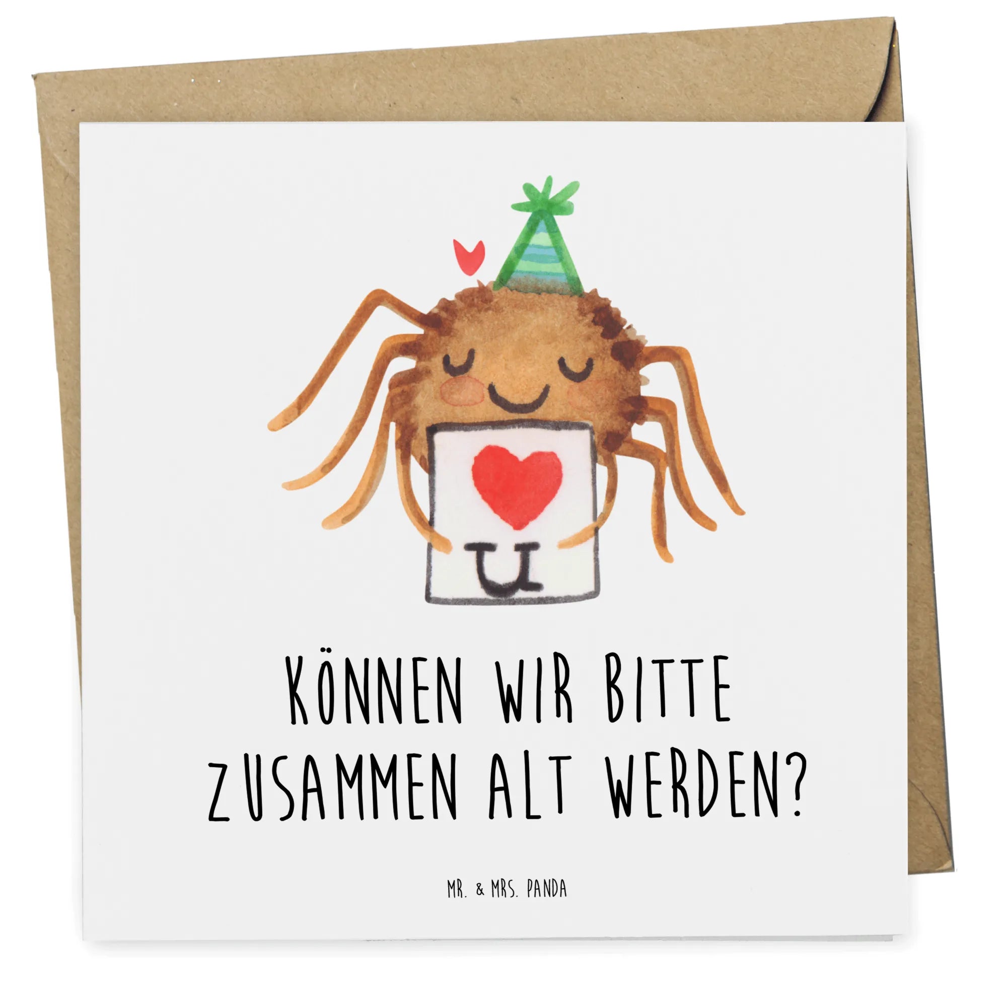 Handgezeichnet von Mrs. Panda, ist die niedliche Spinne Agathe mit ihrem kleinen Brief und dem süßen Herzchen darauf ein wahrer Blickfang. Der Spruch "Können wir bitte zusammen alt werden?" bringt die innige Botschaft des Verliebtseins zum Ausdruck und macht die Karte zu einem ganz besonderen Liebesgeschenk.