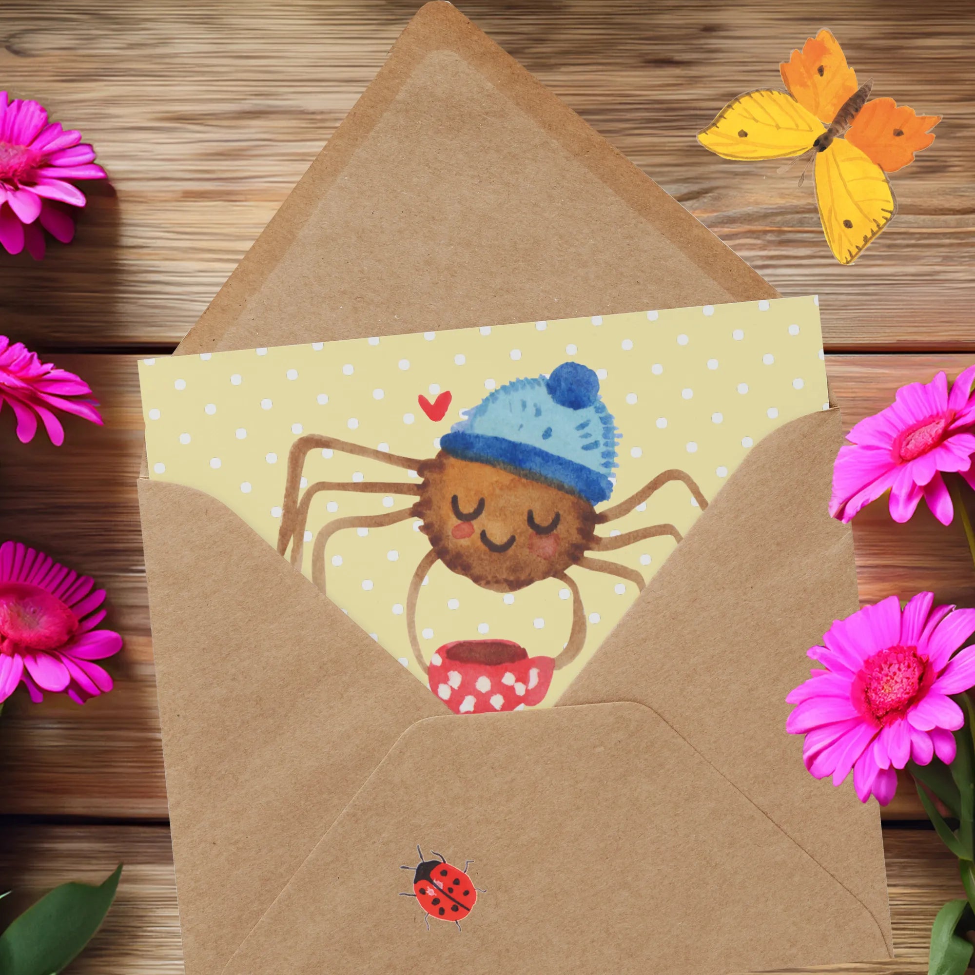 Deluxe Karte Spinne Agathe Kaffee - mit Spruch - Gelb Pastell