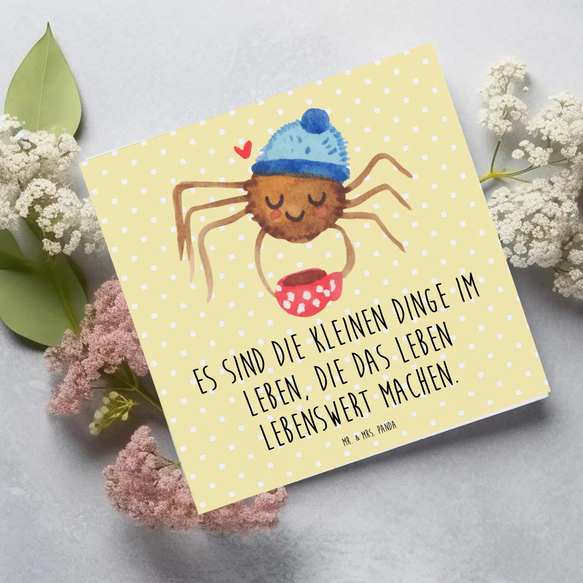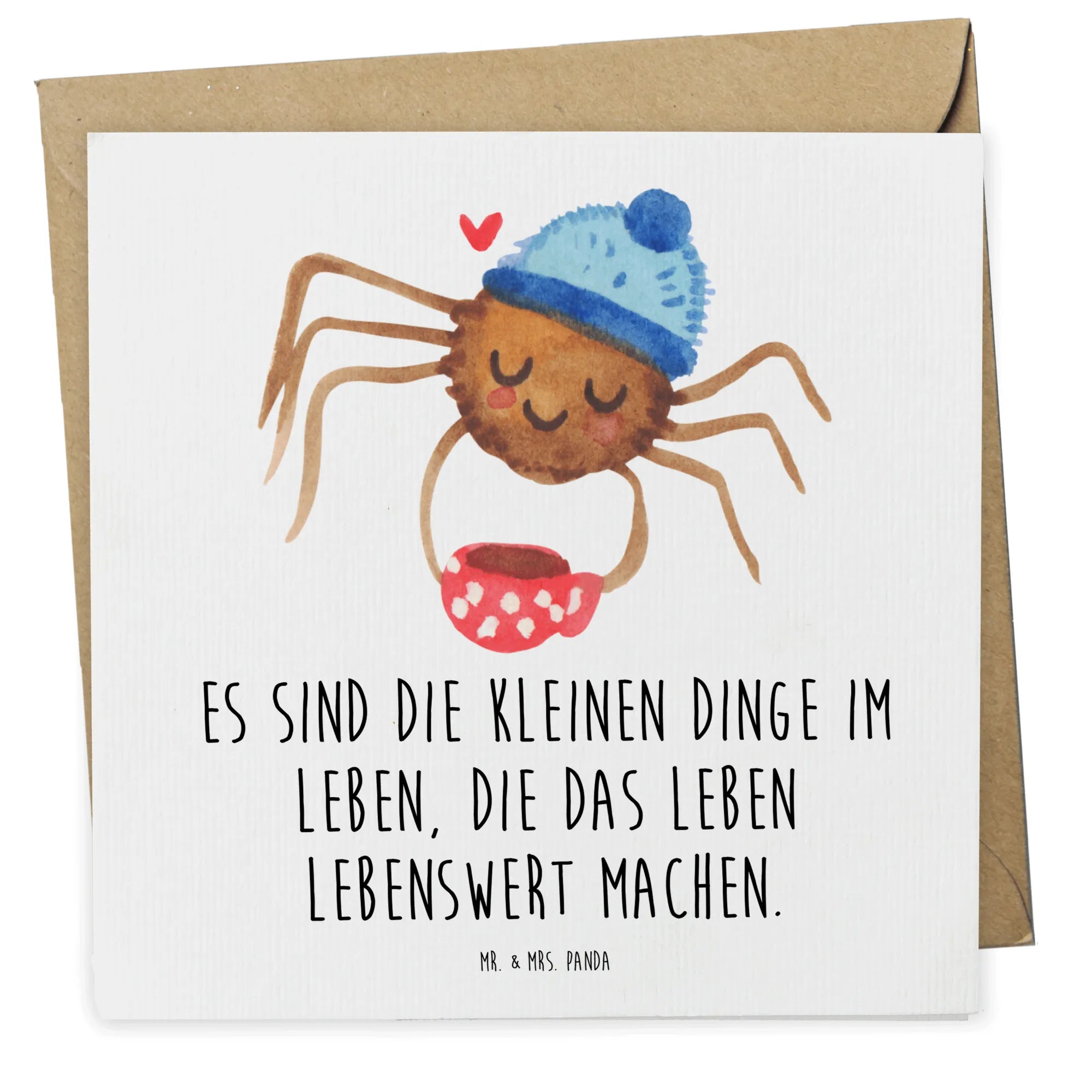 Die Deluxe Karte mit dem süßen Motiv Spinne Agathe Kaffee aus der einzigartigen Kollektion Spinne Agathe von Mr. & Mrs. Panda ist der perfekte Begleiter für all deine feierlichen Anlässe. Mit der zauberhaften Illustration der niedlichen Spinne Agathe, die genüsslich einen Kaffee trinkt, zaubert diese Karte jedem ein Lächeln ins Gesicht. Agathe, mit ihrer Wollmütze und dem kleinen Herz neben sich, bringt nicht nur Freude, sondern auch eine wertvolle Lebensweisheit mit: 'Es sind die kleinen Dinge im Leben, die das Leben lebenswert machen.'