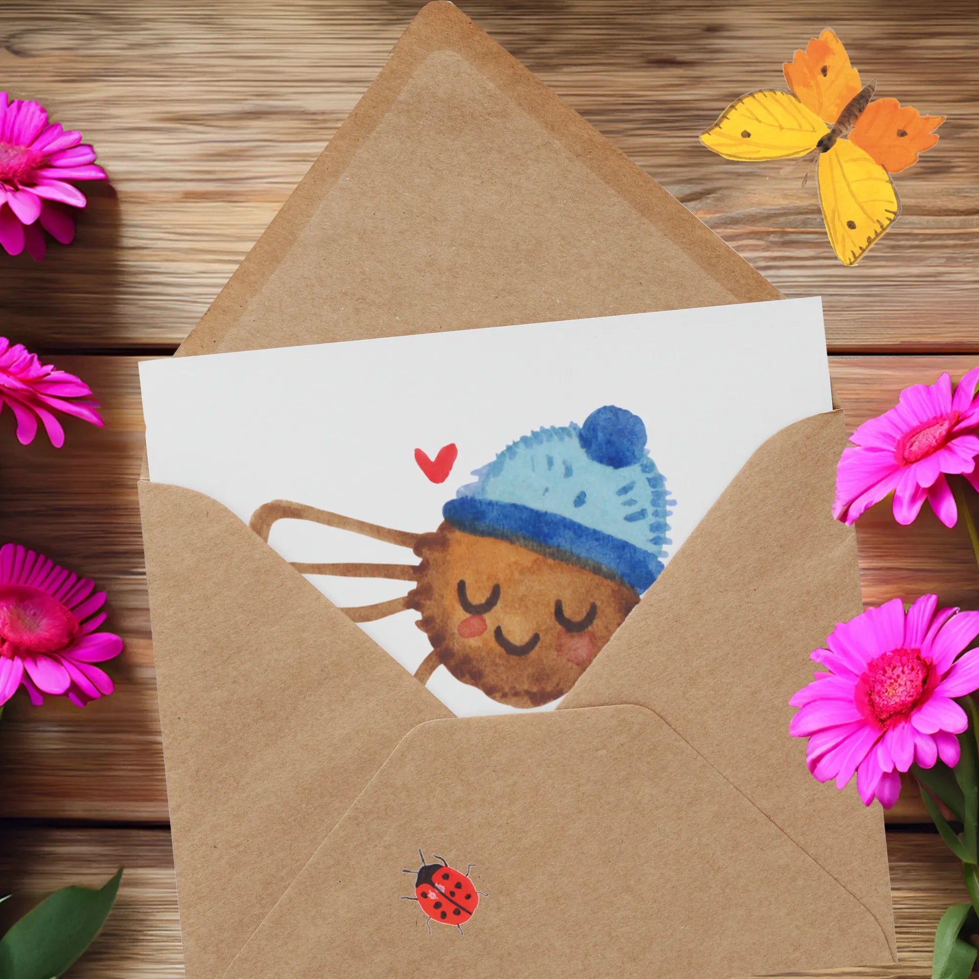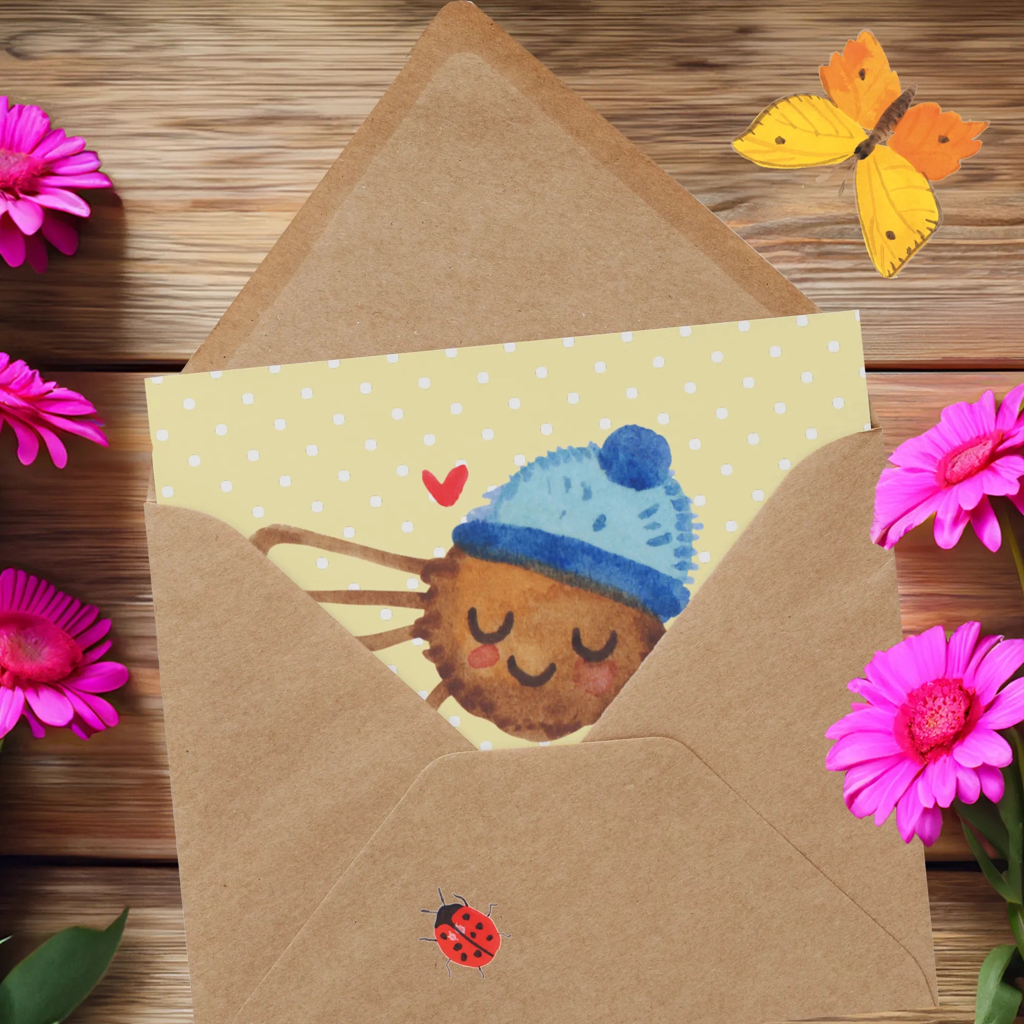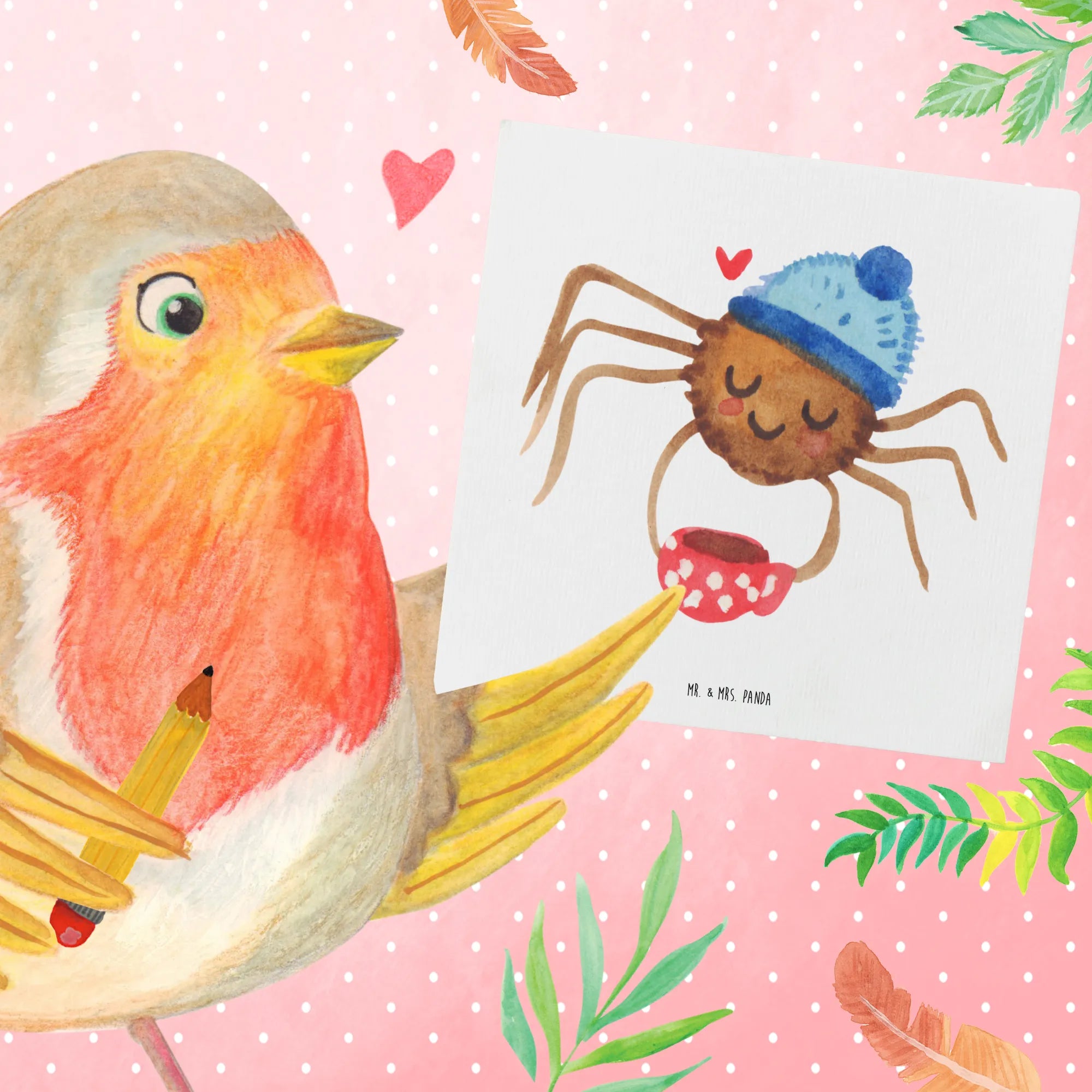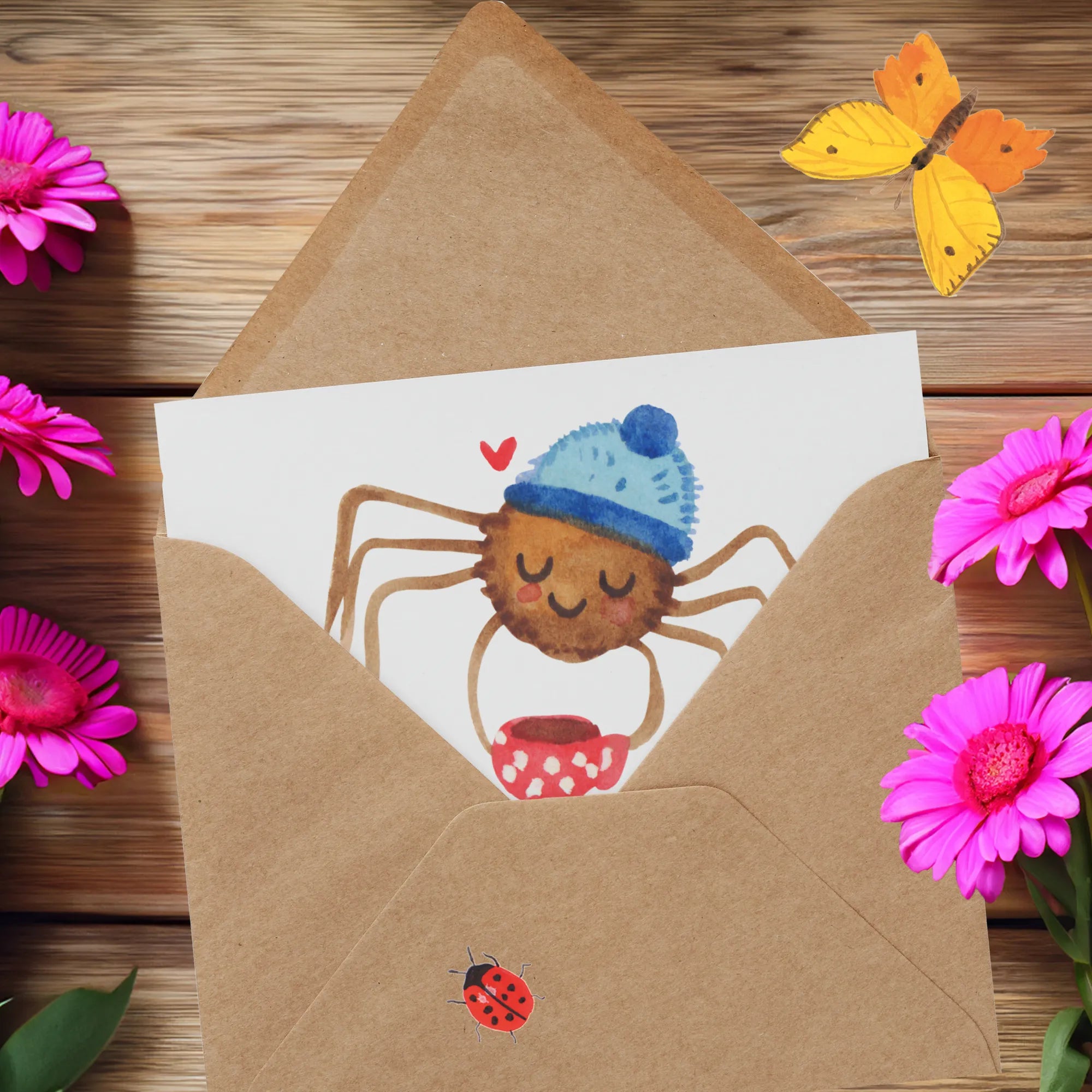 Mit einem charmanten Design, das die süße Spinne Agathe darstellt, die genüsslich ihren Kaffee trinkt, bringt diese Karte nicht nur ein Lächeln auf die Lippen, sondern auch eine wohlige Wärme ins Herz. Agathe ist behütet in einer Wollmütze, und das Herz neben ihr zeigt die Liebe, die in diesen kleinen Gesten steckt.