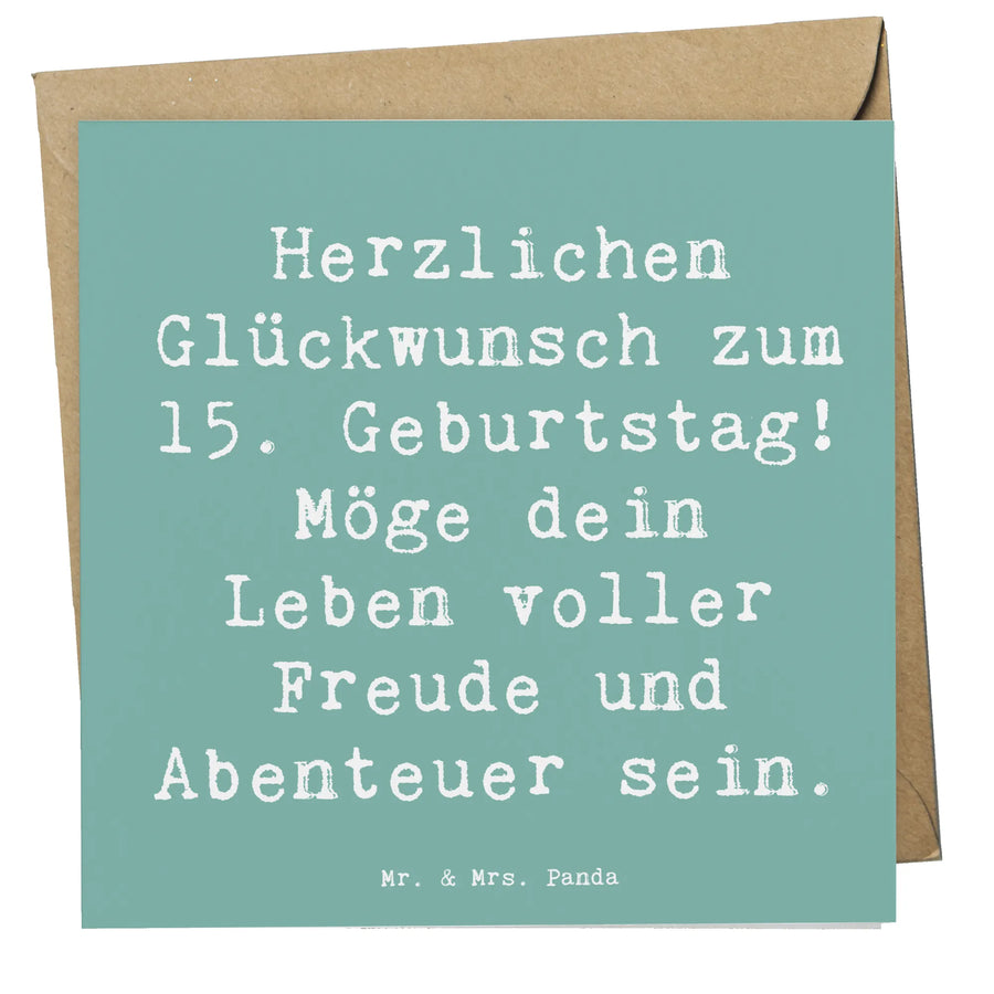 Wünscht Du jemandem alles Gute zum 15. Geburtstag? Dann ist die Deluxe Karte von Mr. & Mrs. Panda genau das Richtige für Dich! Diese wunderschöne und besonders hochwertige quadratische Karte kommt aus der speziellen Kollektion "Geburtstag Alter" und trägt den liebevollen Spruch "Herzlichen Glückwunsch zum 15. Geburtstag! Möge dein Leben voller Freude und Abenteuer sein." Sie wurde mit viel Liebe und Sorgfalt kreiert und ist die perfekte Wahl für den besonderen Tag eines Teenagers.