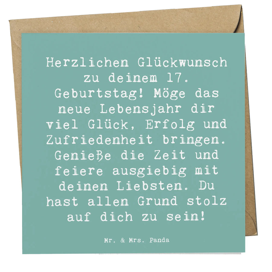 Die Deluxe Karte zum 17. Geburtstag von Mr. & Mrs. Panda ist das perfekte Geschenk für junge Erwachsene, die ihren Geburtstag gebührend feiern möchten. Mit einem liebevollen Spruch "Herzlichen Glückwunsch zu deinem 17. Geburtstag! Möge das neue Lebensjahr dir viel Glück, Erfolg und Zufriedenheit bringen. Genieße die Zeit und feiere ausgiebig mit deinen Liebsten. Du hast allen Grund stolz auf dich zu sein!" ist sie ideal für die Einladung zu einer Party oder als Glückwunschkarte.