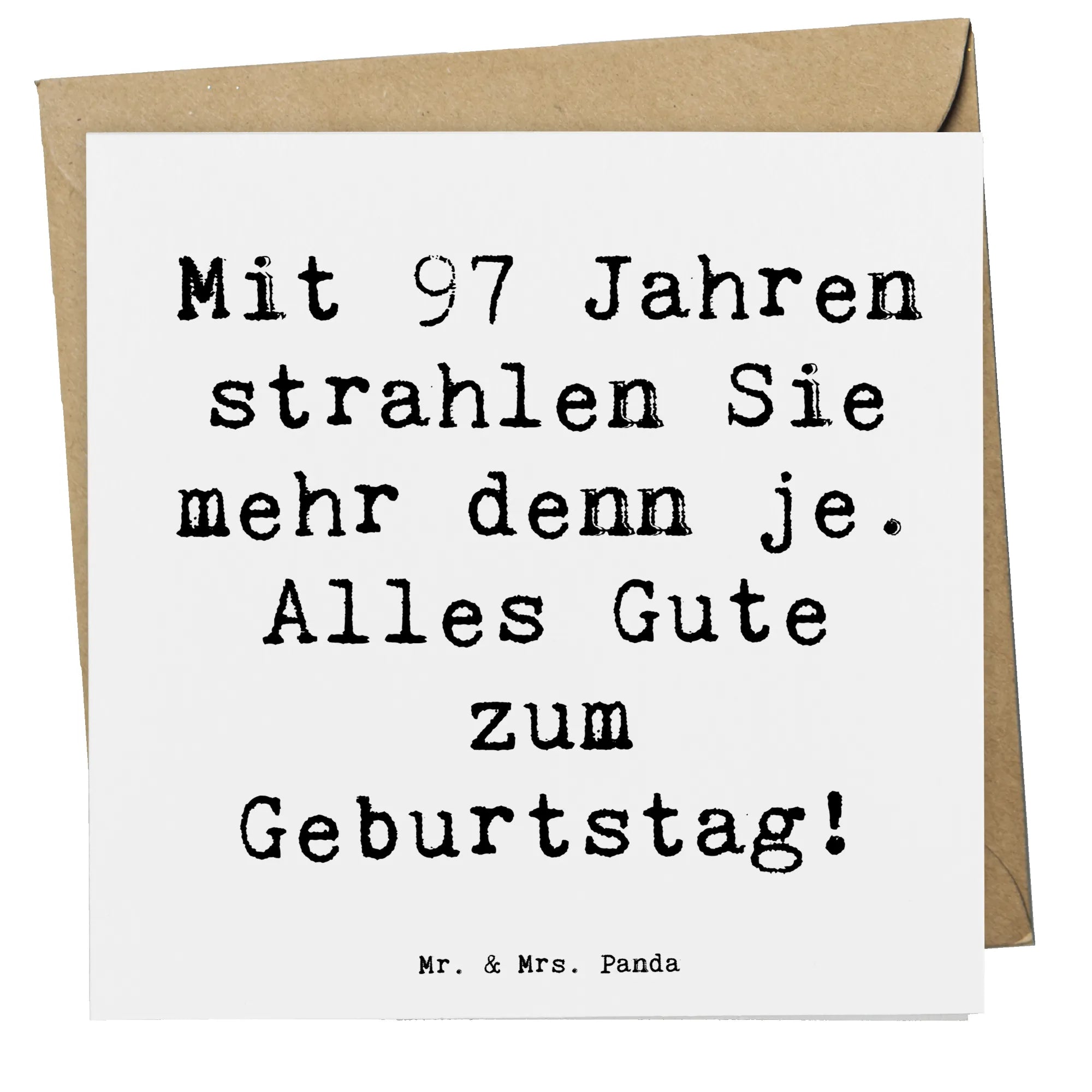 Sie ist ideal für all jene, die einen lieben Menschen zum Geburtstag gratulieren möchten und dabei auf etwas Besonderes setzen. Die Karte ist mit dem liebevollen Spruch "Mit 97 Jahren strahlen Sie mehr denn je. Alles Gute zum Geburtstag!" versehen und lädt ein, die Freude und den Lebensmut des Geburtstagskindes zu feiern.