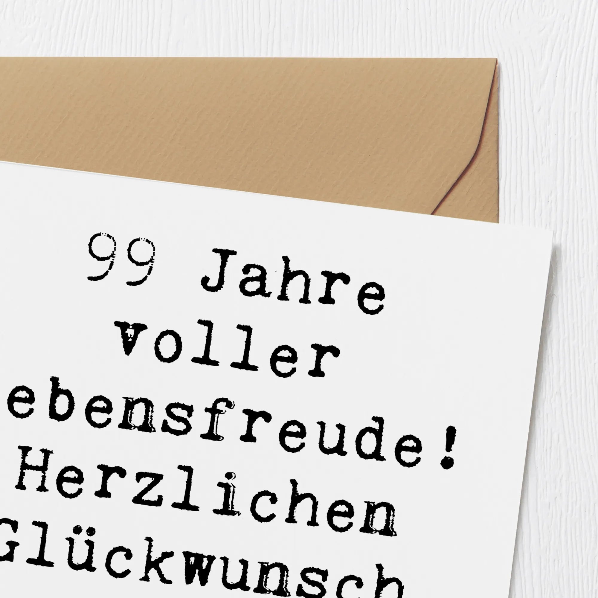 Hergestellt aus edlem 300 Gramm Karton, besticht sie durch ihre hochglänzend veredelte Vorder- und Rückseite, während die matte Innenseite das persönliche Beschriften einfach macht. Das liebevoll gestaltete Motiv mit dem Spruch '99 Jahre voller Lebensfreude! Herzlichen Glückwunsch zum Geburtstag!' bringt Freude und gute Laune in jedes Geburtstagsfest.