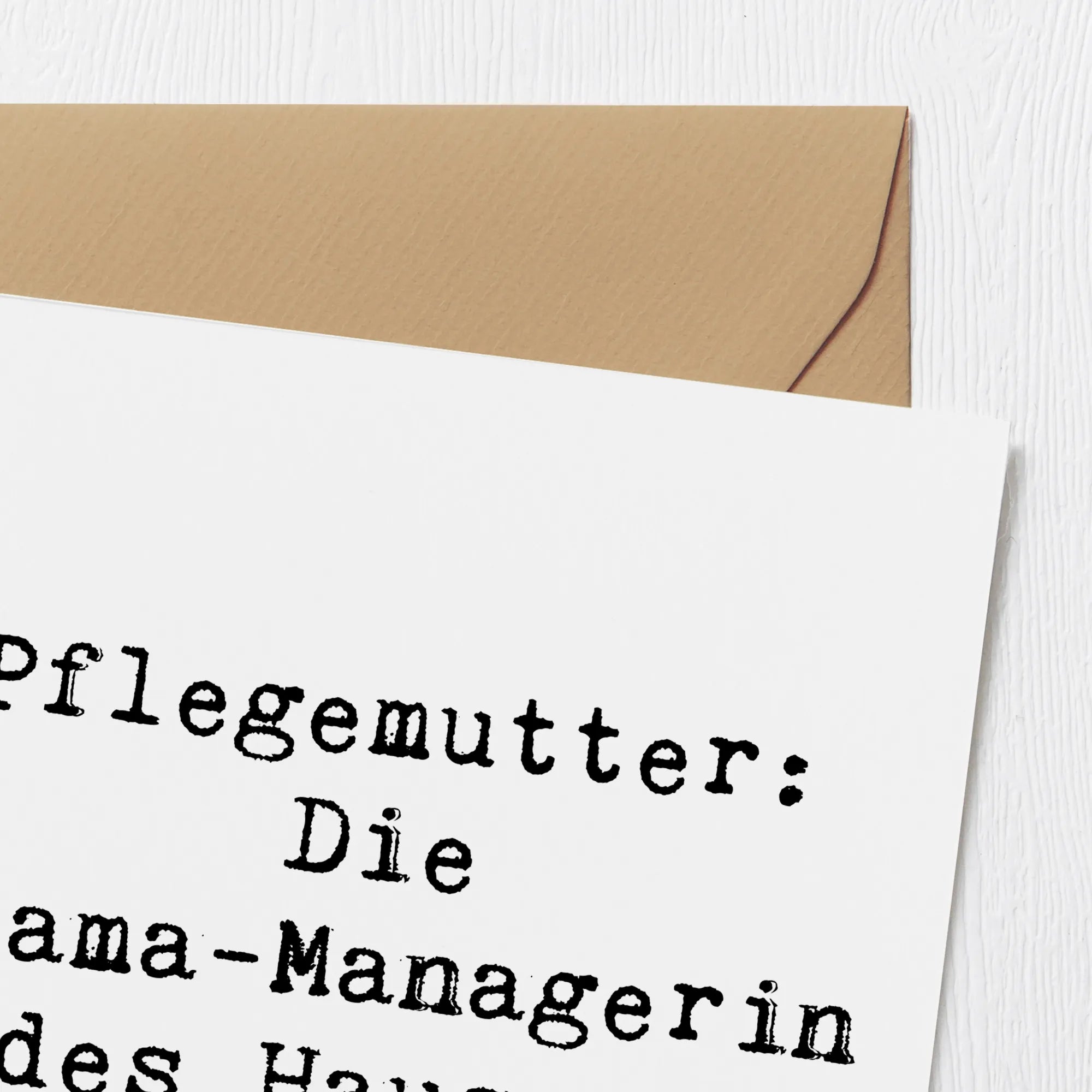Und genau das würdigen wir mit dieser liebevoll gestalteten Karte. Die Karte ist nicht nur schick, sondern auch aus hochwertigem 300 Gramm Karton hergestellt, was ihr eine besondere Note verleiht. Die Vorderseite ist hochglänzend veredelt und zeigt den liebevollen Spruch: 'Pflegemutter: Die Drama-Managerin des Hauses.'