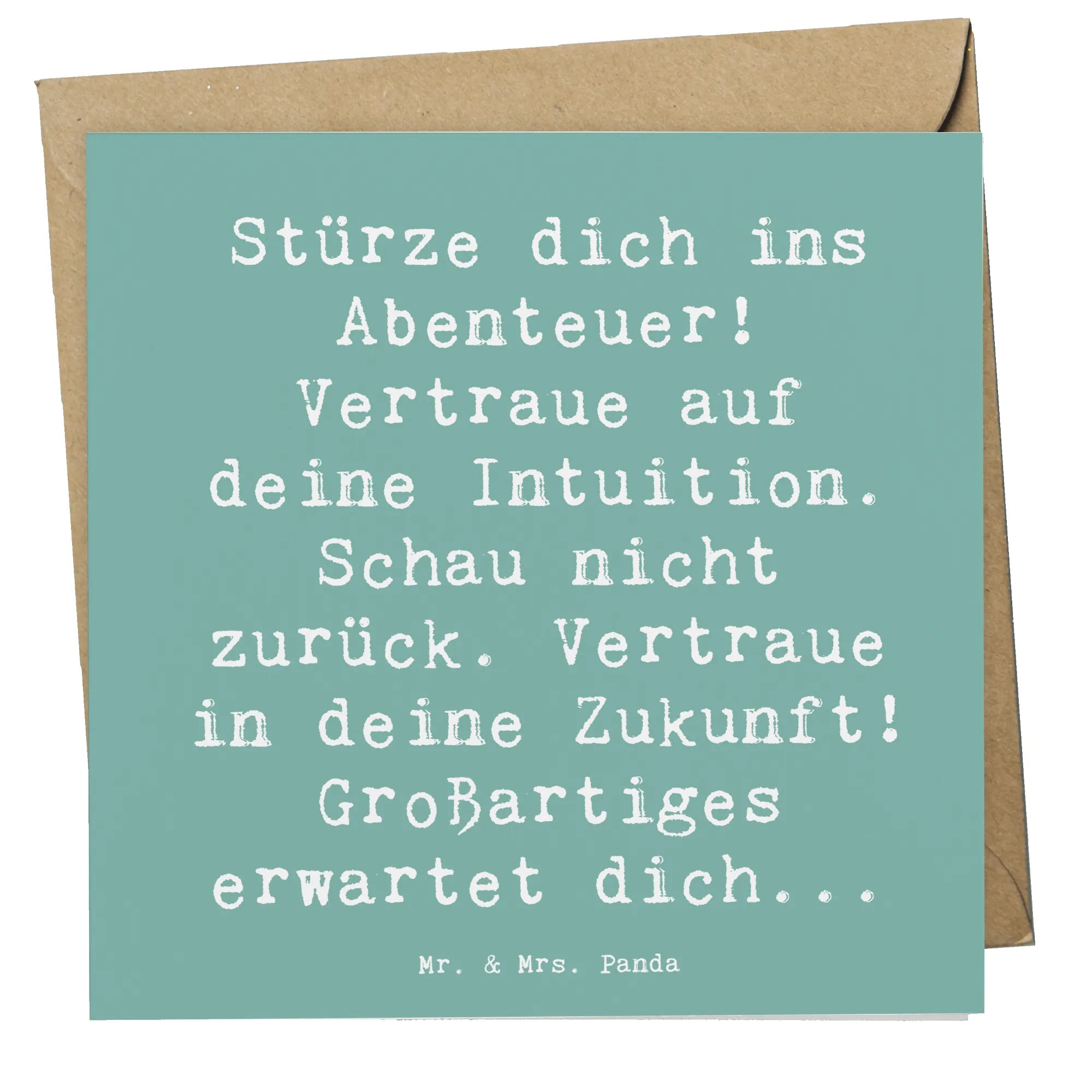 Die Karte misst 140 mm x 140 mm und wird aus hochwertigem 300 Gramm Karton hergestellt, der dank seines matt-glänzenden Drucks einen besonderen edlen Look erhält. Auf der Vorderseite prangt der kraftvolle Spruch: "Stürze dich ins Abenteuer! Vertraue auf deine Intuition. Schau nicht zurück. Vertraue in deine Zukunft! Großartiges erwartet dich...". Damit ist diese Karte das perfekte Geschenk oder eine Grußkarte für jemanden, der eine Portion Mut braucht, sei es zu einem Geburtstag, einer Hochzeit, einem Jubiläum oder beim Abschied.