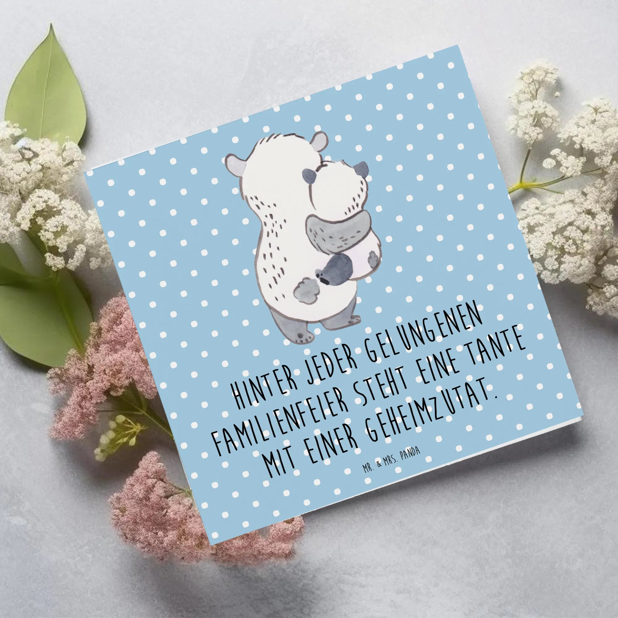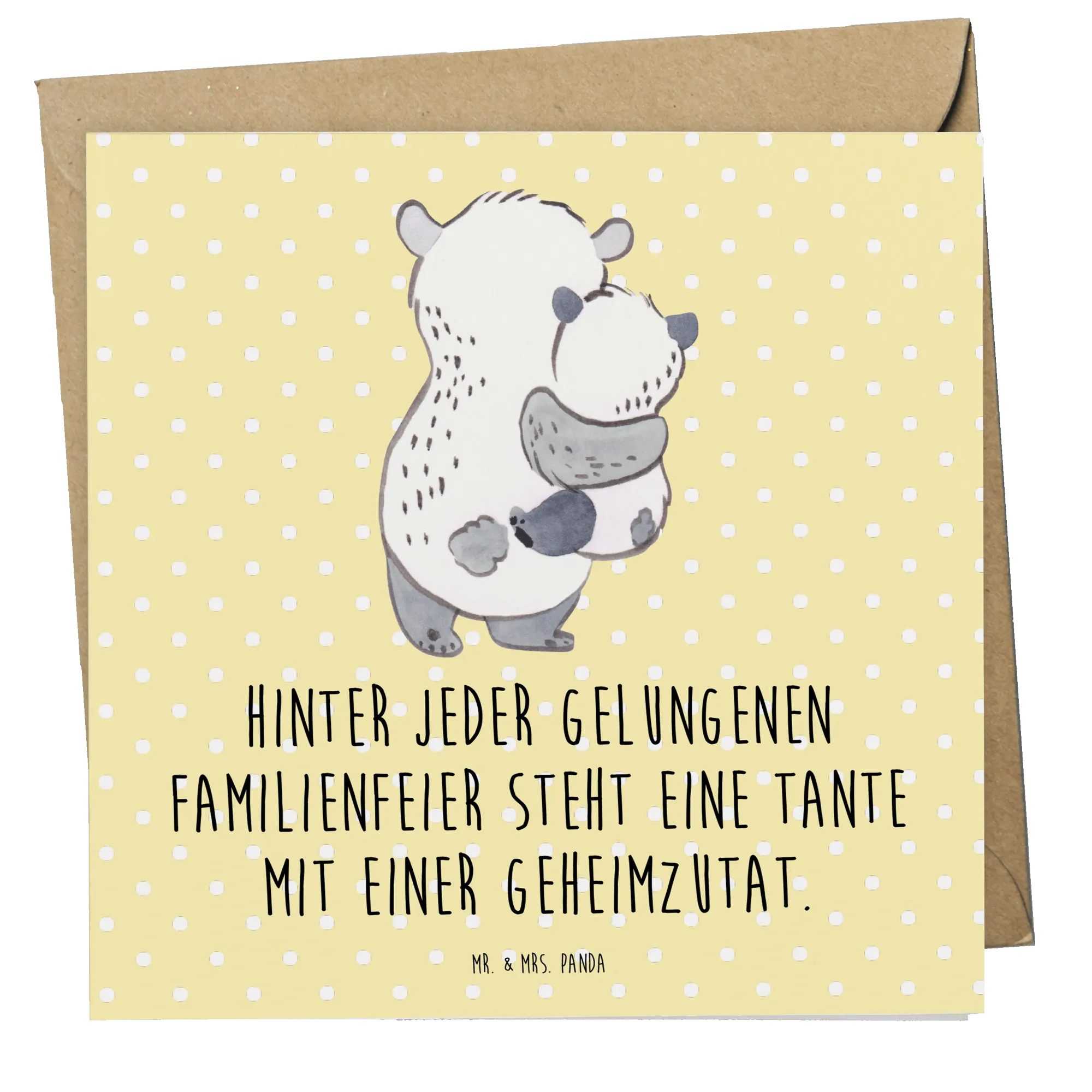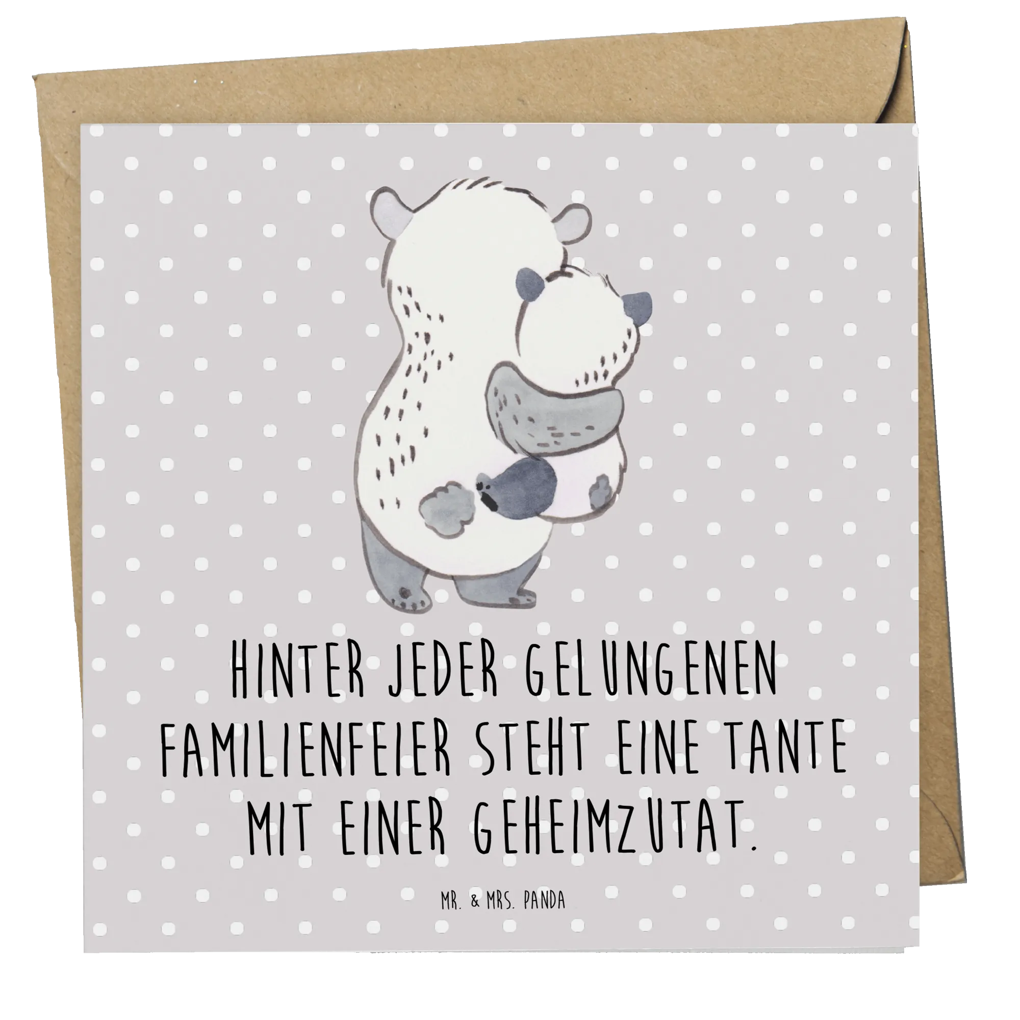 Die Deluxe Karte mit dem liebevollen Motiv "Tante" aus der Kollektion "Familie & Verwandte" von Mr. & Mrs. Panda ist das perfekte Geschenk für jeden Anlass. Ob Geburtstag, Hochzeit oder einfach so, diese wunderschöne und besonders hochwertige quadratische Karte ist ideal, um besondere Grüße oder Glückwünsche an deine Tante zu senden. Mit einem liebevoll gestalteten Spruch auf der Vorderseite, der lauten soll: 'Hinter jeder gelungenen Familienfeier steht eine Tante mit einer Geheimzutat.' wird jeder Anlass zu etwas Besonderem.
